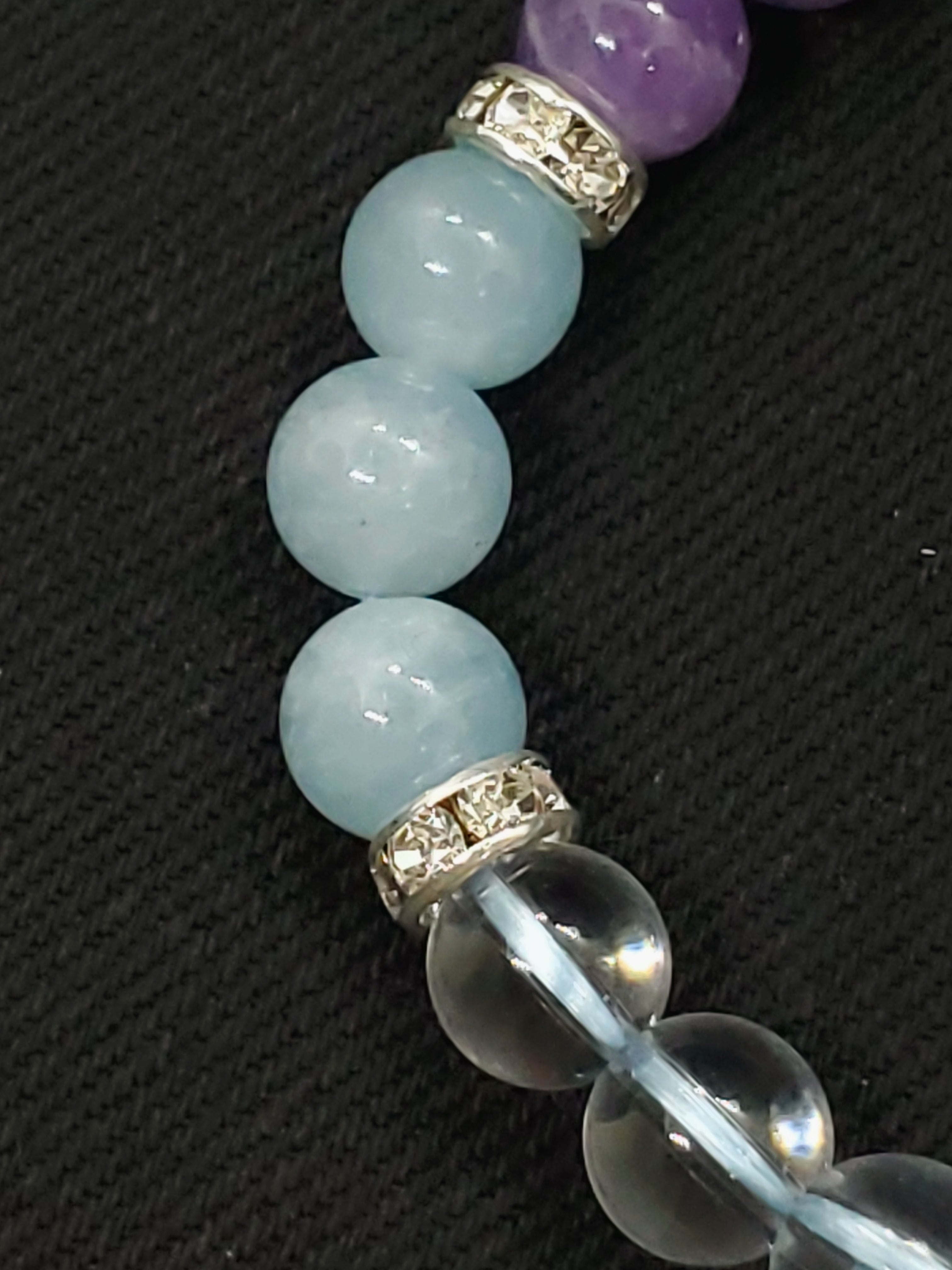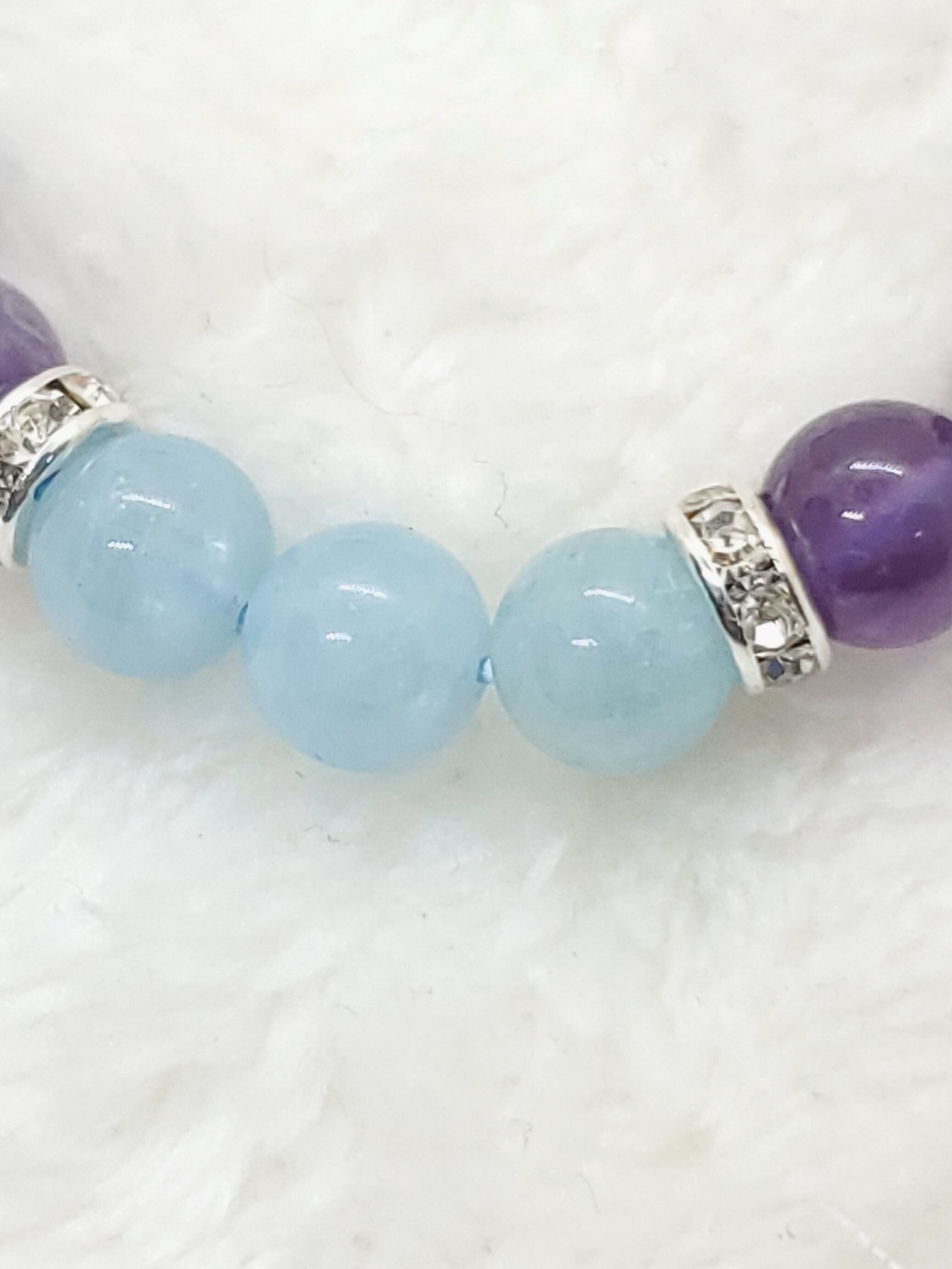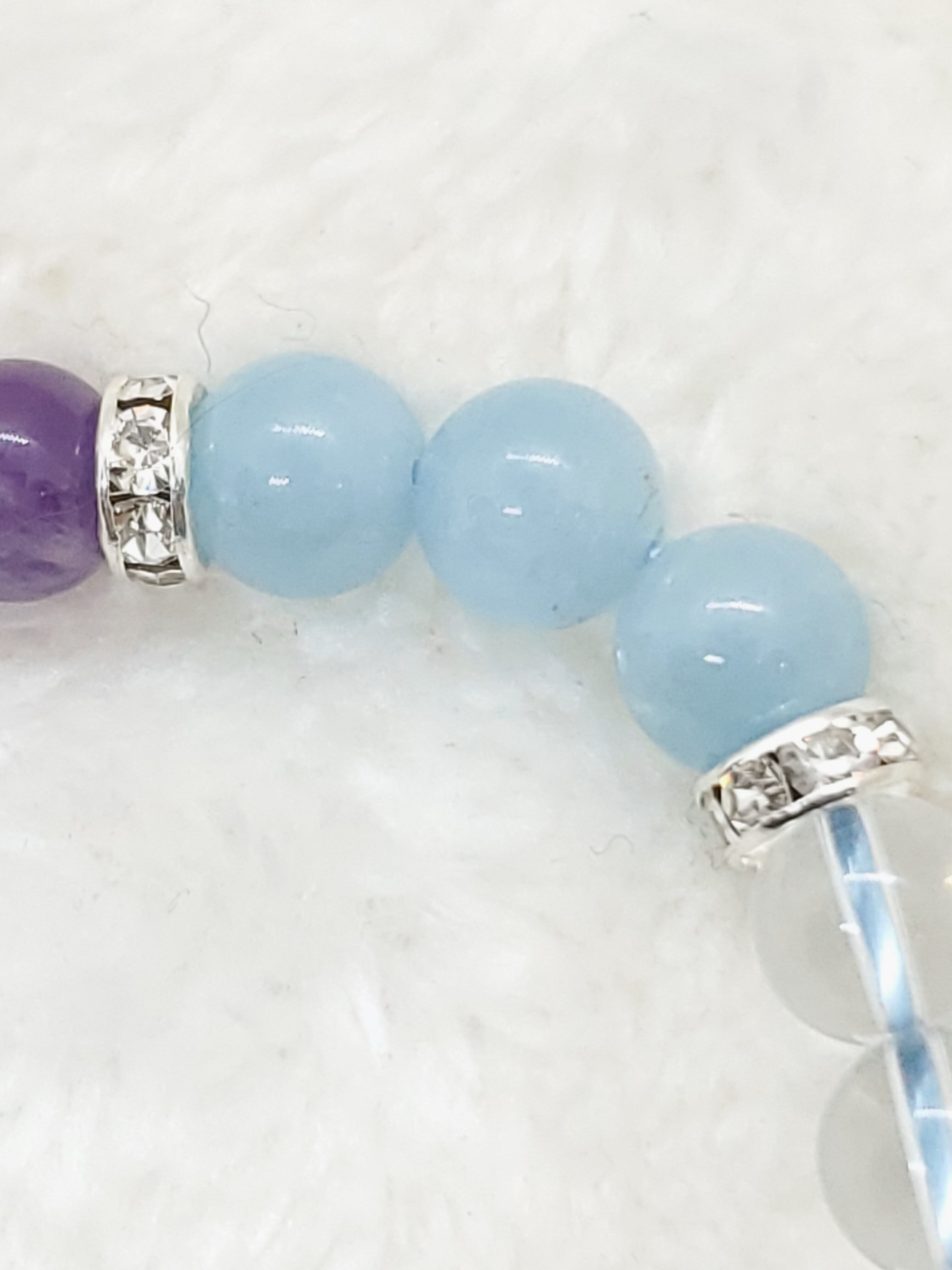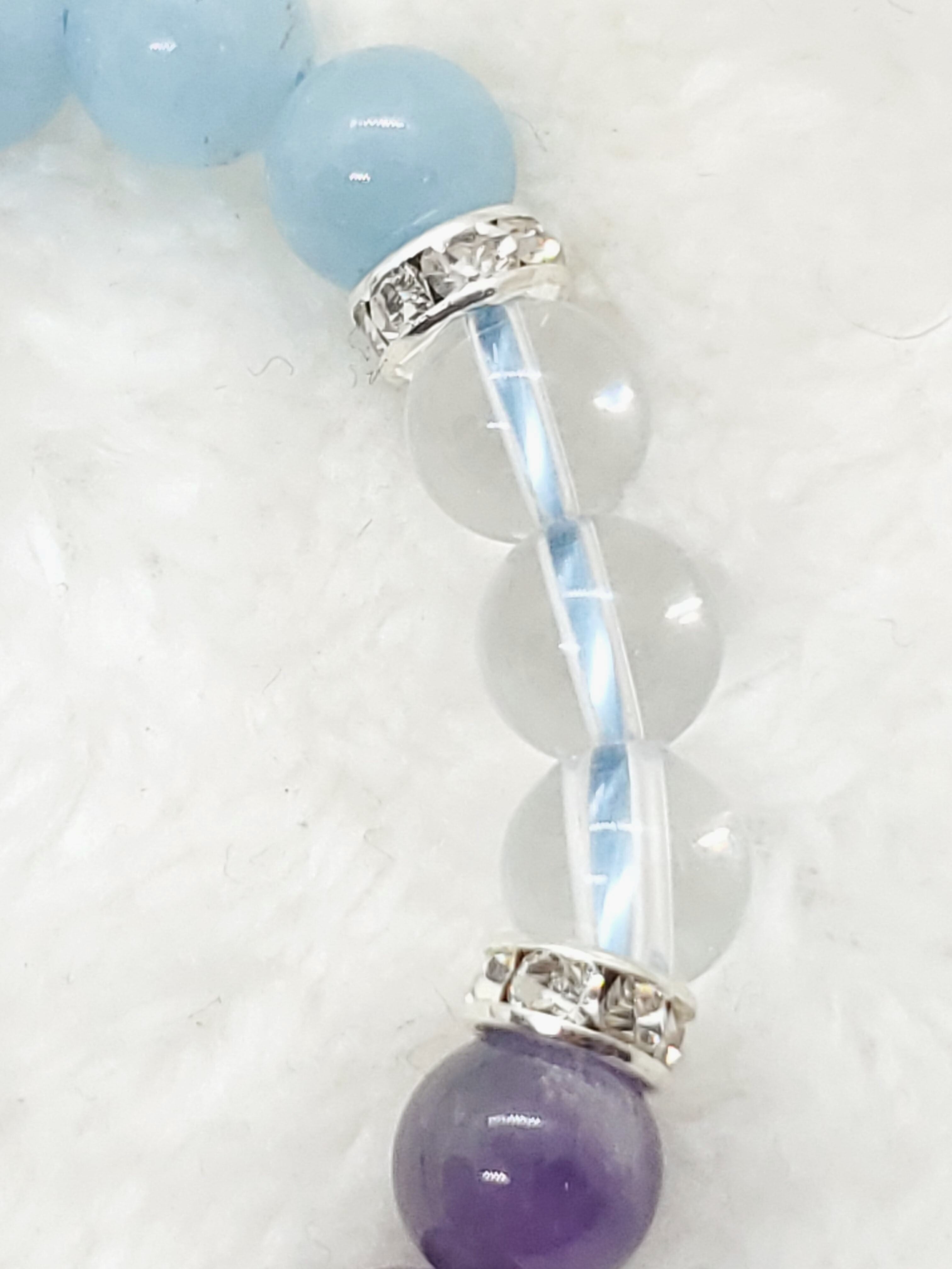 アクアマリンは、エメラルド、モルガナイトと並ぶ「ベリル」の一種で、ヒーリング効果や、水害から身を守ってくれたり、柔軟な心を守るといわれています。