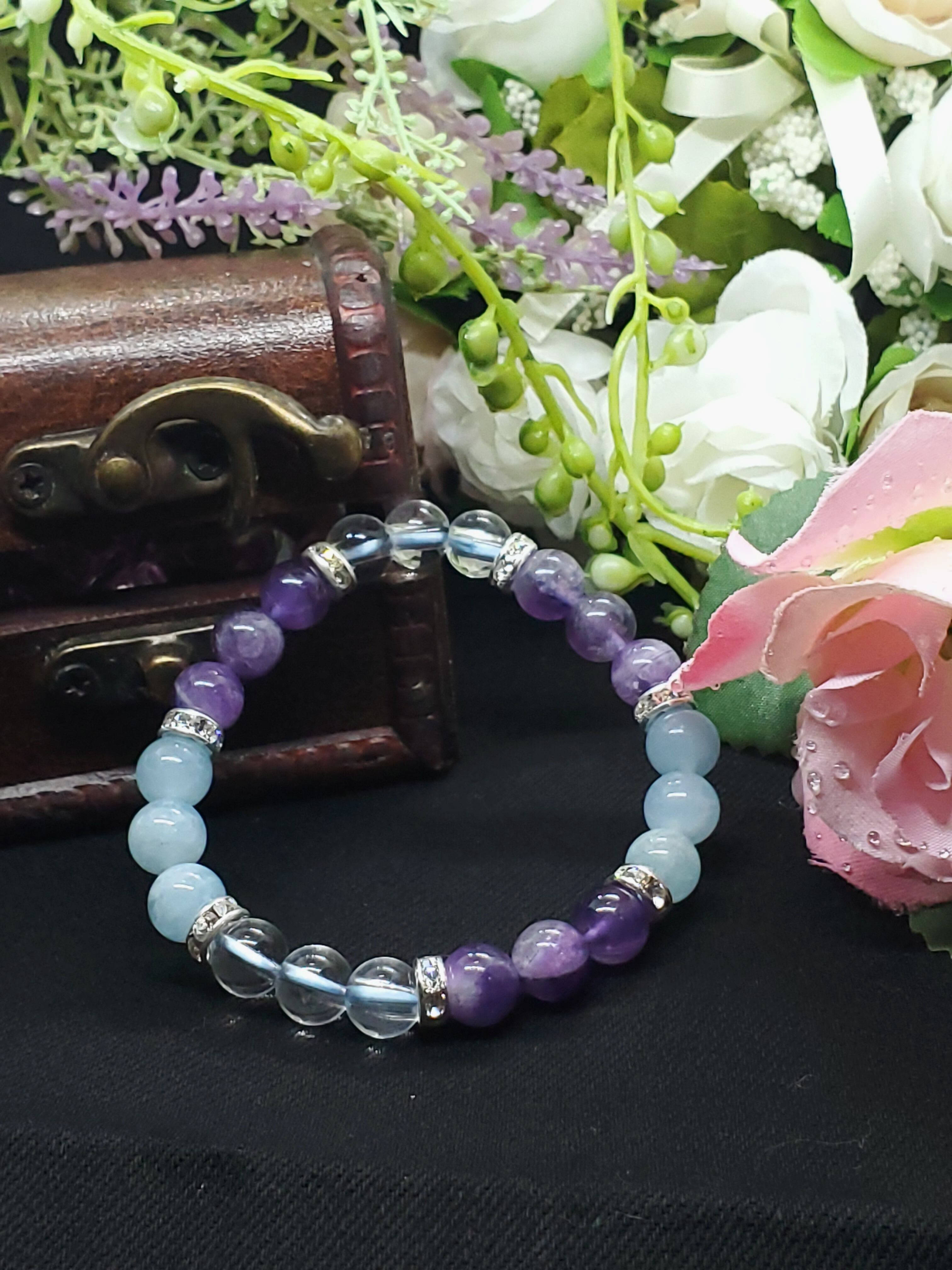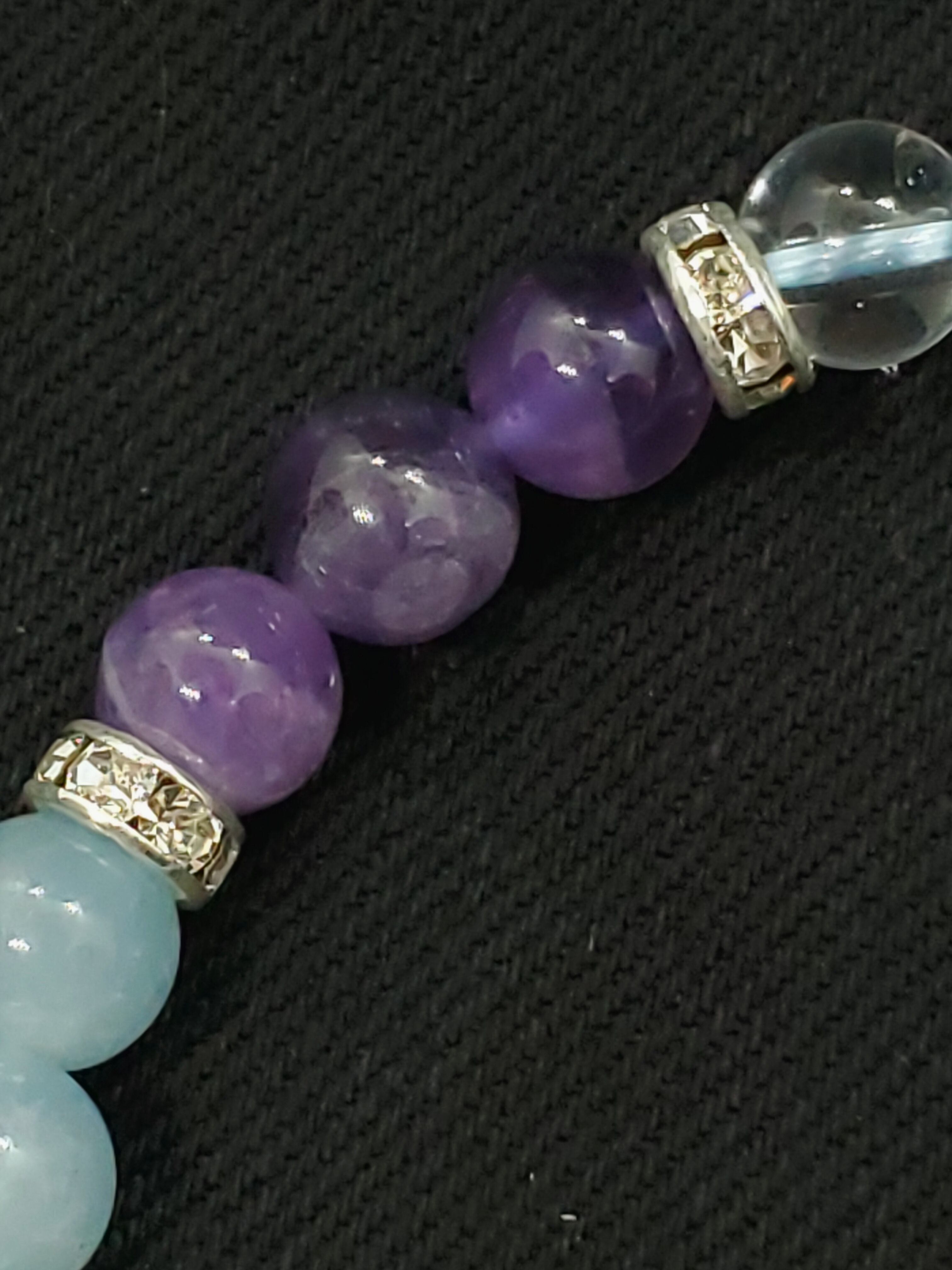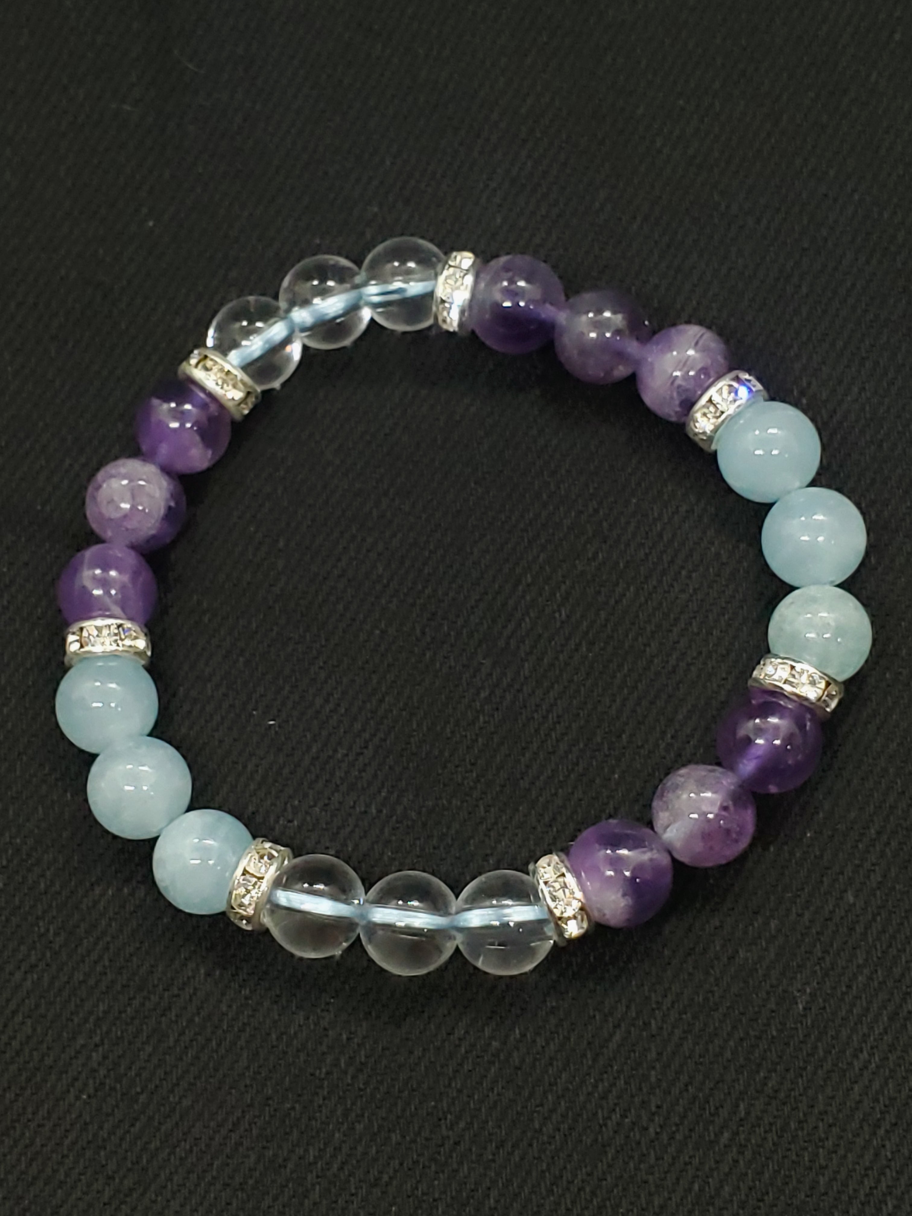 アクアマリンは、エメラルド、モルガナイトと並ぶ「ベリル」の一種で、ヒーリング効果や、水害から身を守ってくれたり、柔軟な心を守るといわれています。