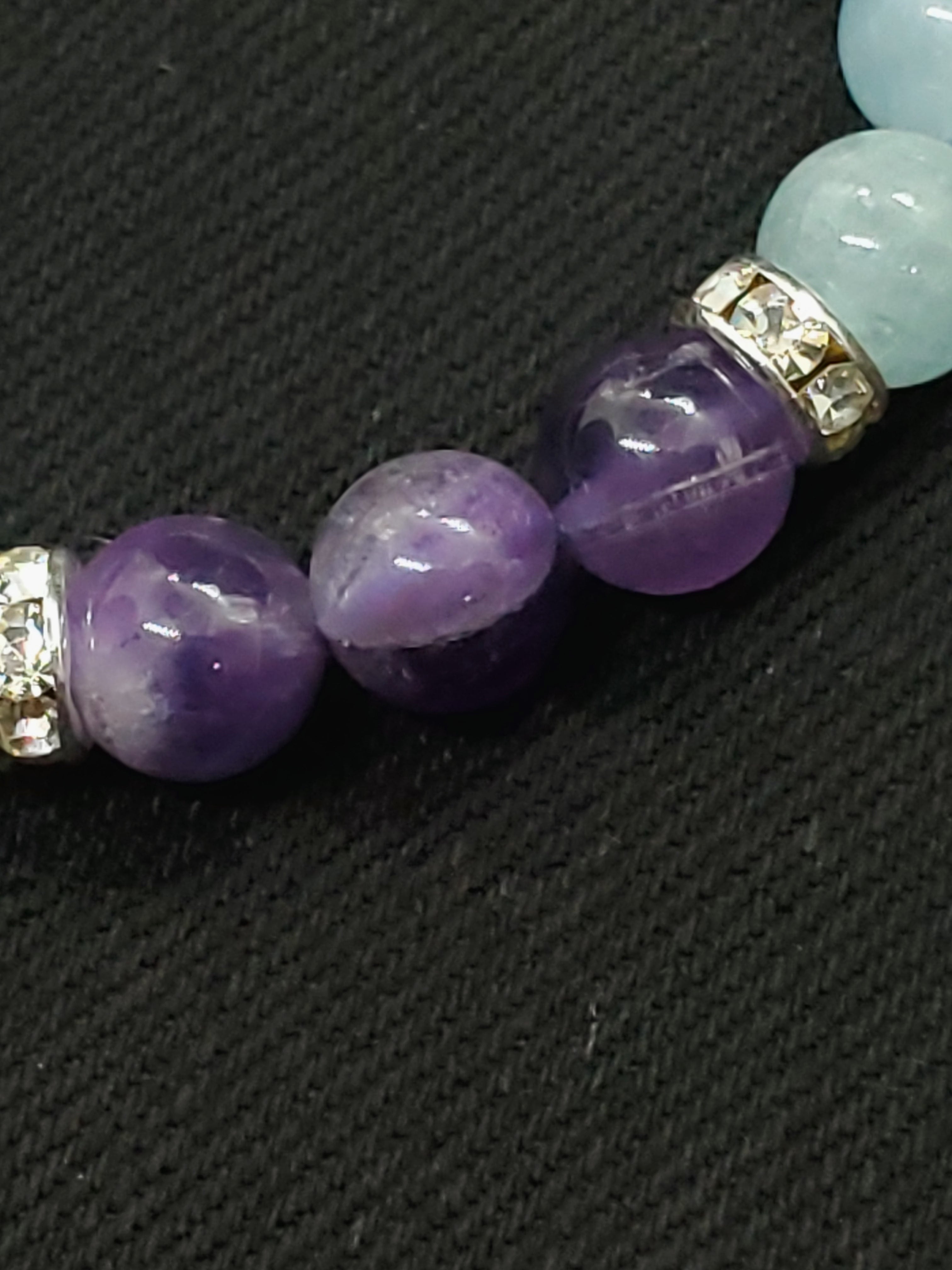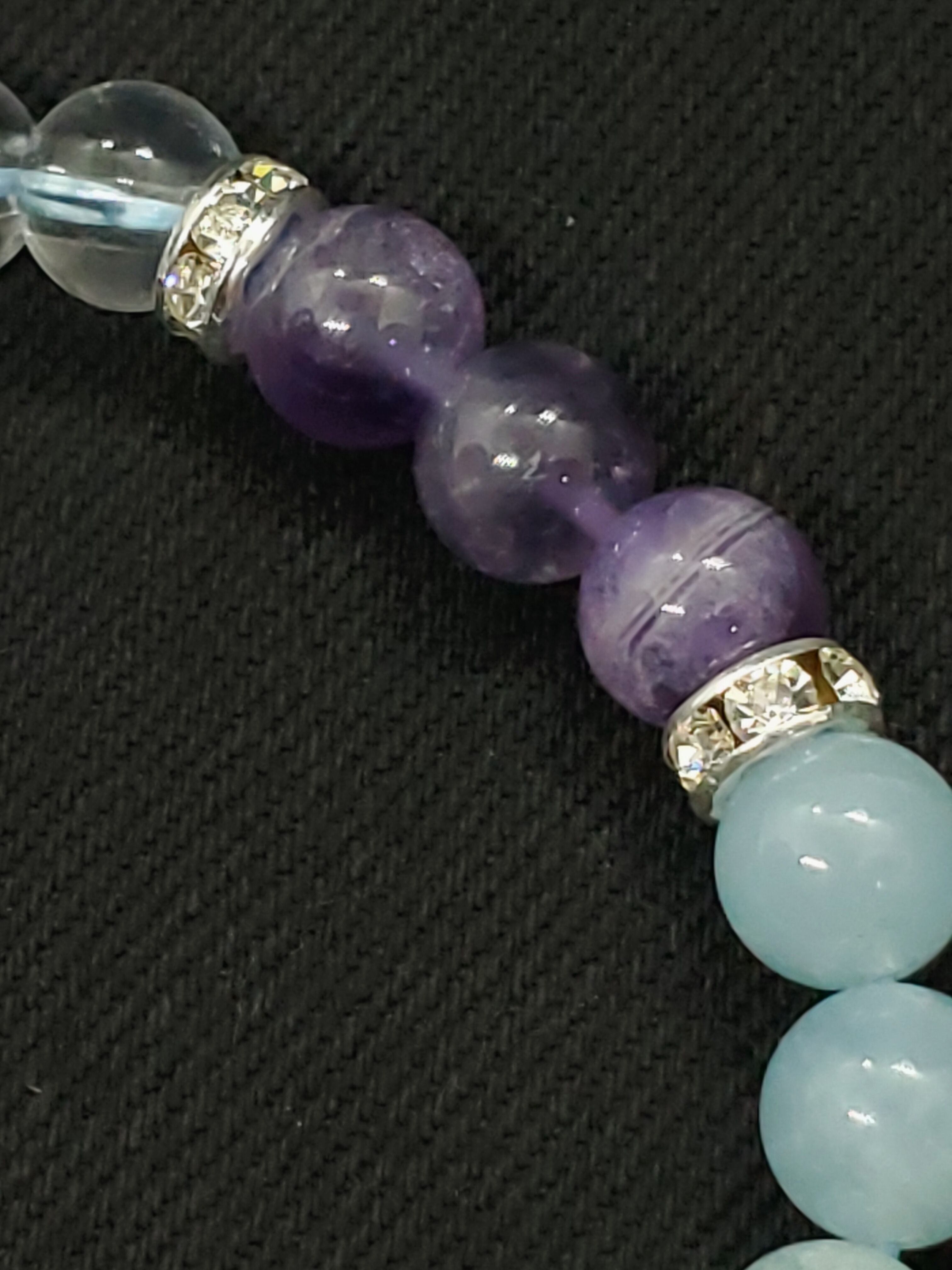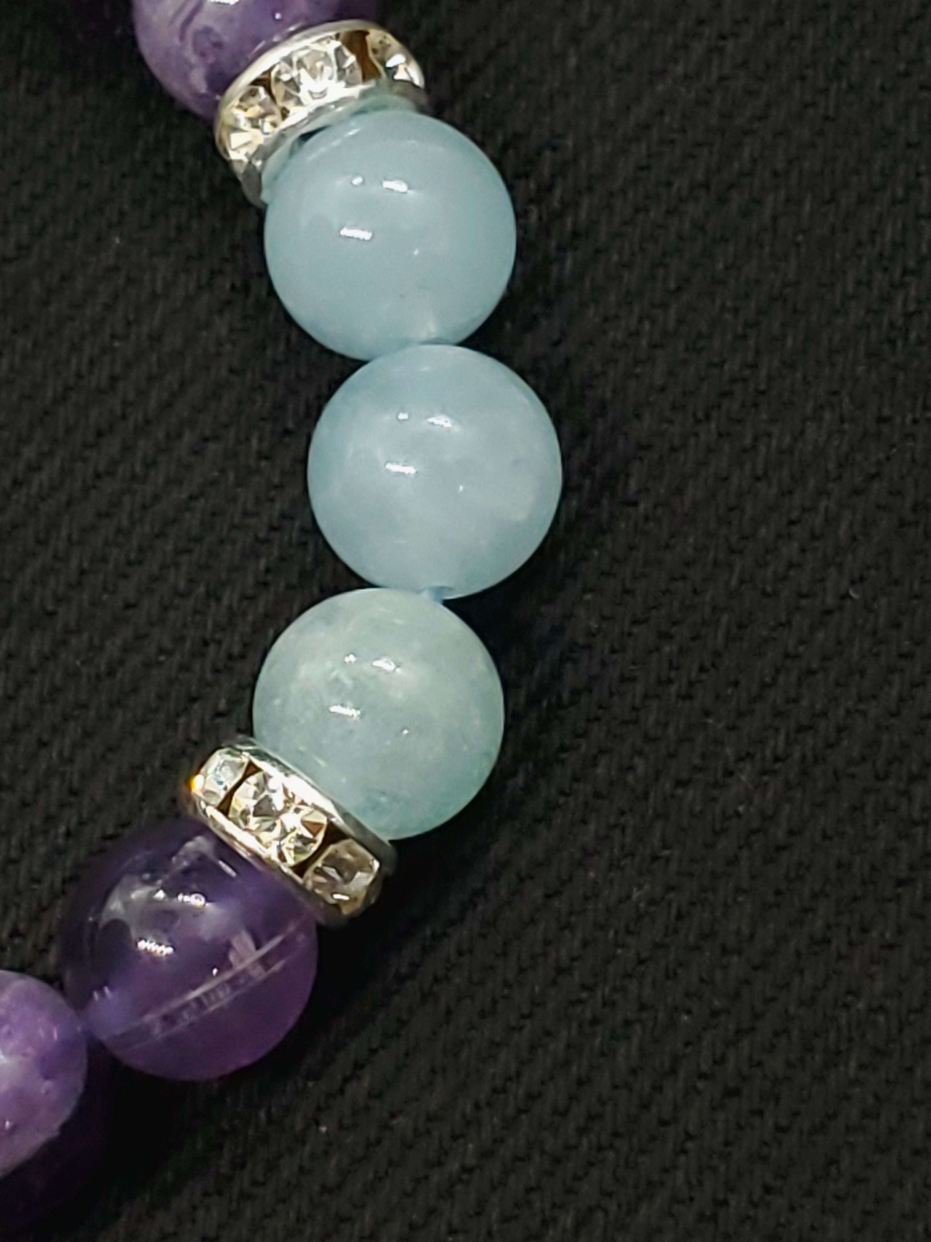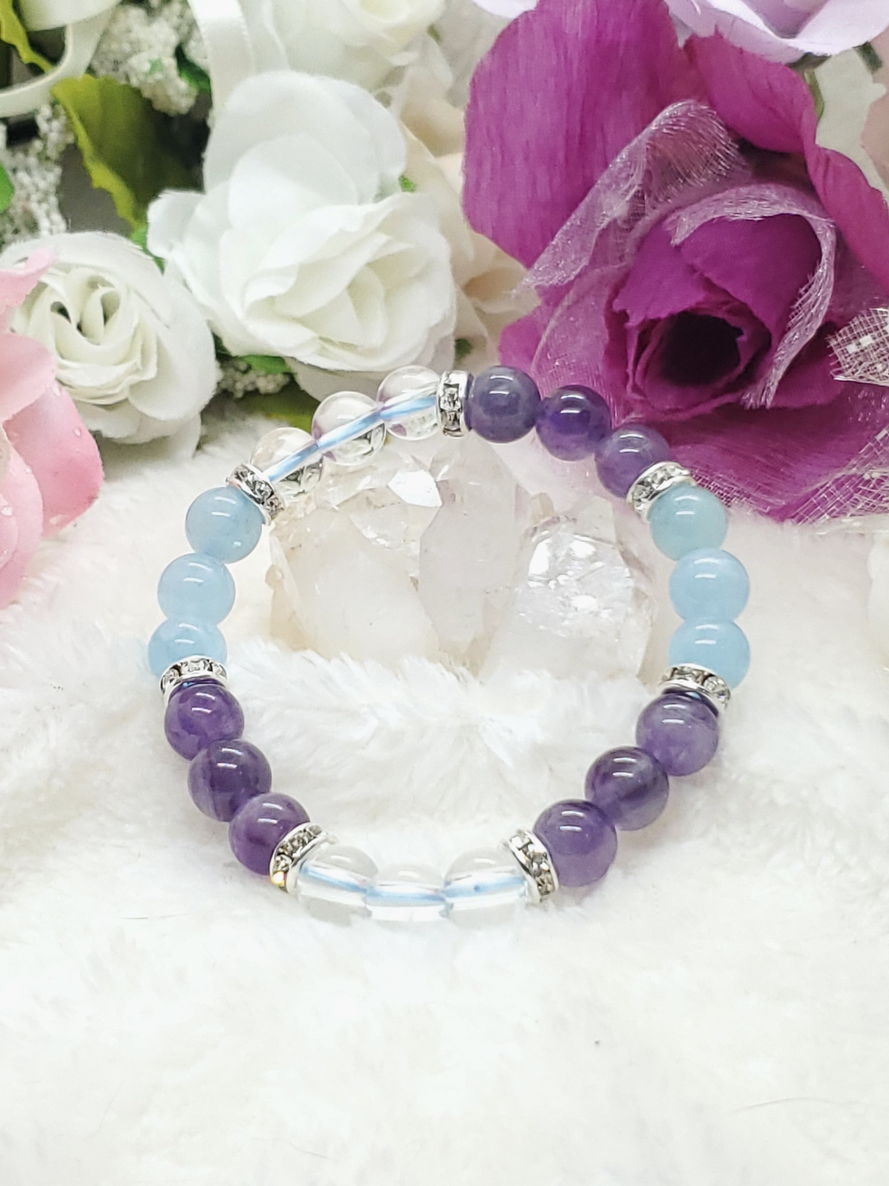 アクアマリンは、エメラルド、モルガナイトと並ぶ「ベリル」の一種で、ヒーリング効果や、水害から身を守ってくれたり、柔軟な心を守るといわれています。