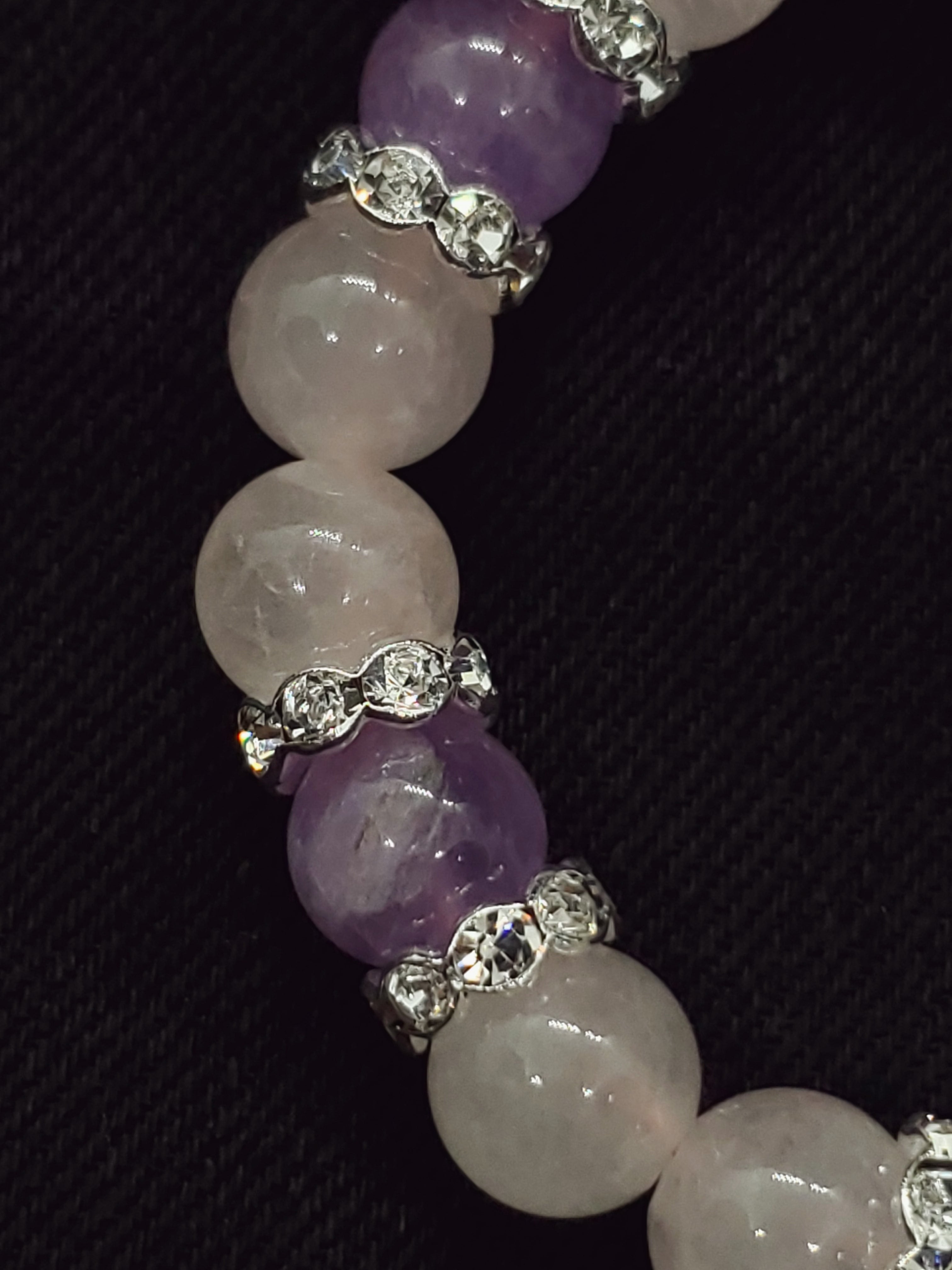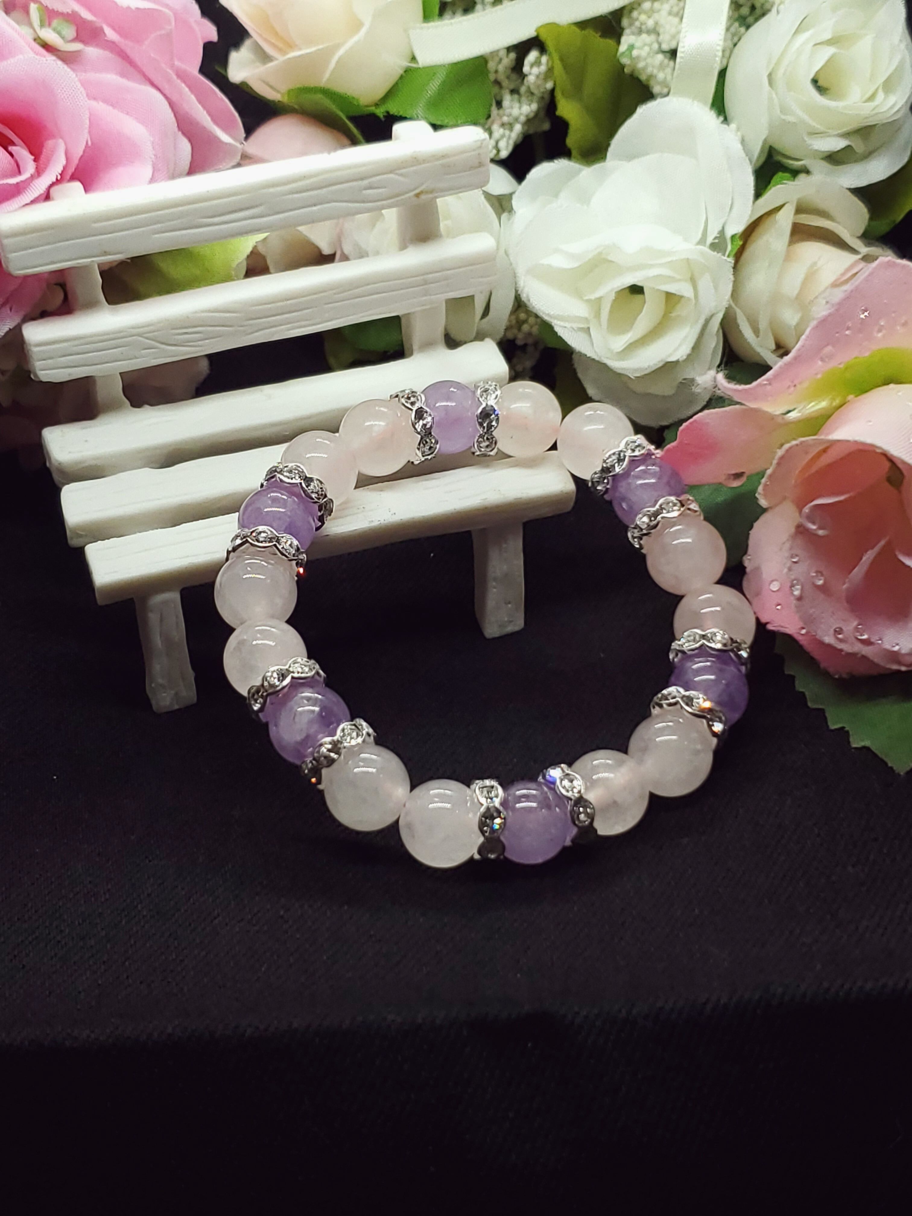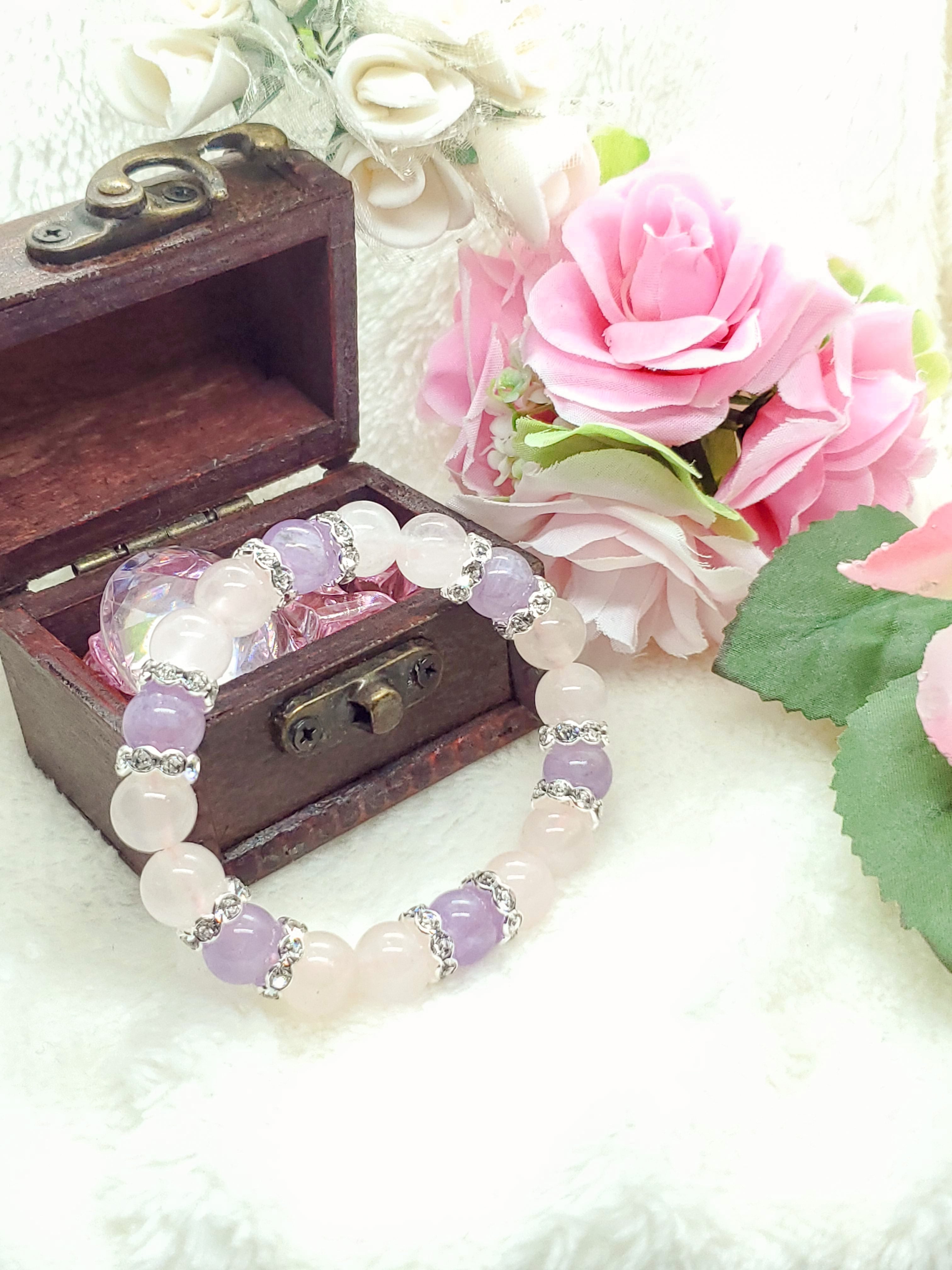 ラベンダーカラーのかわいらしい色合いのアメジストと、薄いピンク色のローズクォーツの組み合わせです。