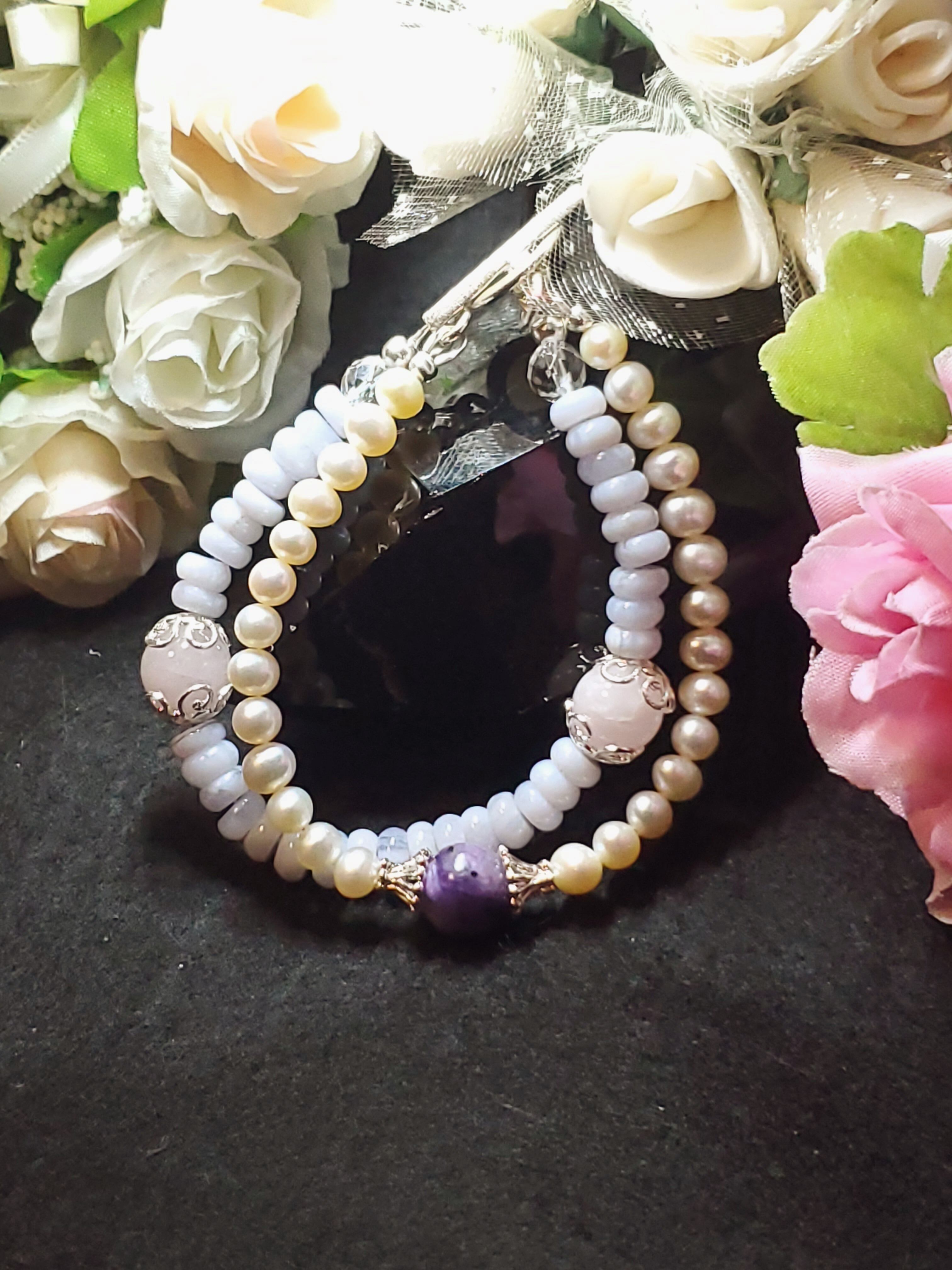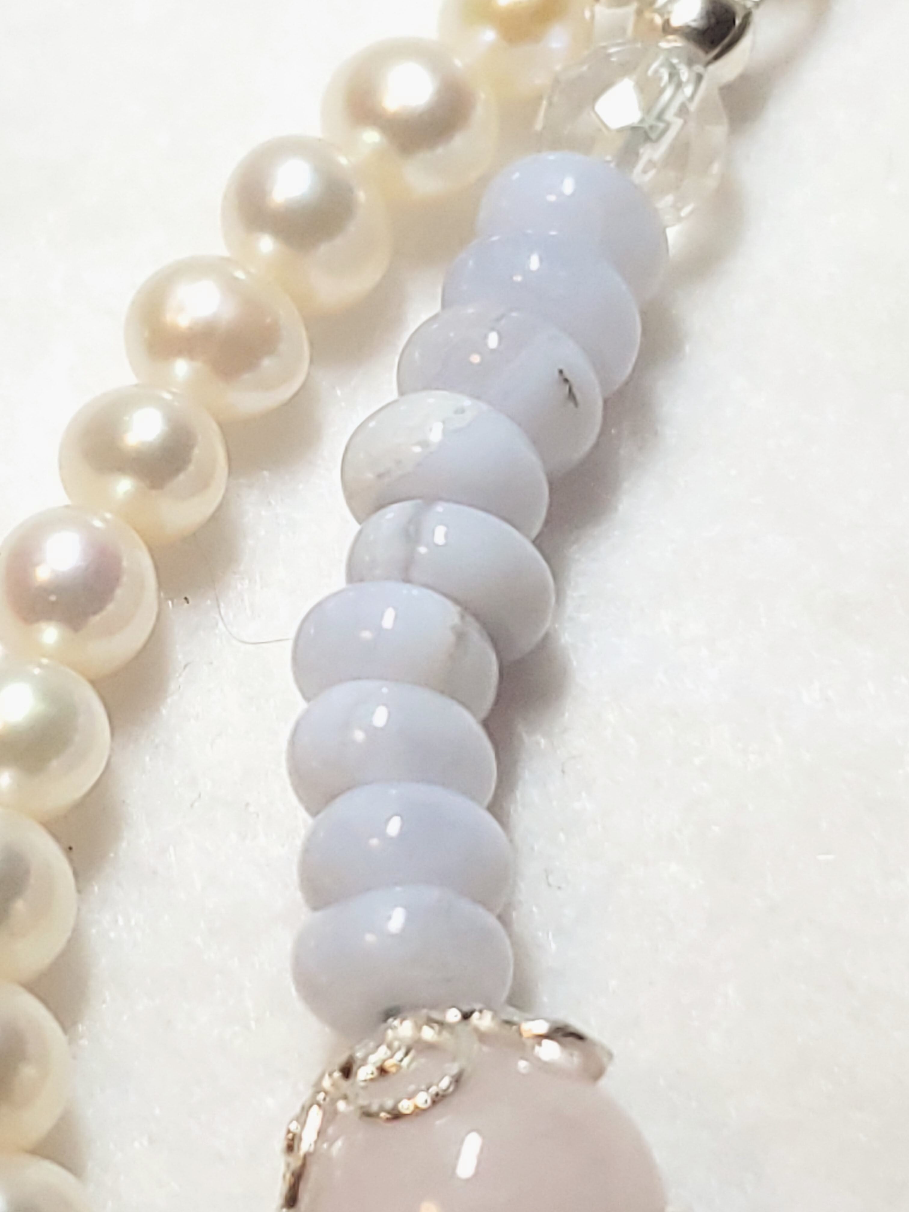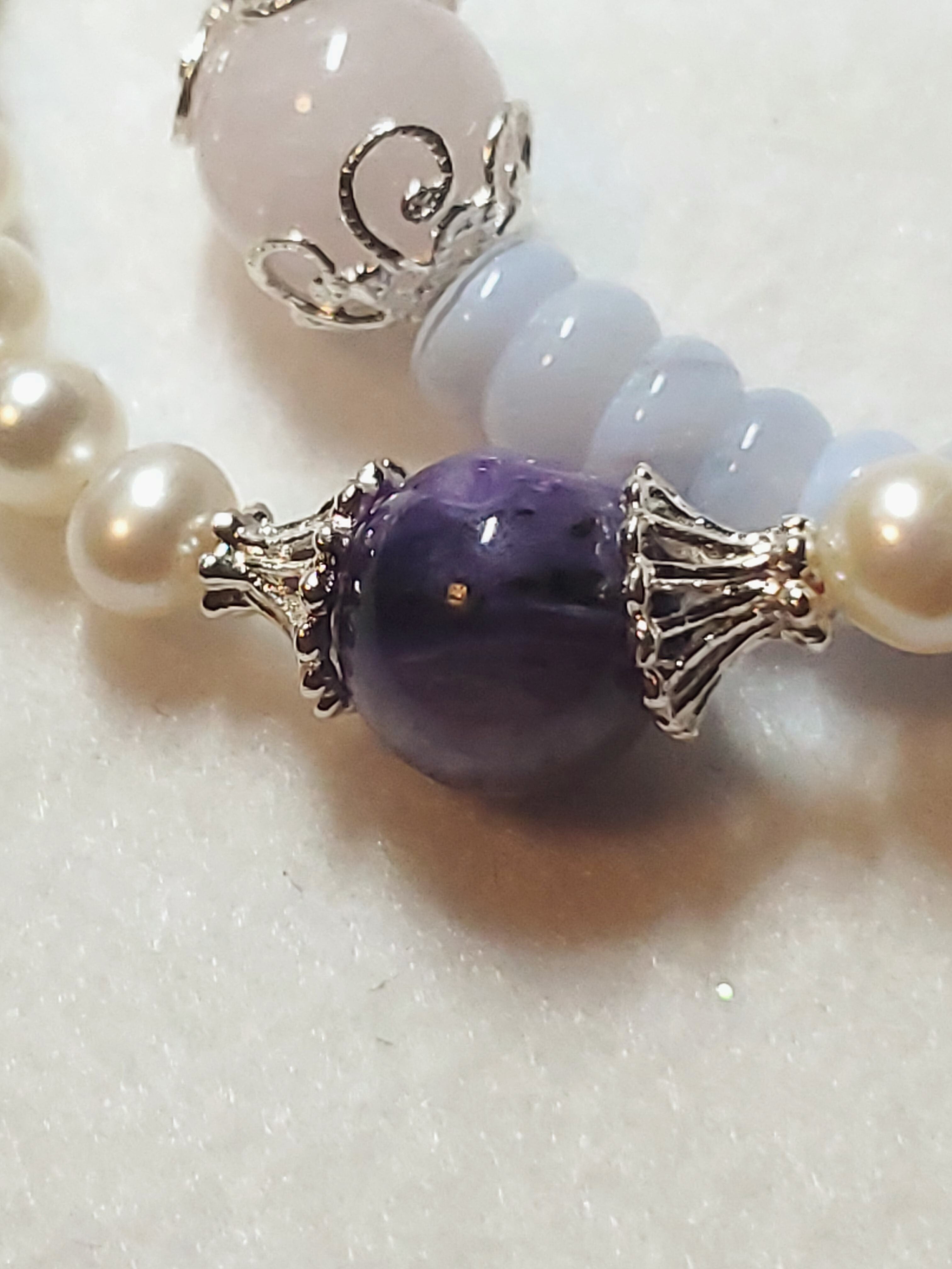 パワーストーン界では、チャロアイトは先にも述べた通りのヒーリングストーンです。心を癒し、洞察力を高め、心身を正常に保ちます。モルガナイトは幸せな結婚や、精神の調和、平穏などで、淡水パールは女性の美と健康を象徴しています。ブルーレースアゲートは、協調性やコミュニケーションなどの意味を持ちます。