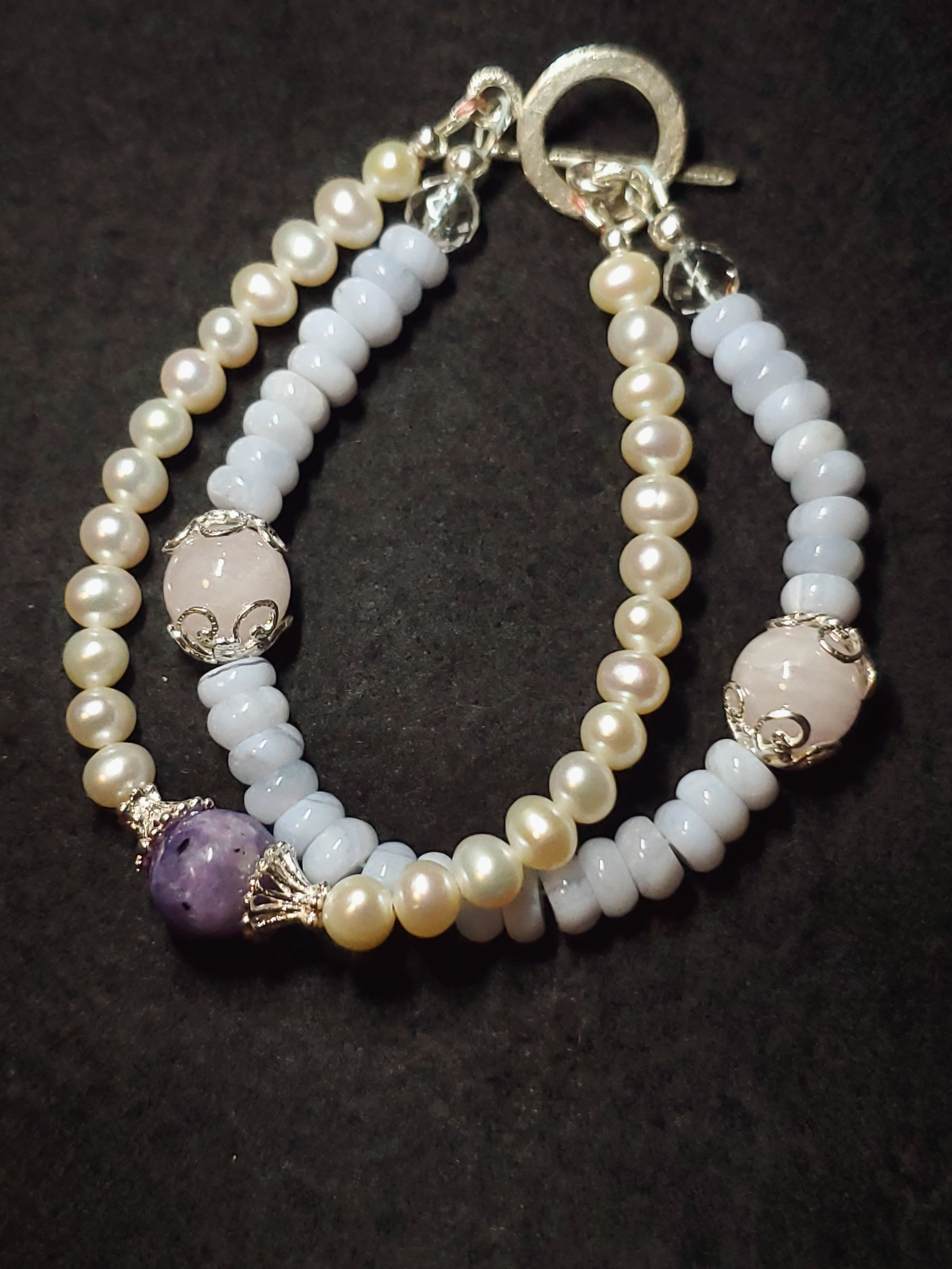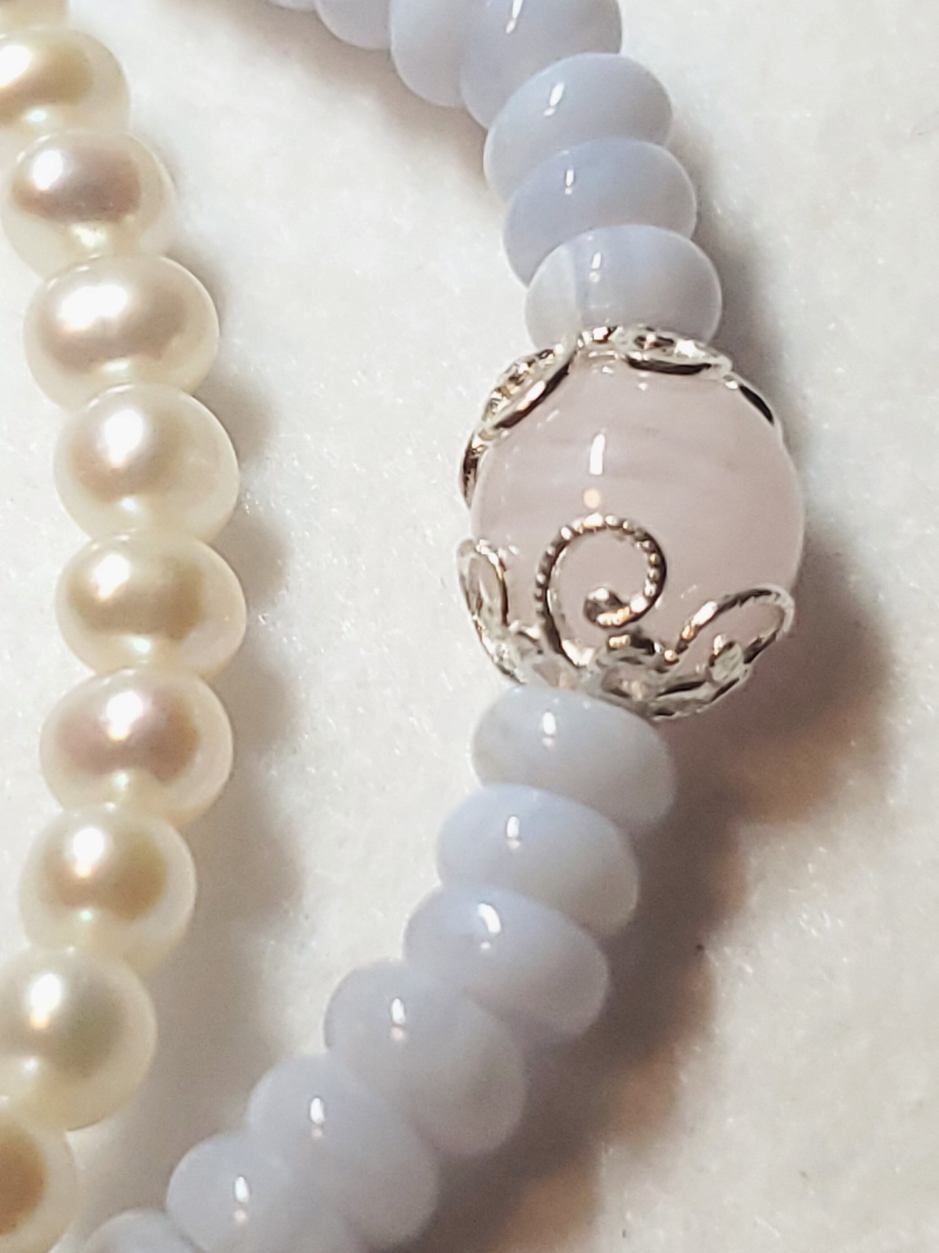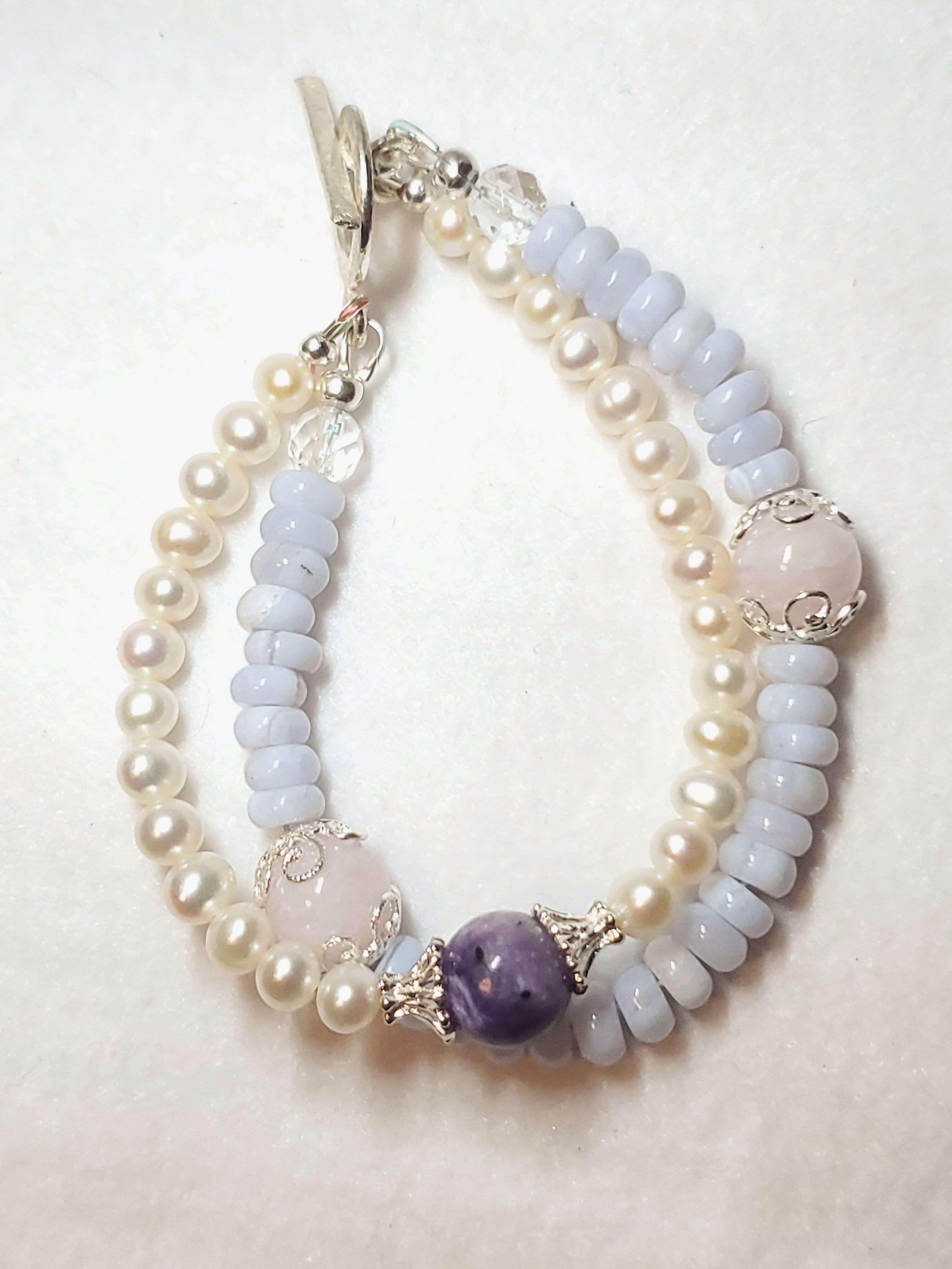 パワーストーン界では、チャロアイトは先にも述べた通りのヒーリングストーンです。心を癒し、洞察力を高め、心身を正常に保ちます。モルガナイトは幸せな結婚や、精神の調和、平穏などで、淡水パールは女性の美と健康を象徴しています。ブルーレースアゲートは、協調性やコミュニケーションなどの意味を持ちます。