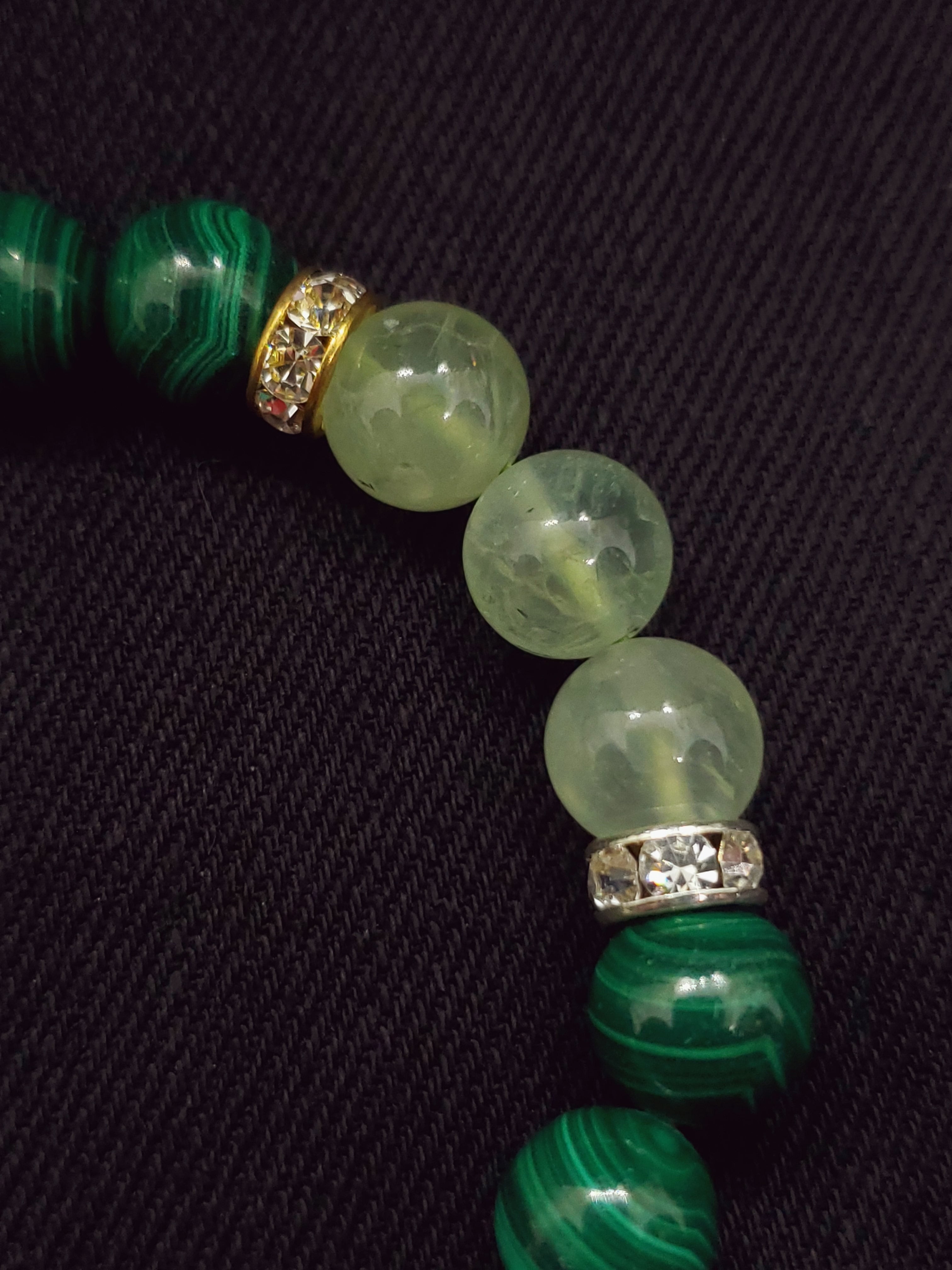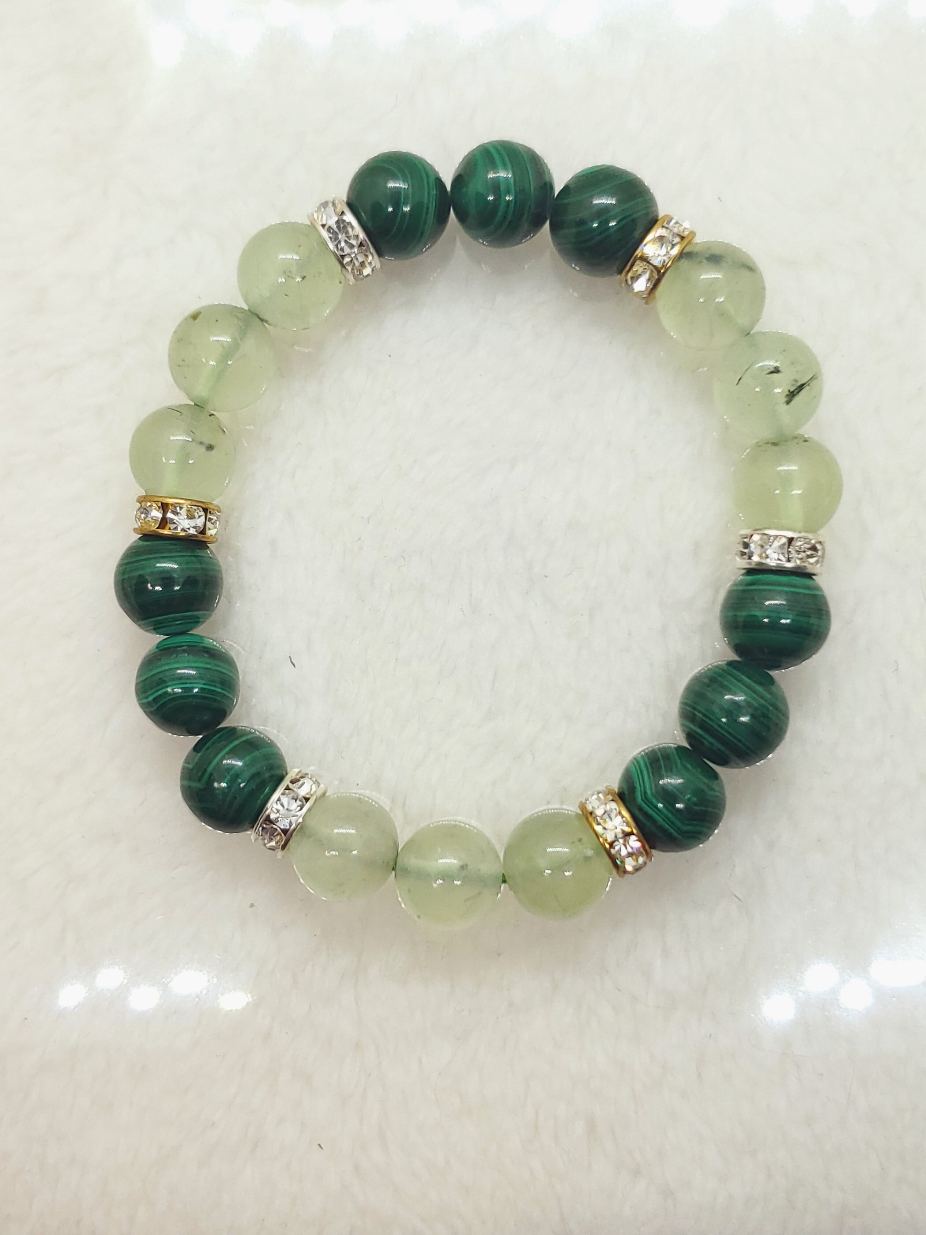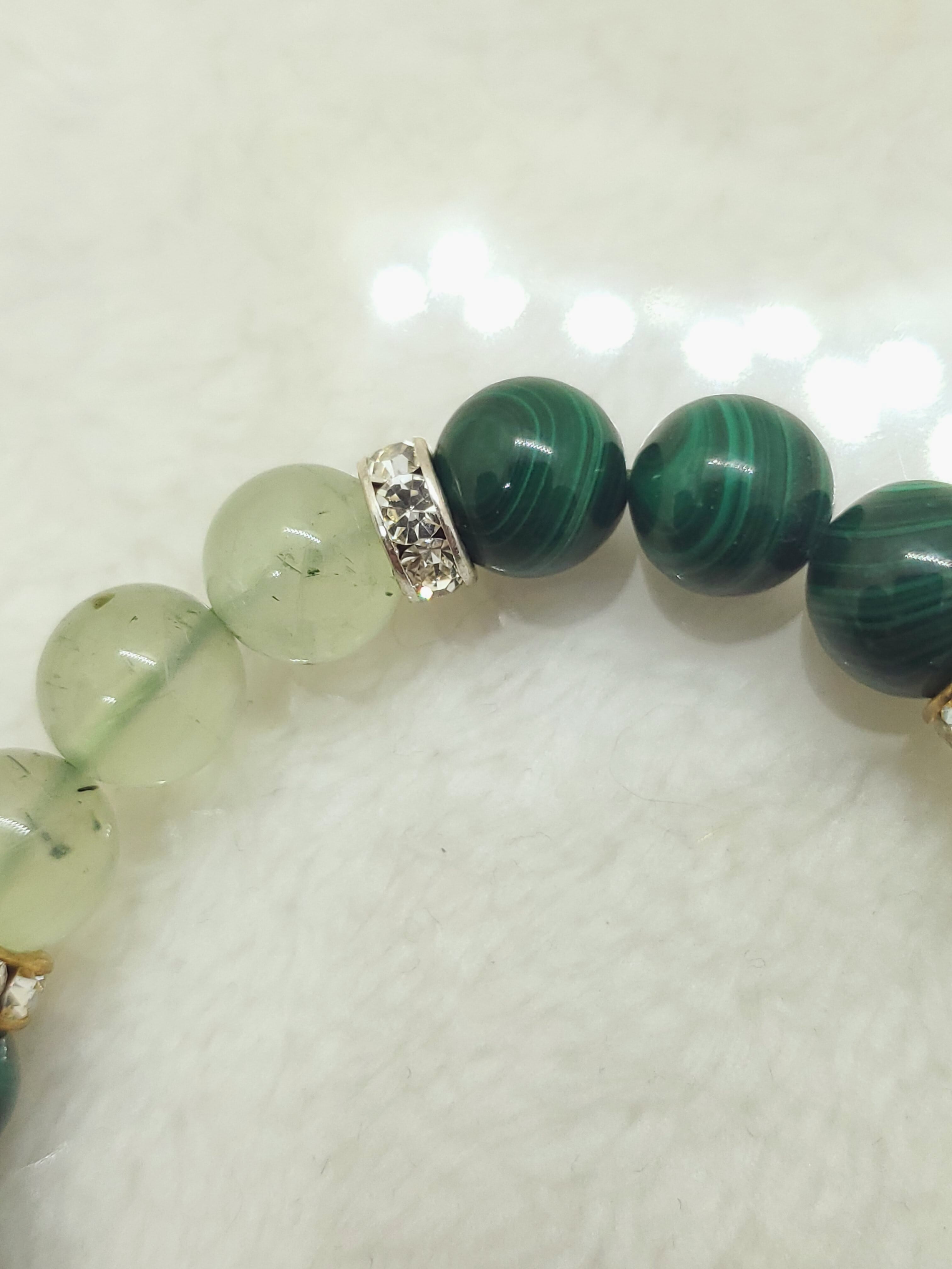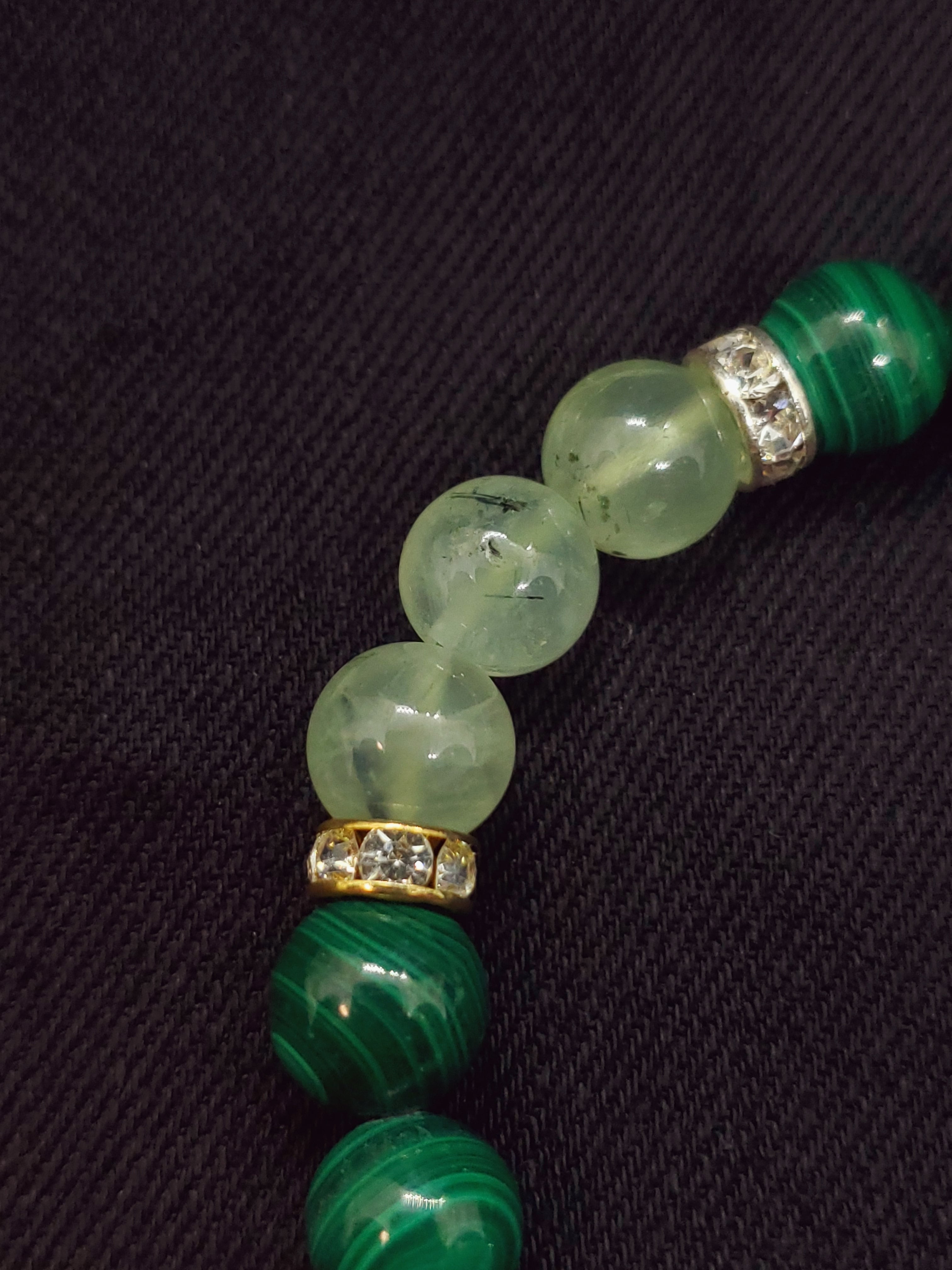 深みのあるマラカイトの緑色と、葡萄石の名の通りフルーツのような甘いグリーンのプレナイトのブレスレットです。