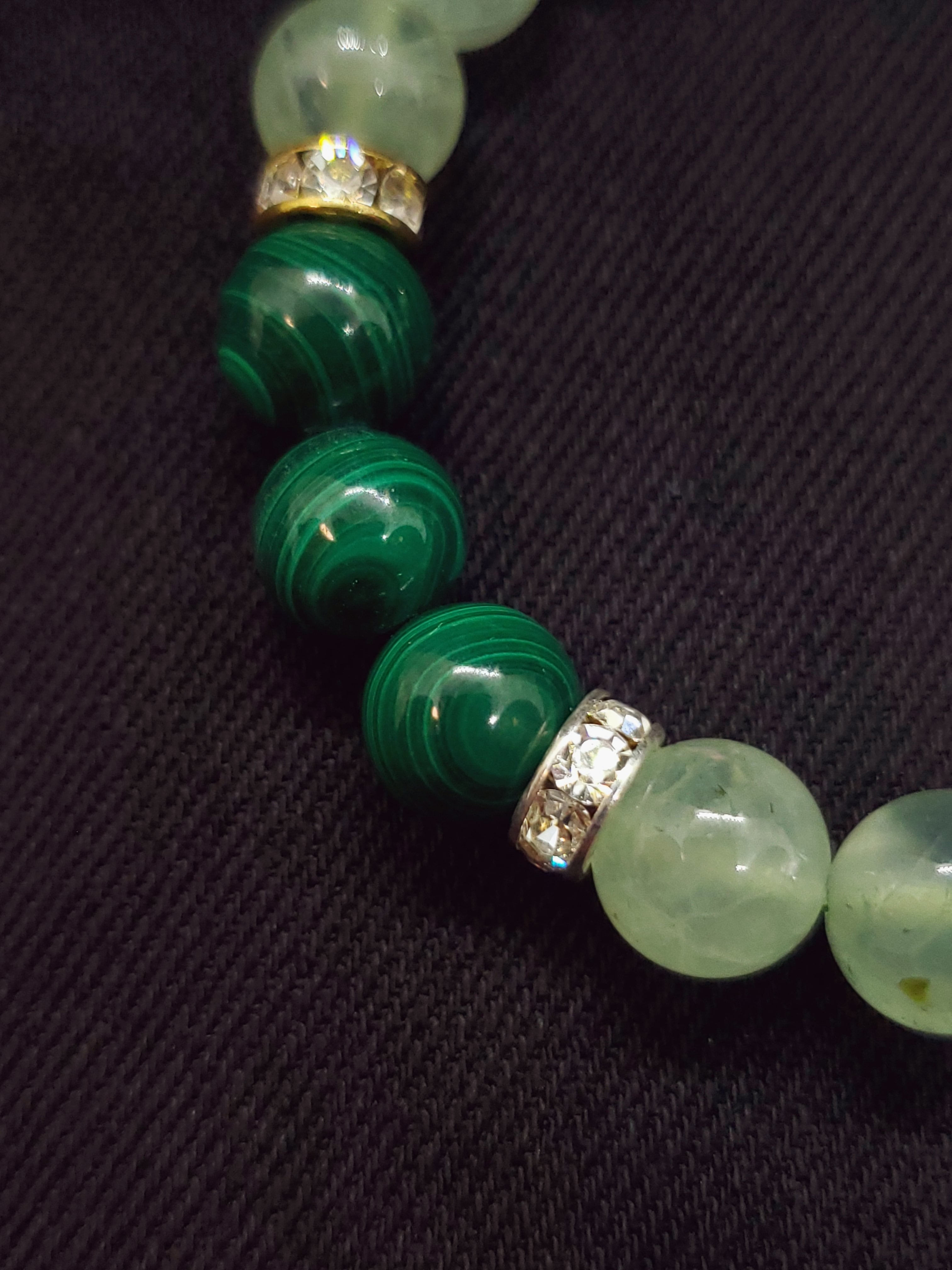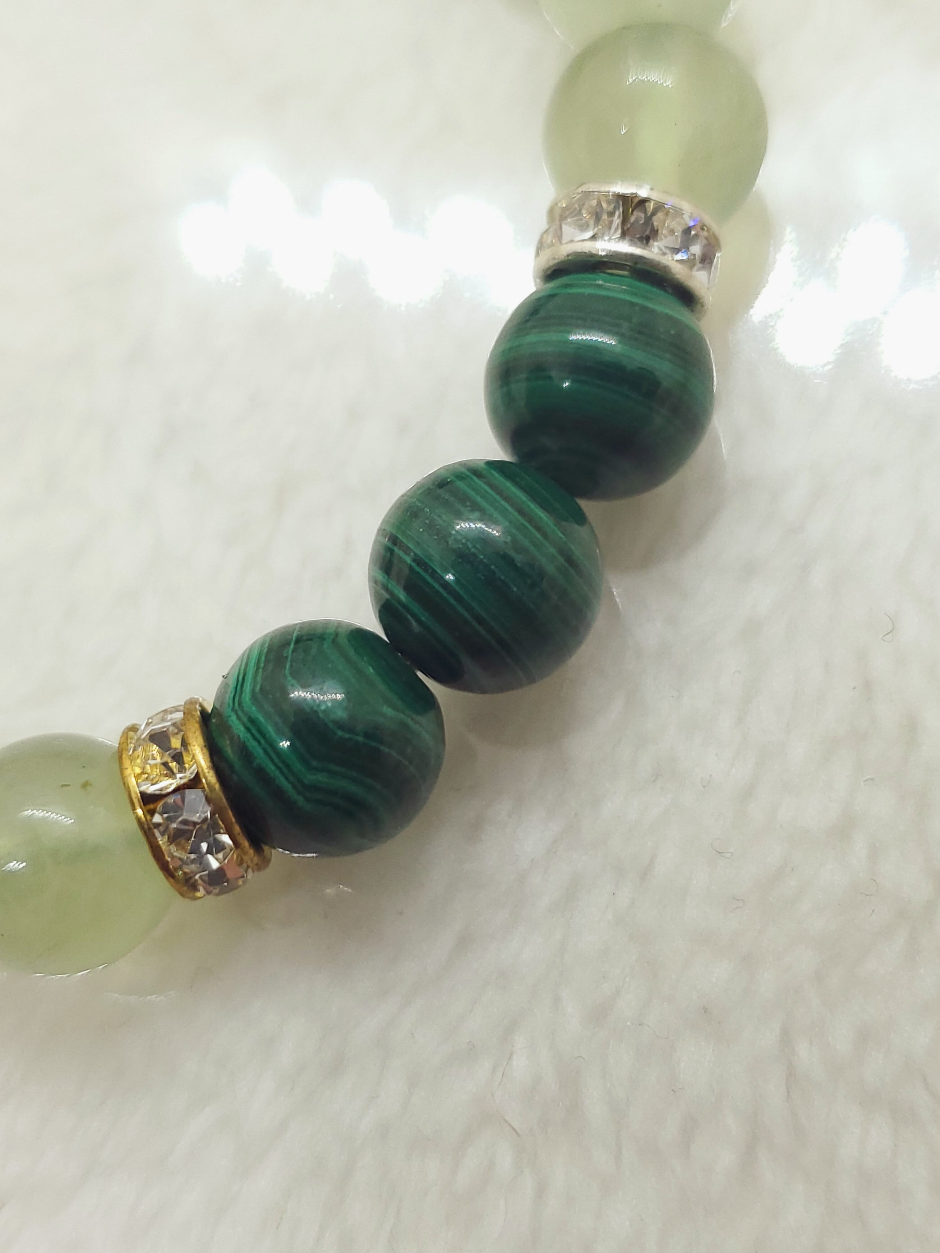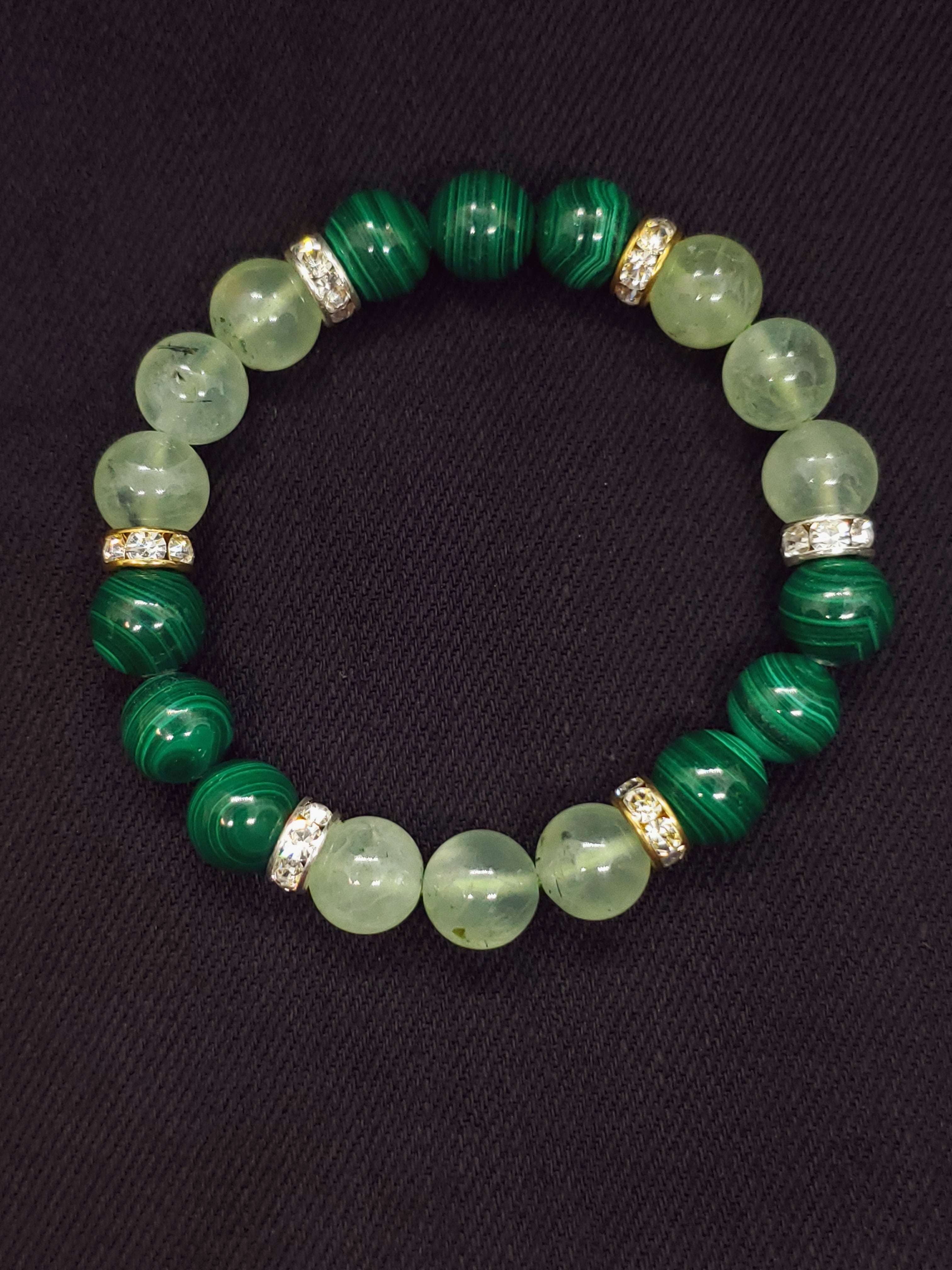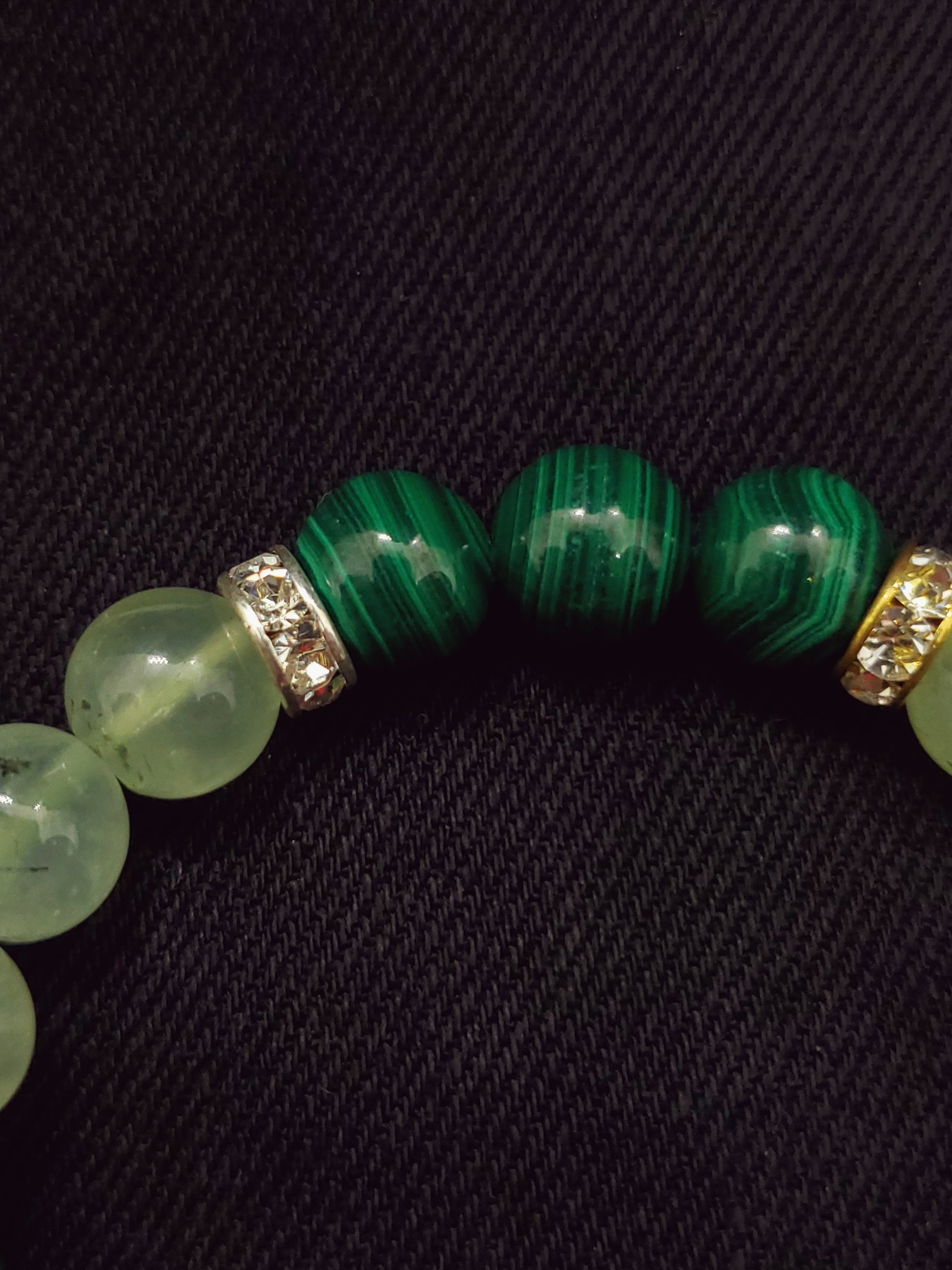 深みのあるマラカイトの緑色と、葡萄石の名の通りフルーツのような甘いグリーンのプレナイトのブレスレットです。