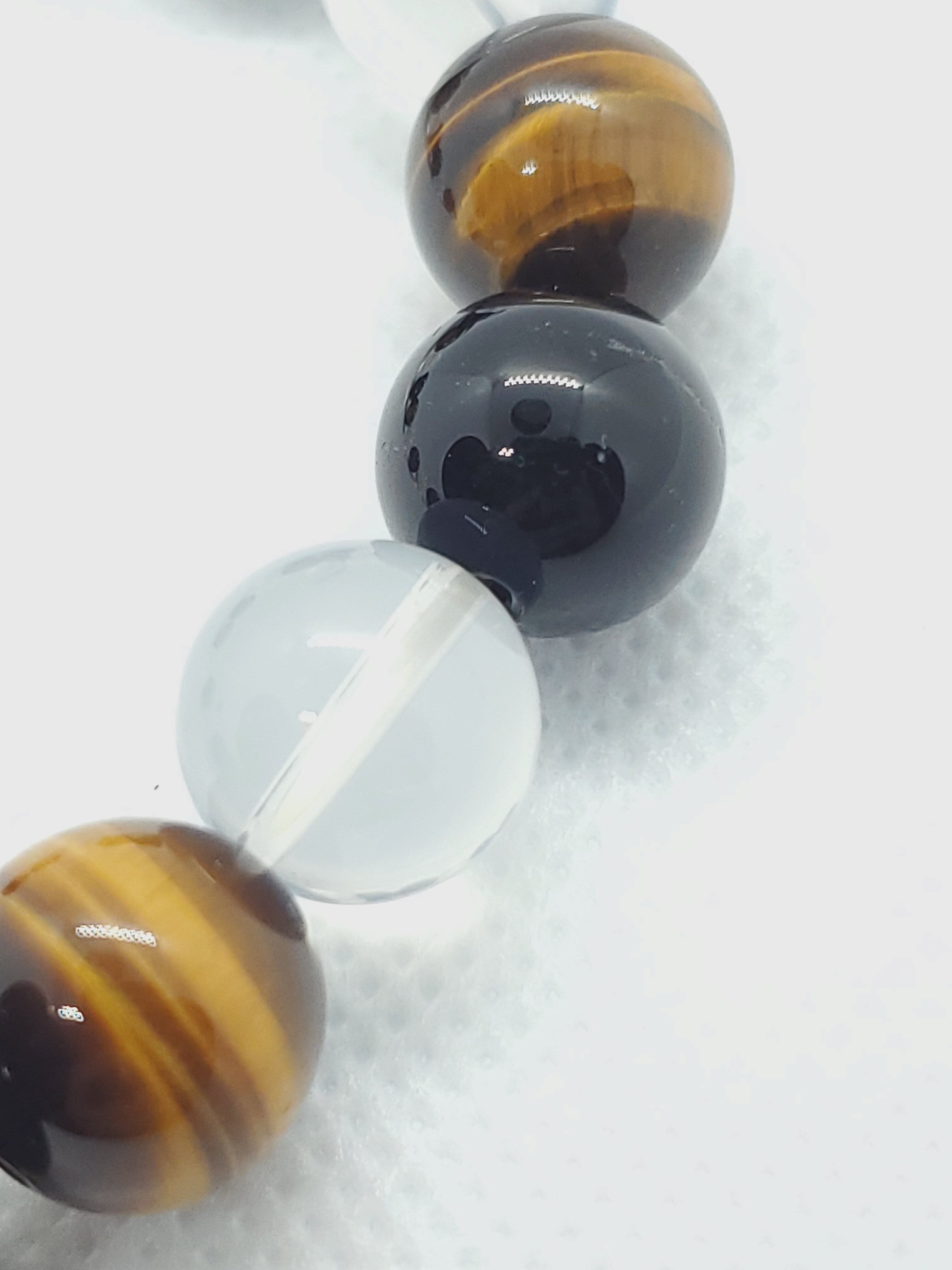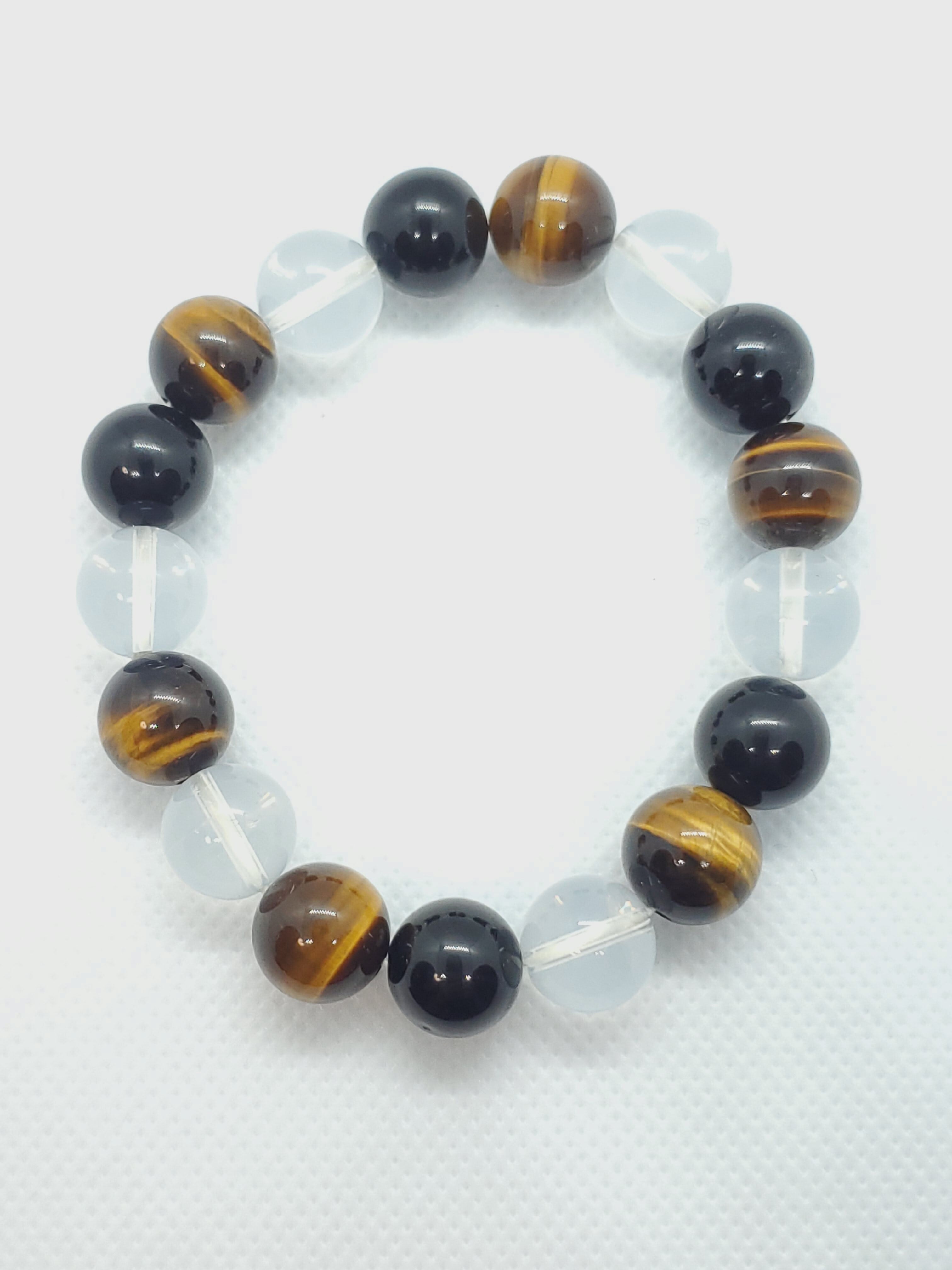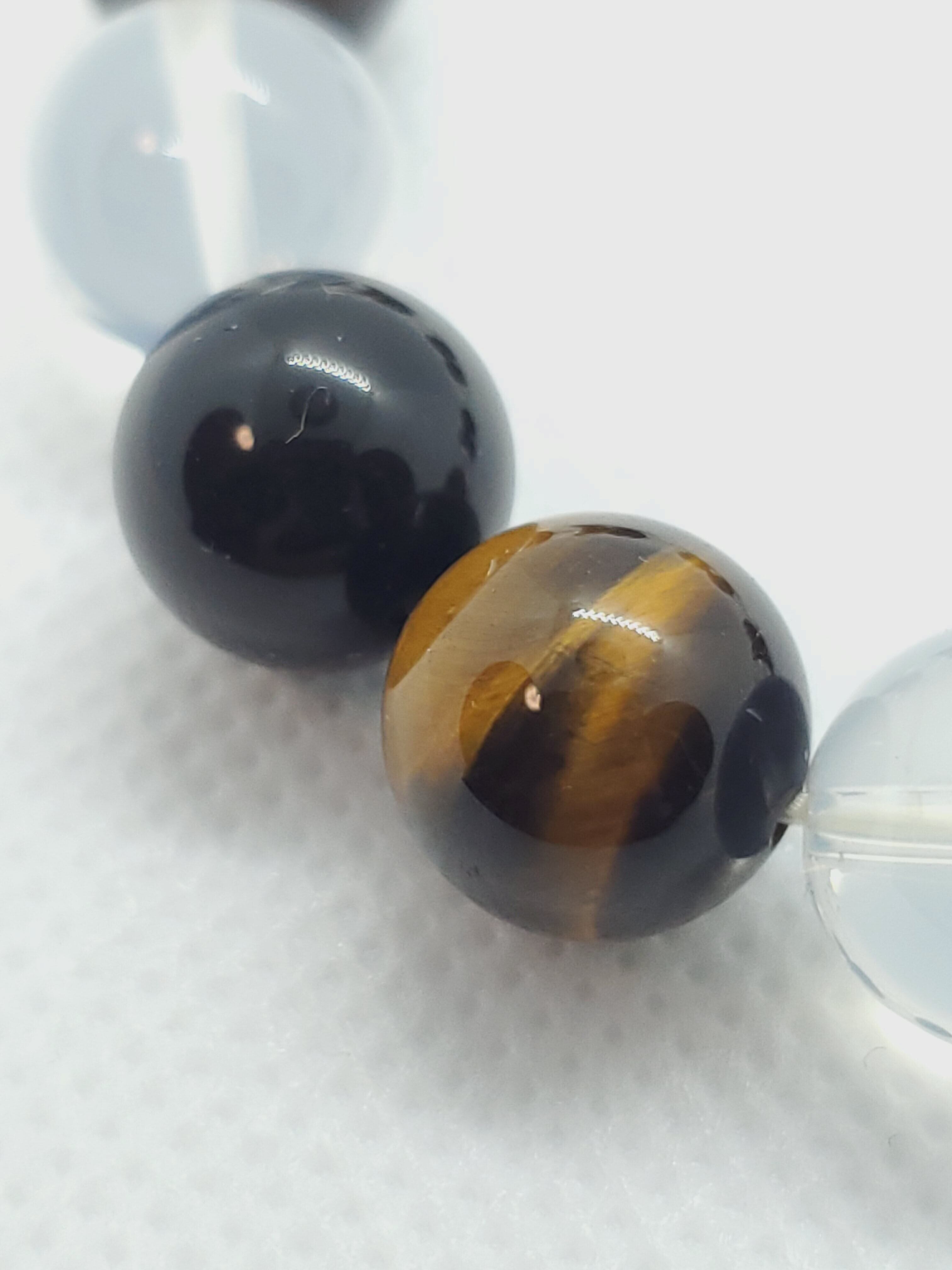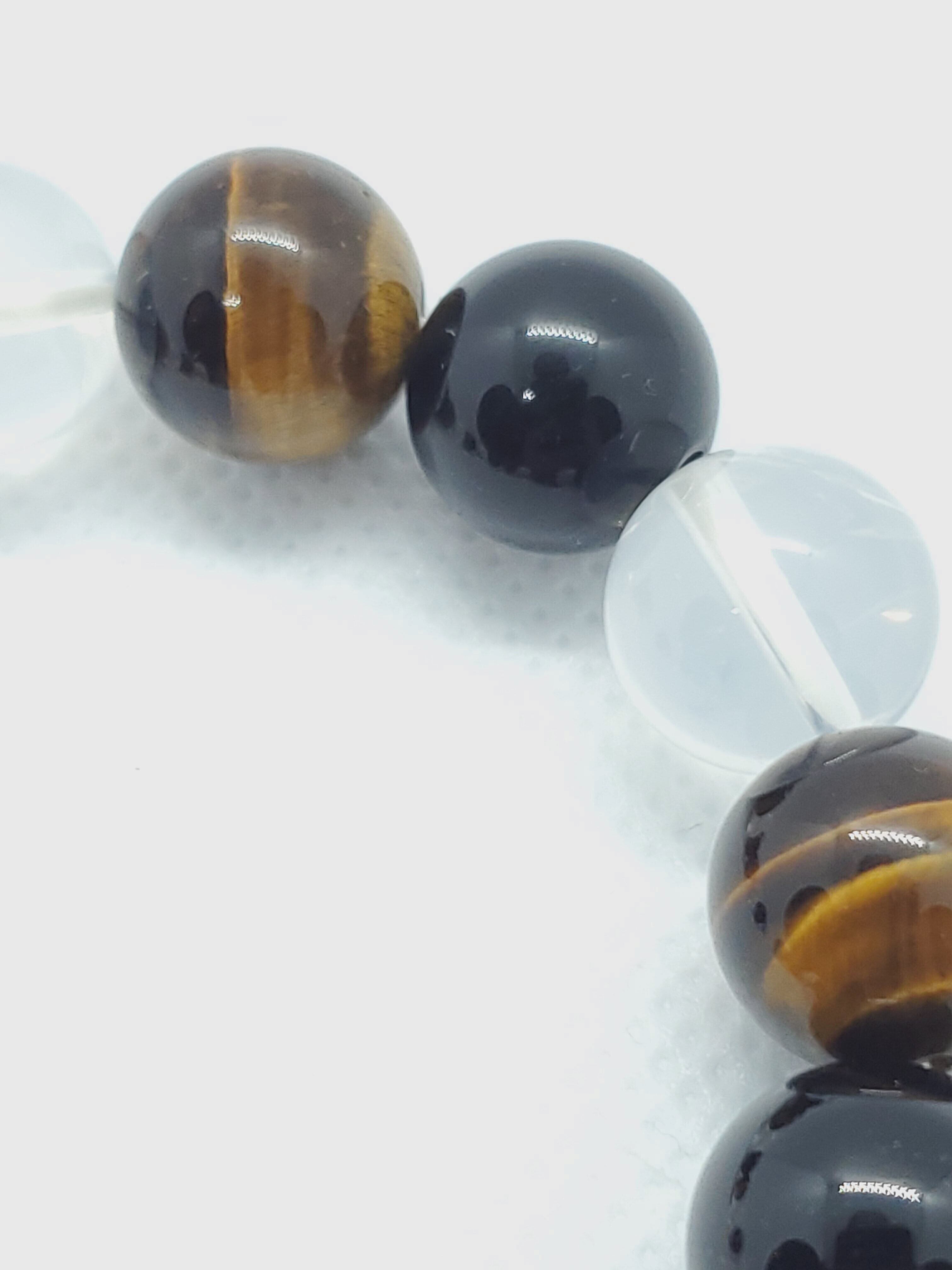 ヒマラヤ産ムーンクォーツとモリオン、タイガーアイの大玉の12mmブレスレットです。