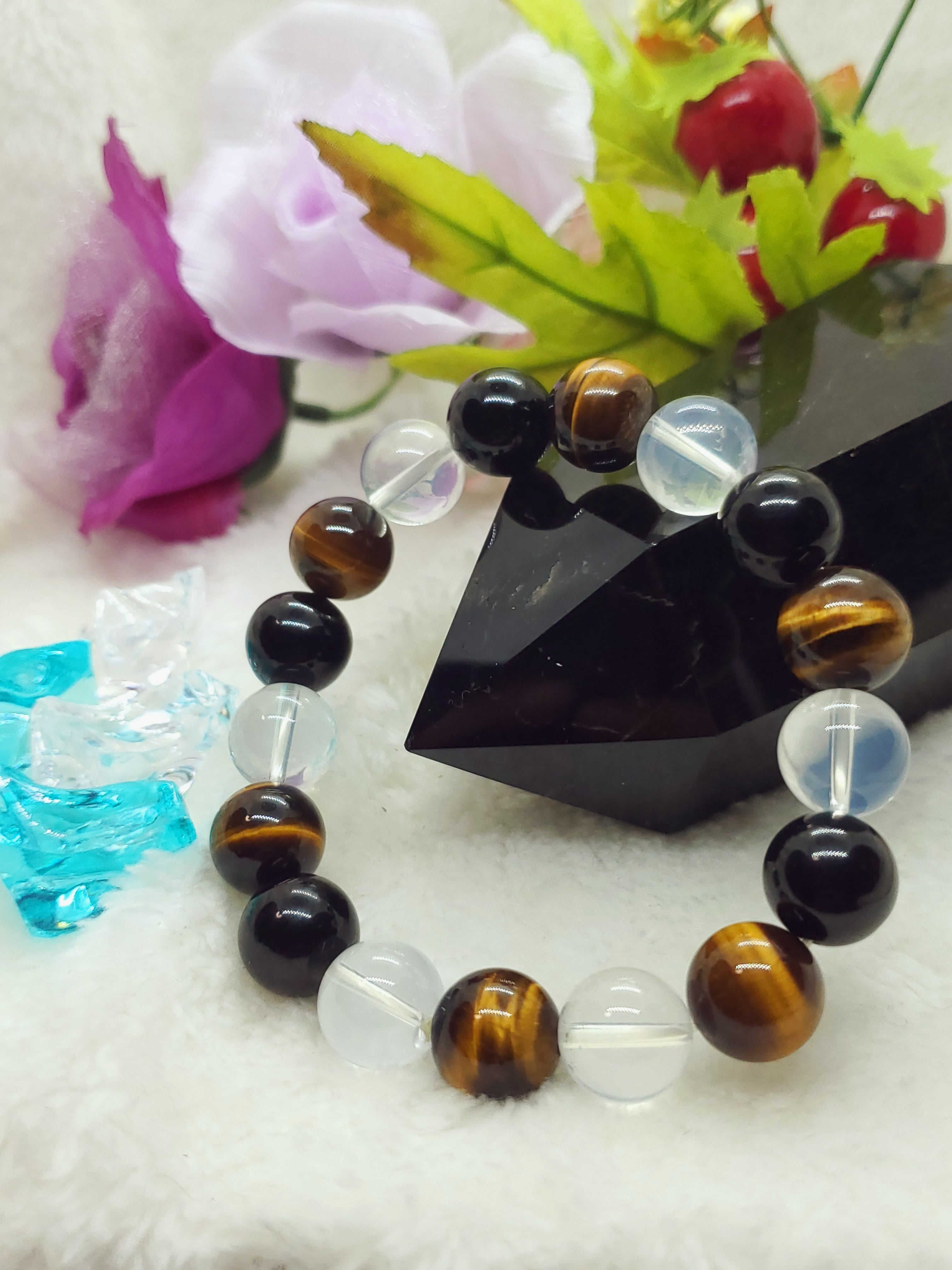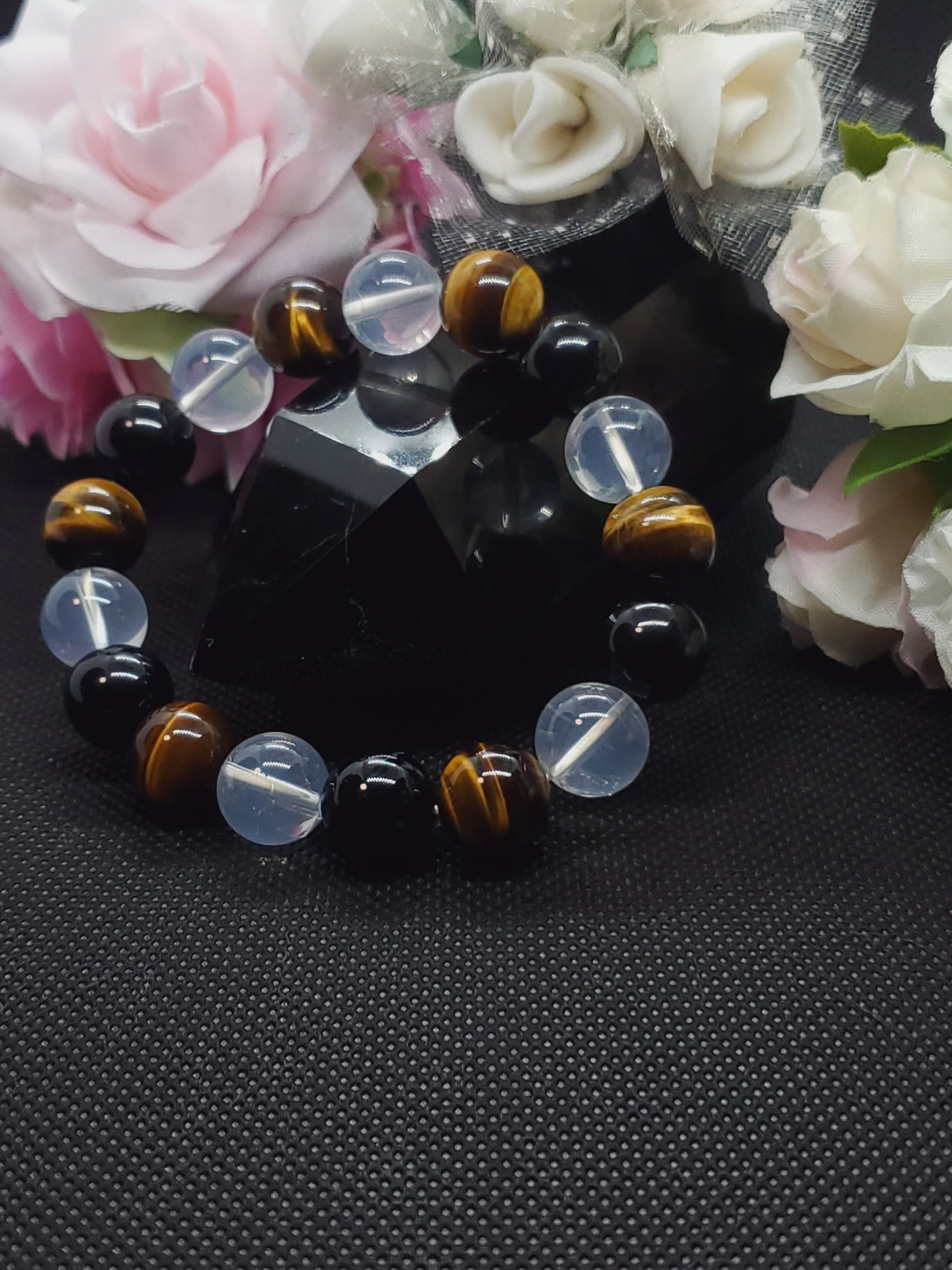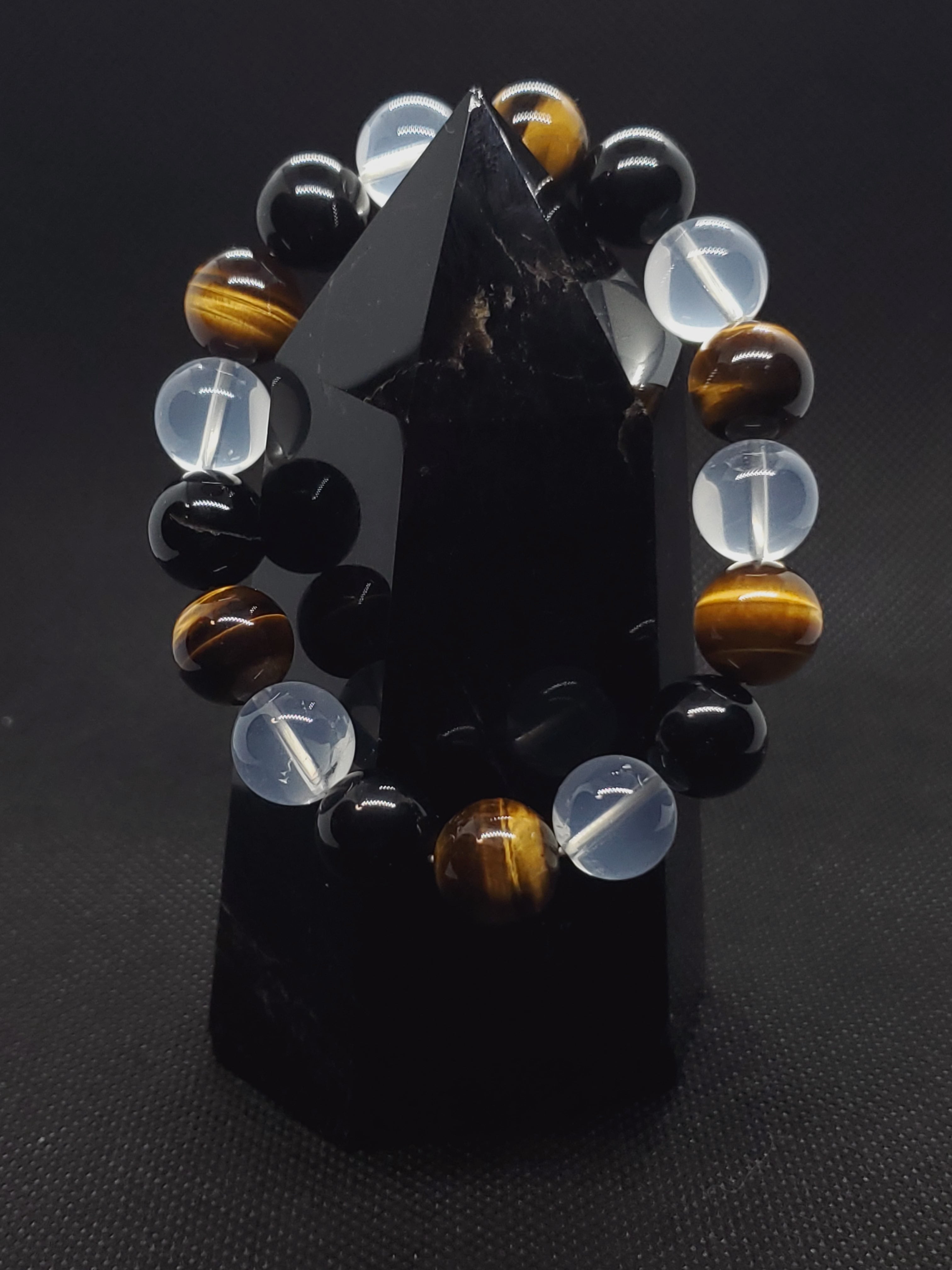ヒマラヤ産ムーンクォーツとモリオン、タイガーアイの大玉の12mmブレスレットです。