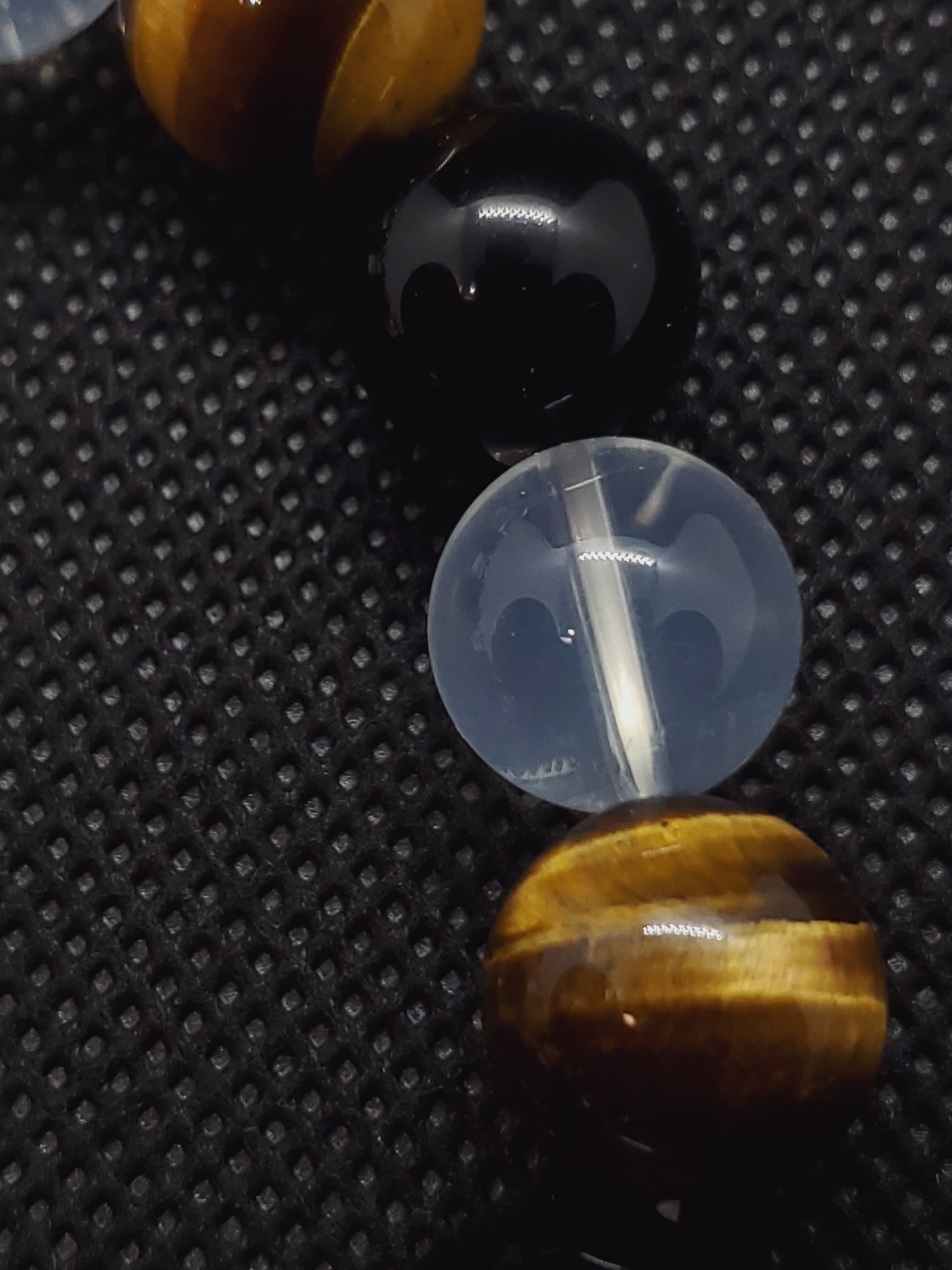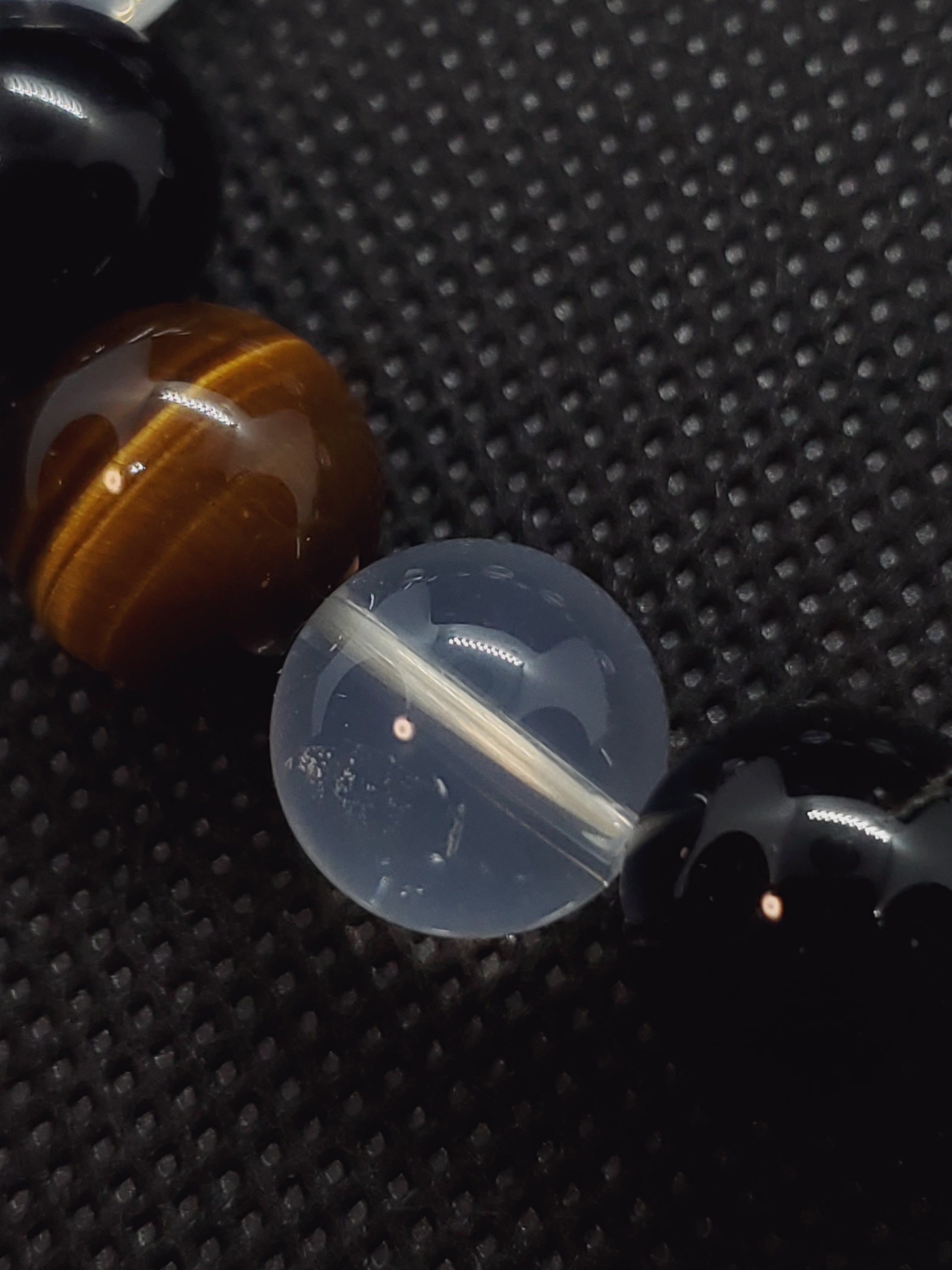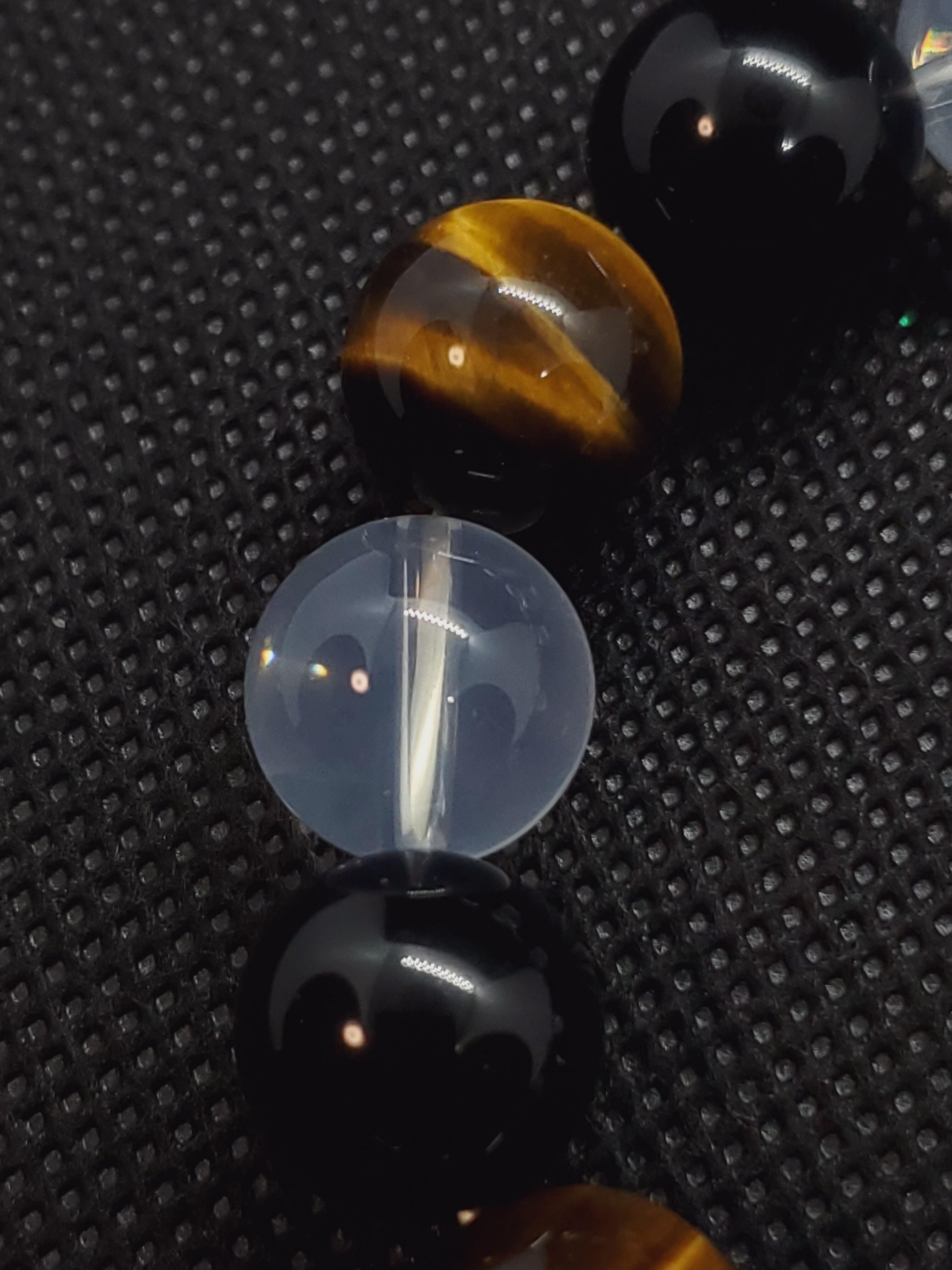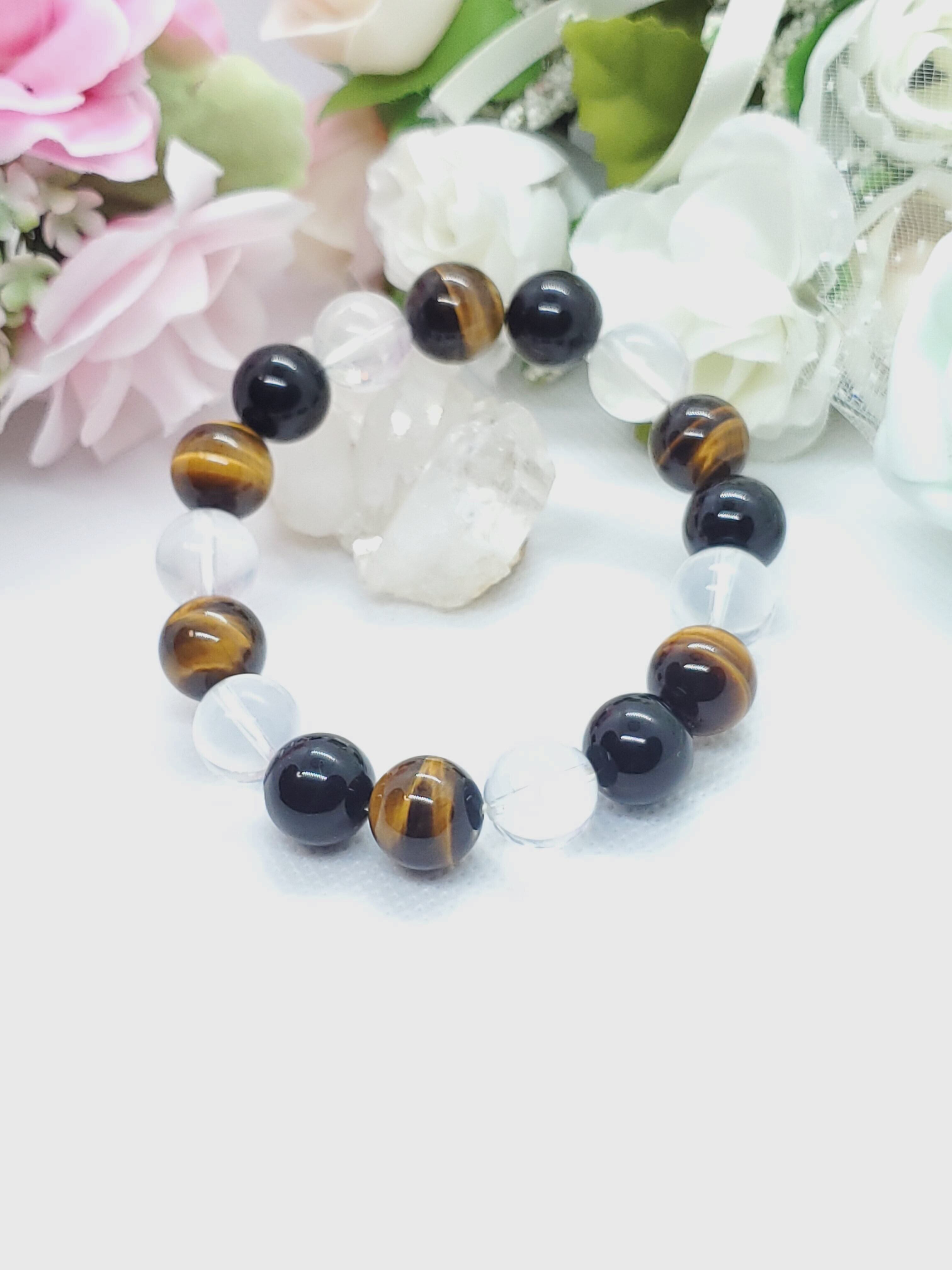ヒマラヤ産ムーンクォーツとモリオン、タイガーアイの大玉の12mmブレスレットです。