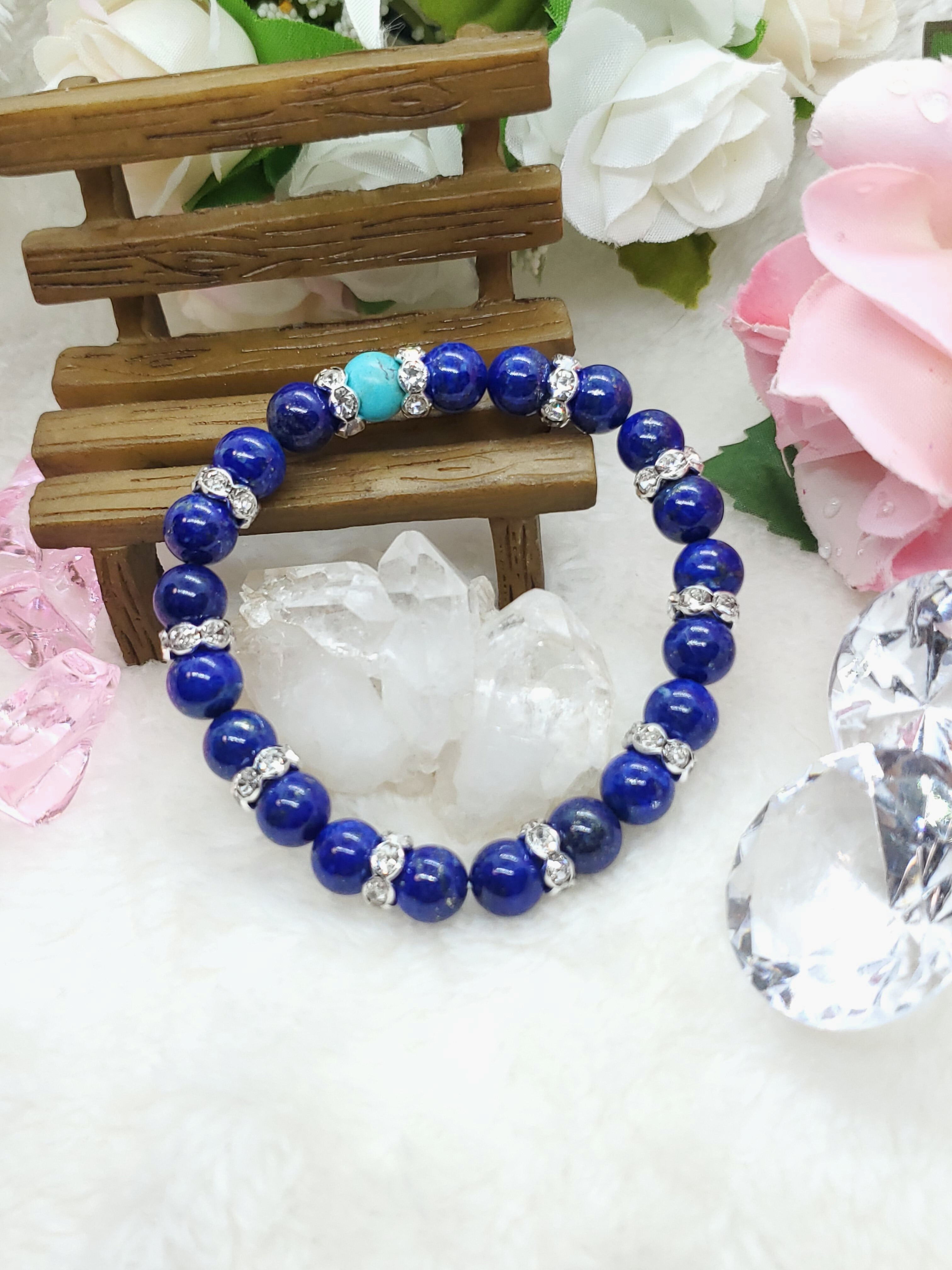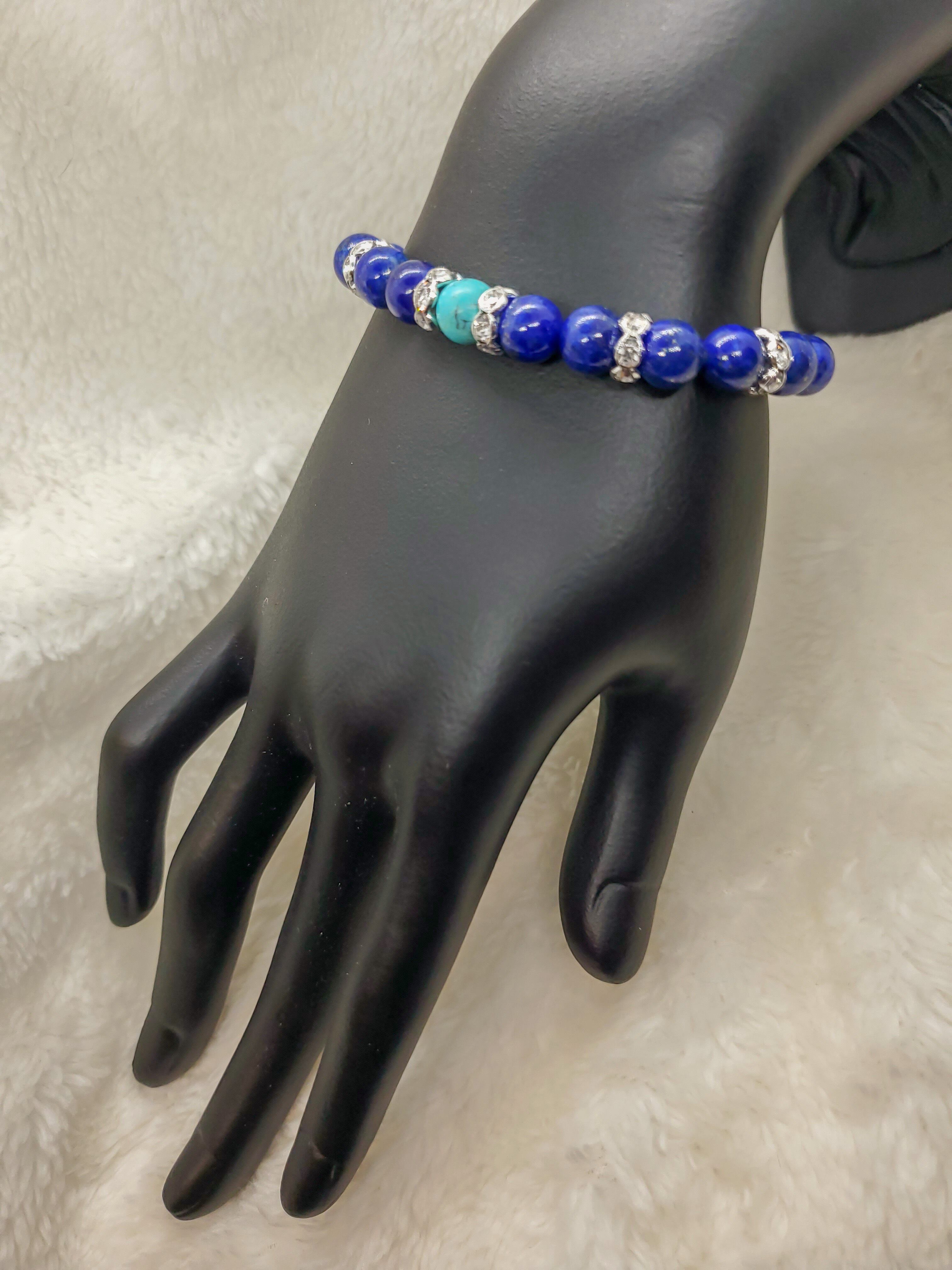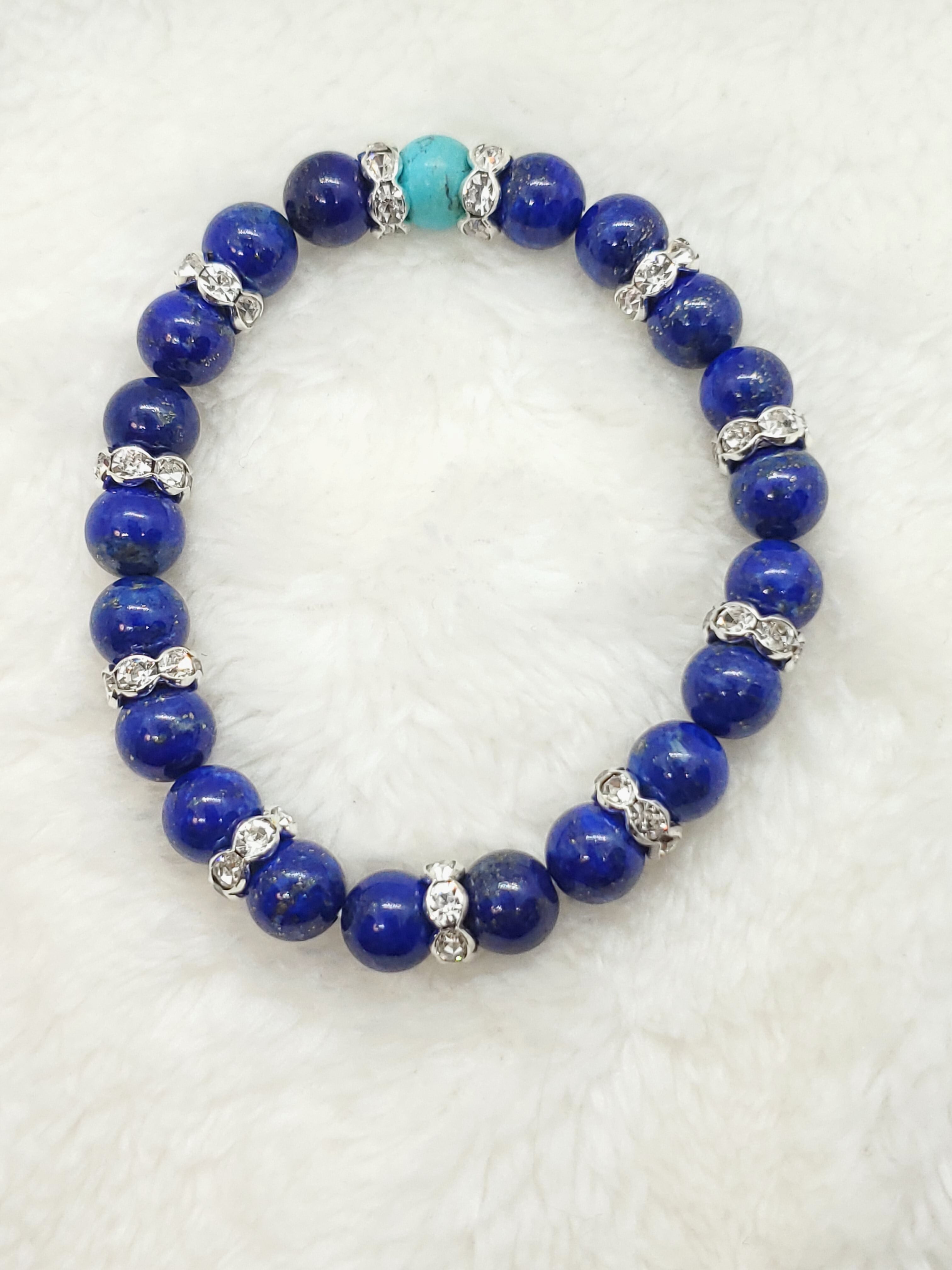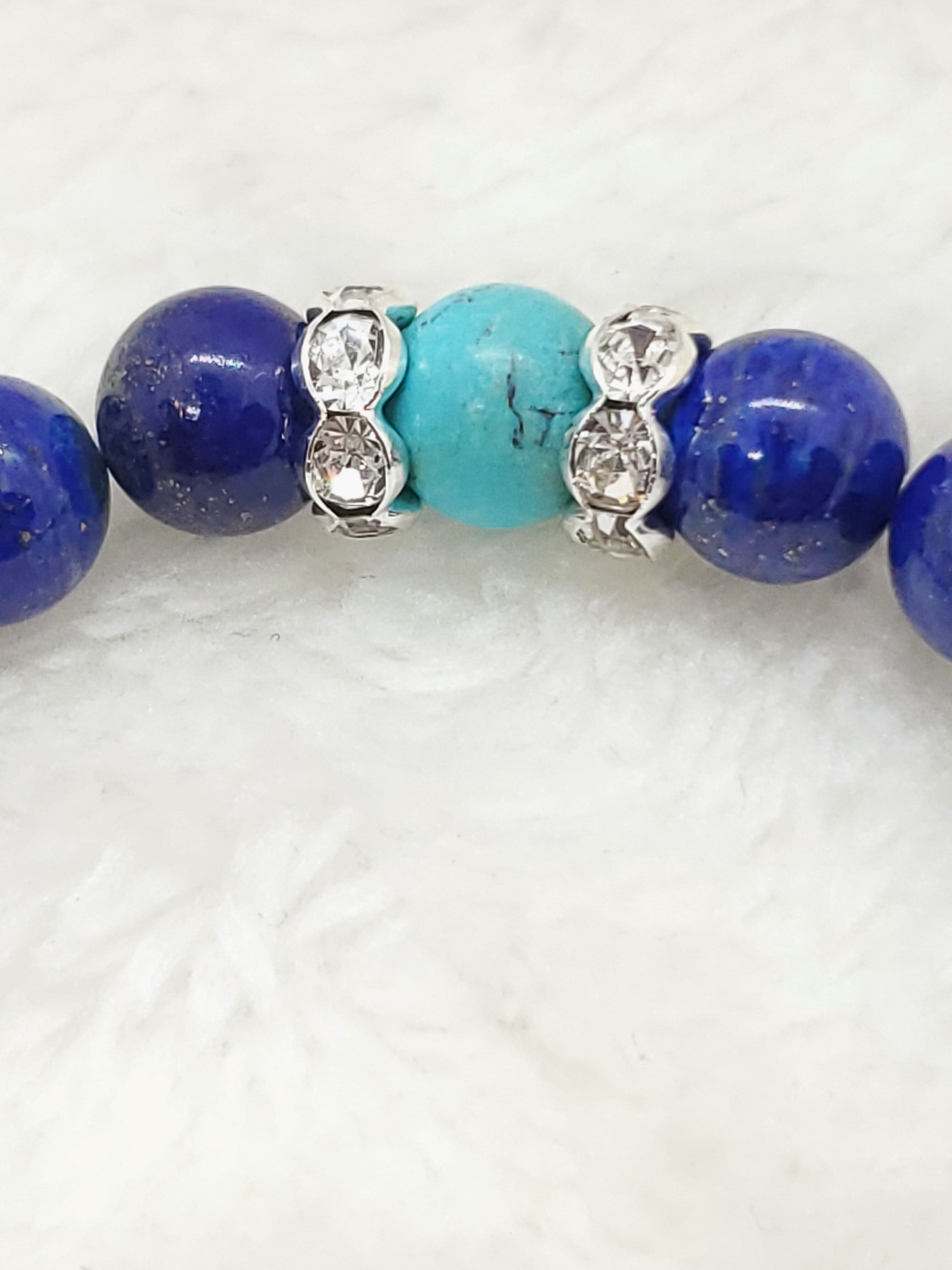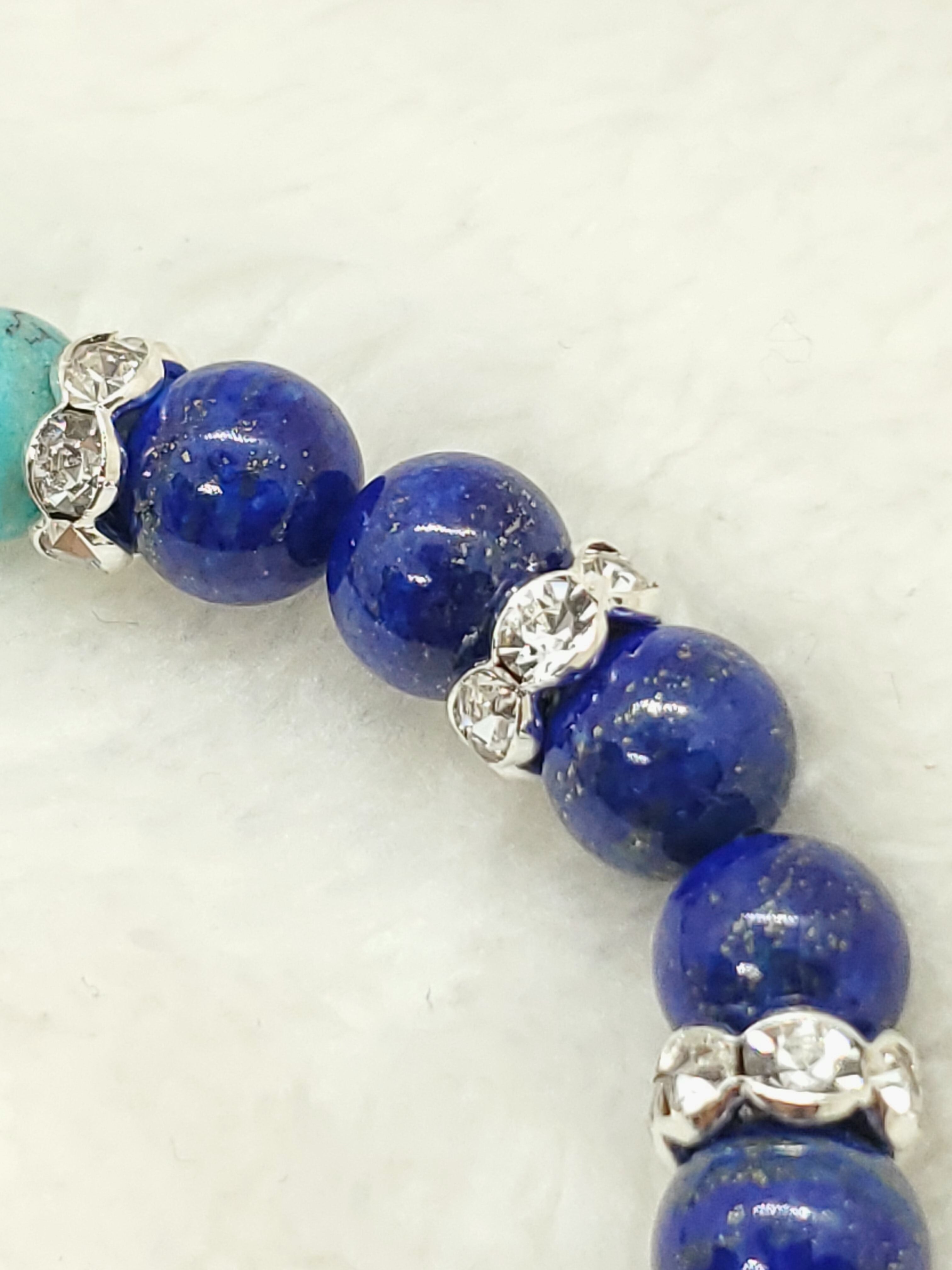 目の覚めるような鮮やかな発色の、アフガニスタン産ラピスラズリと、天然色(仕入れ元が鑑別済)ターコイズのブルーブレスレットです。
