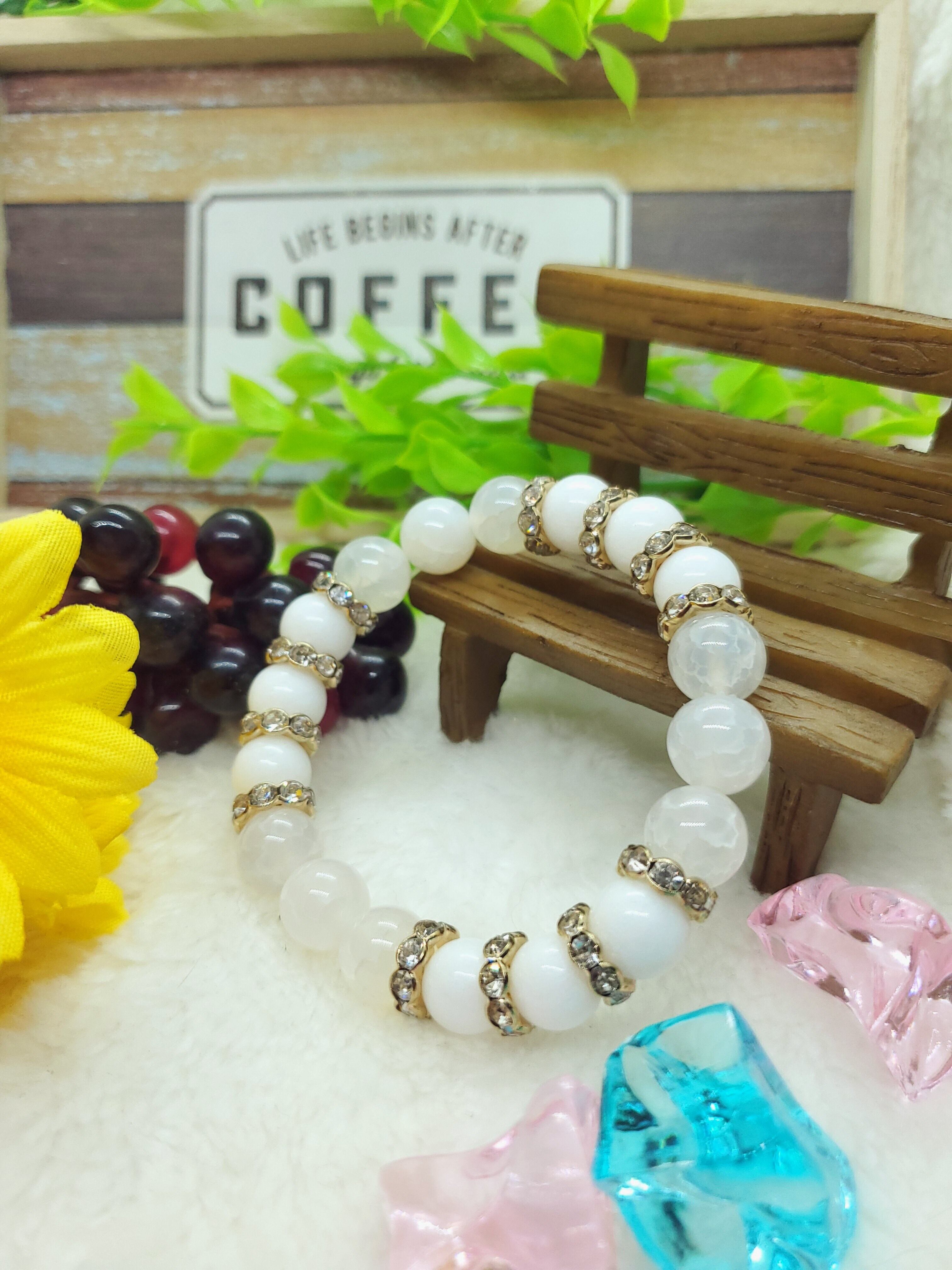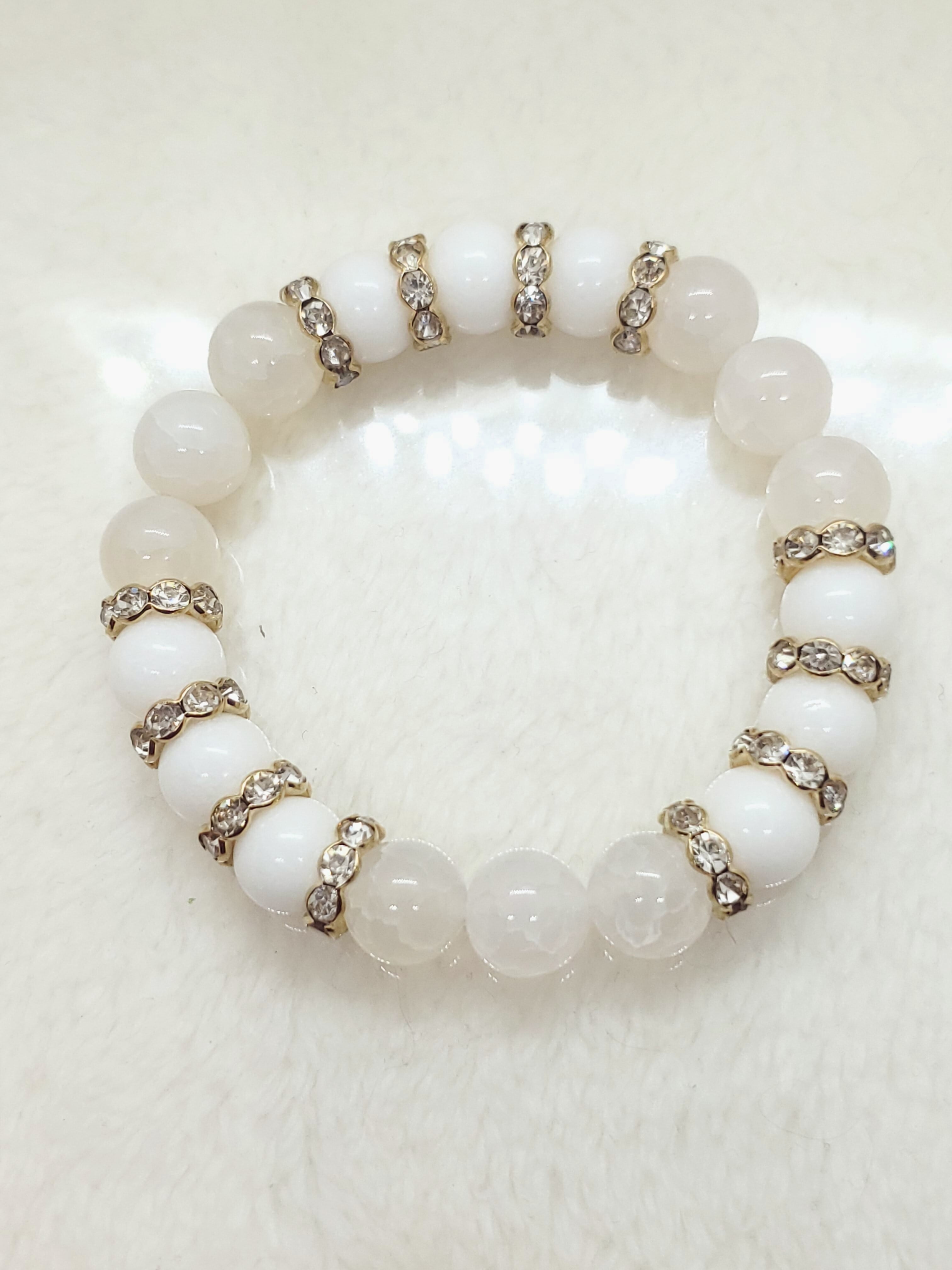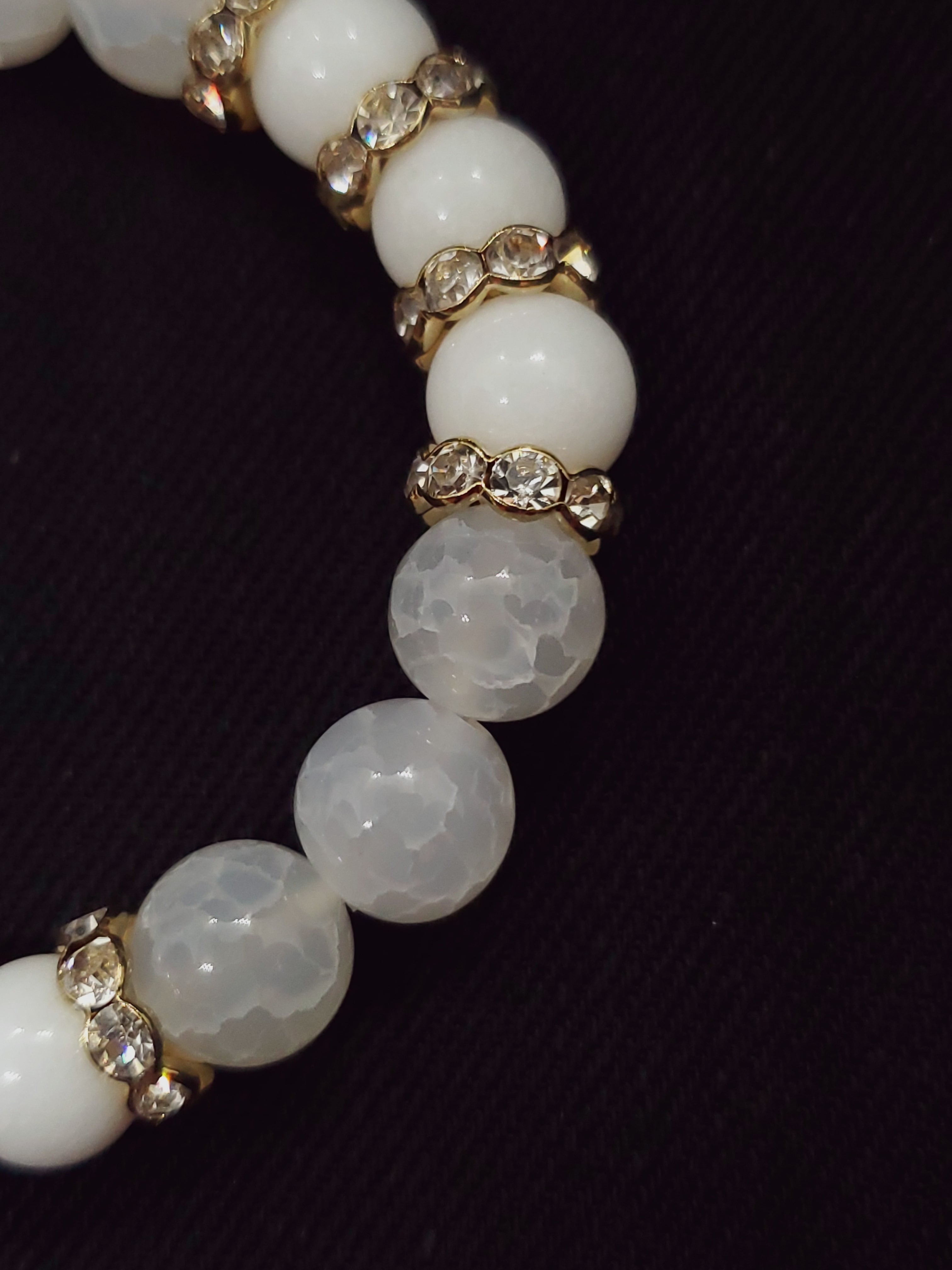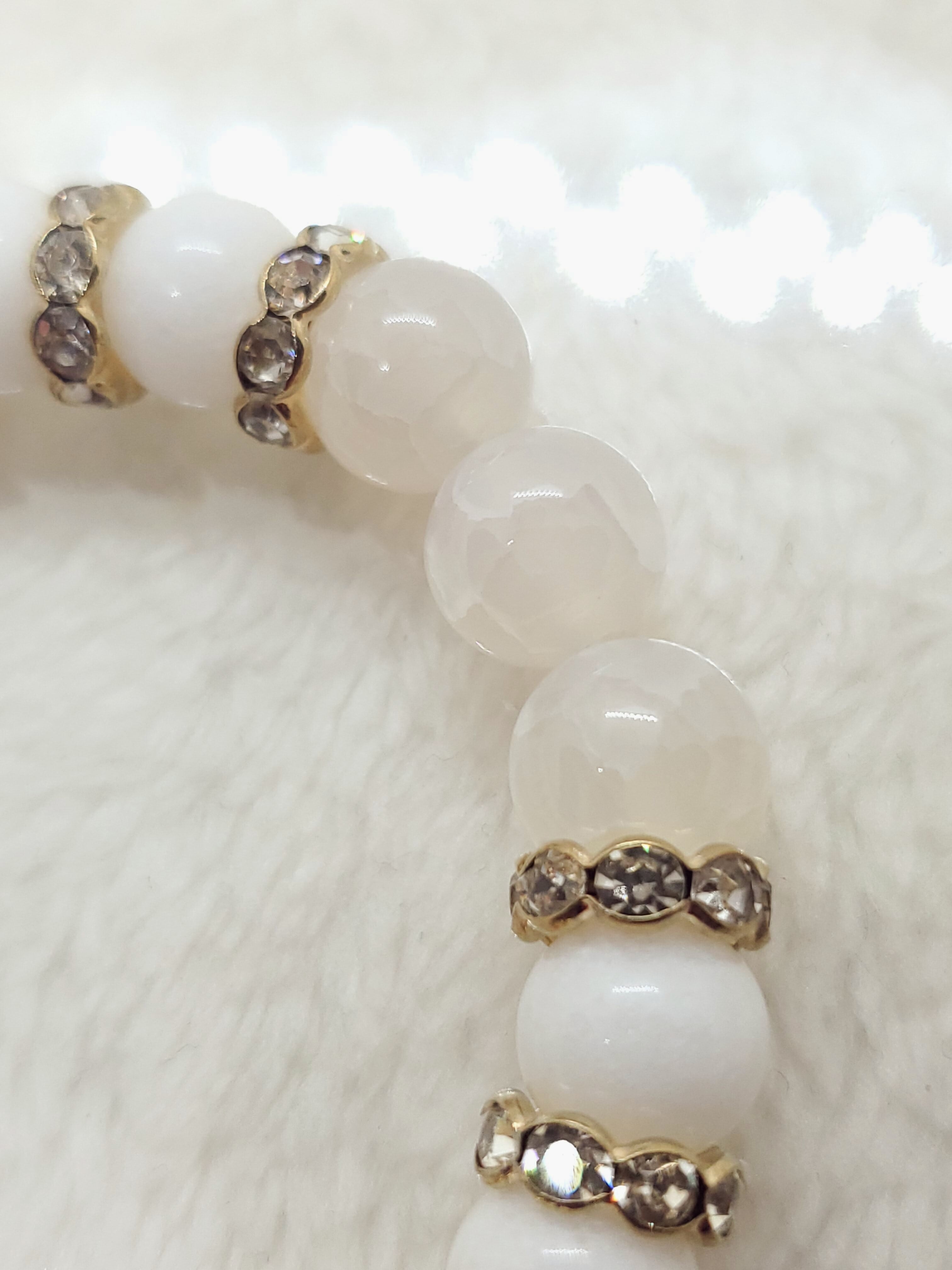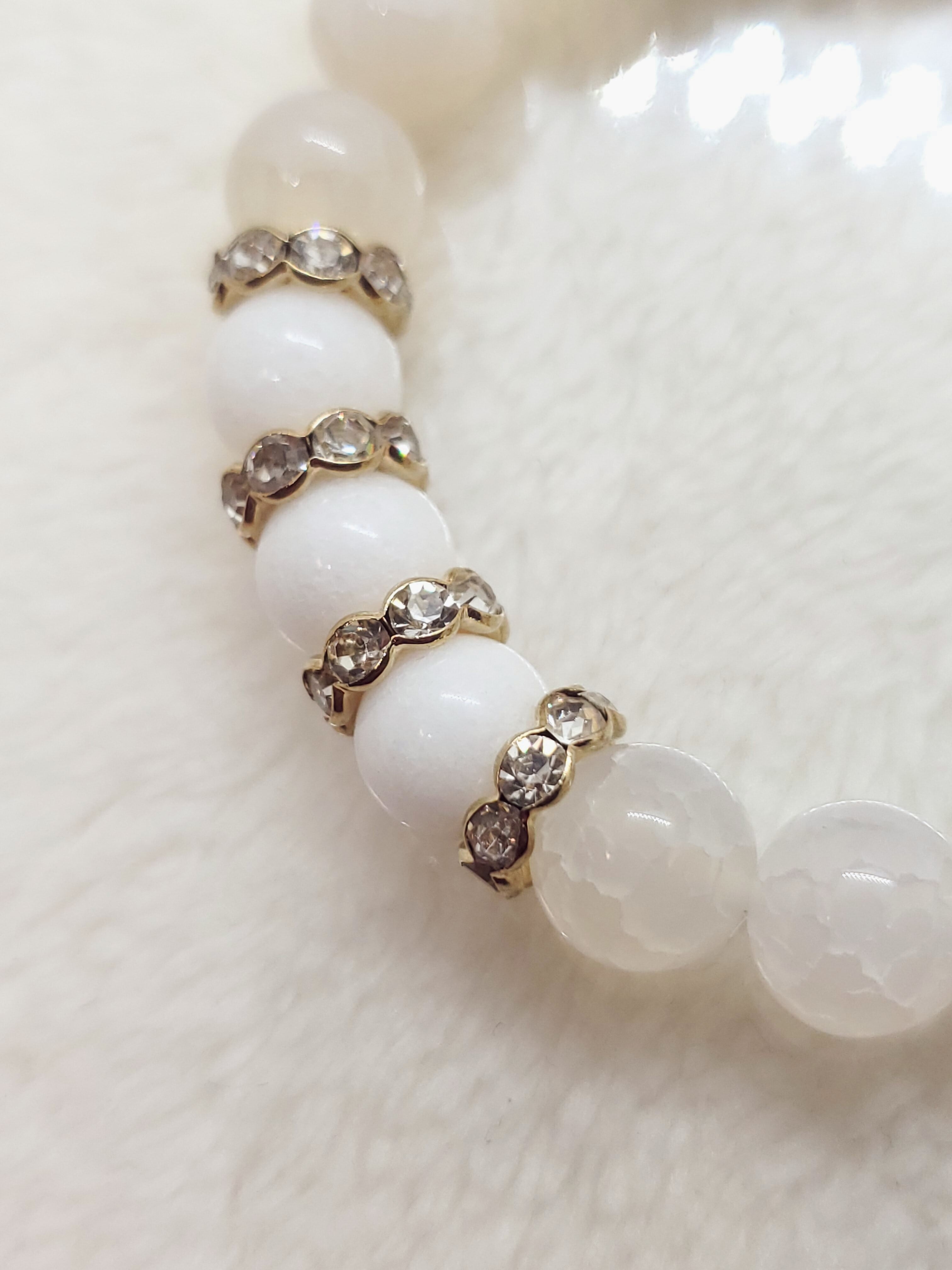 真っ白なホワイトジェード(正式名クォーツァイト)と、透け感のあるホワイトカルセドニー(人工クラック)の雪のようなホワイトブレスレットです。
