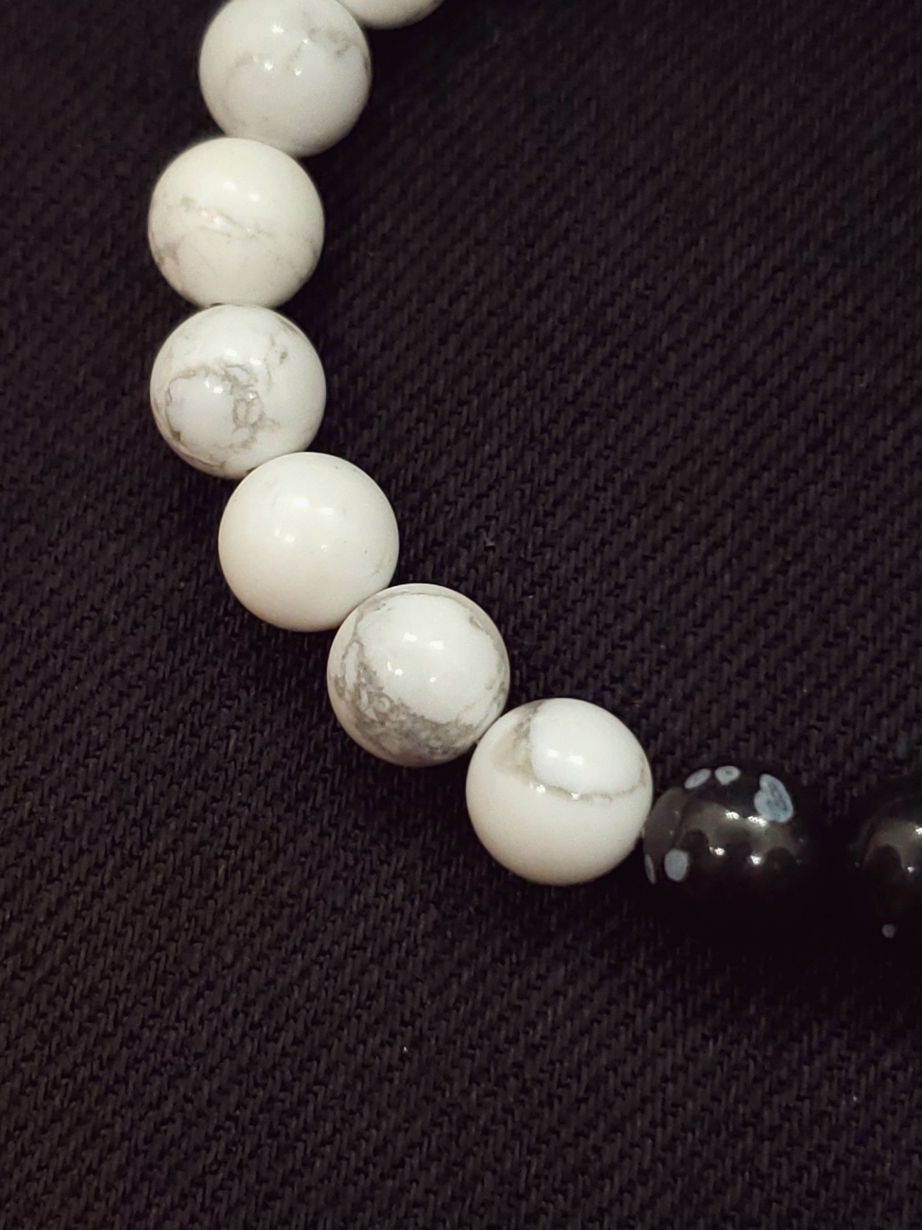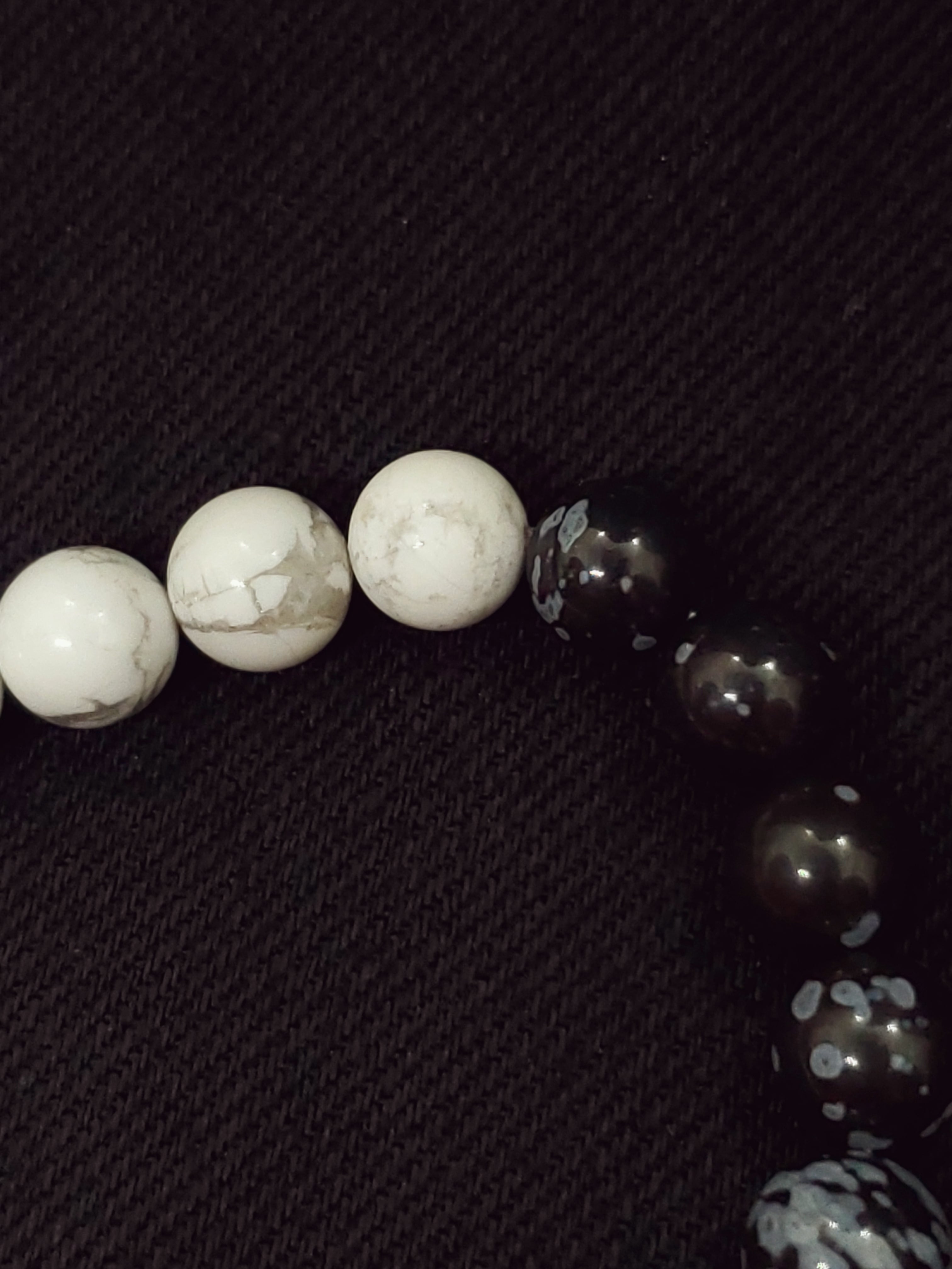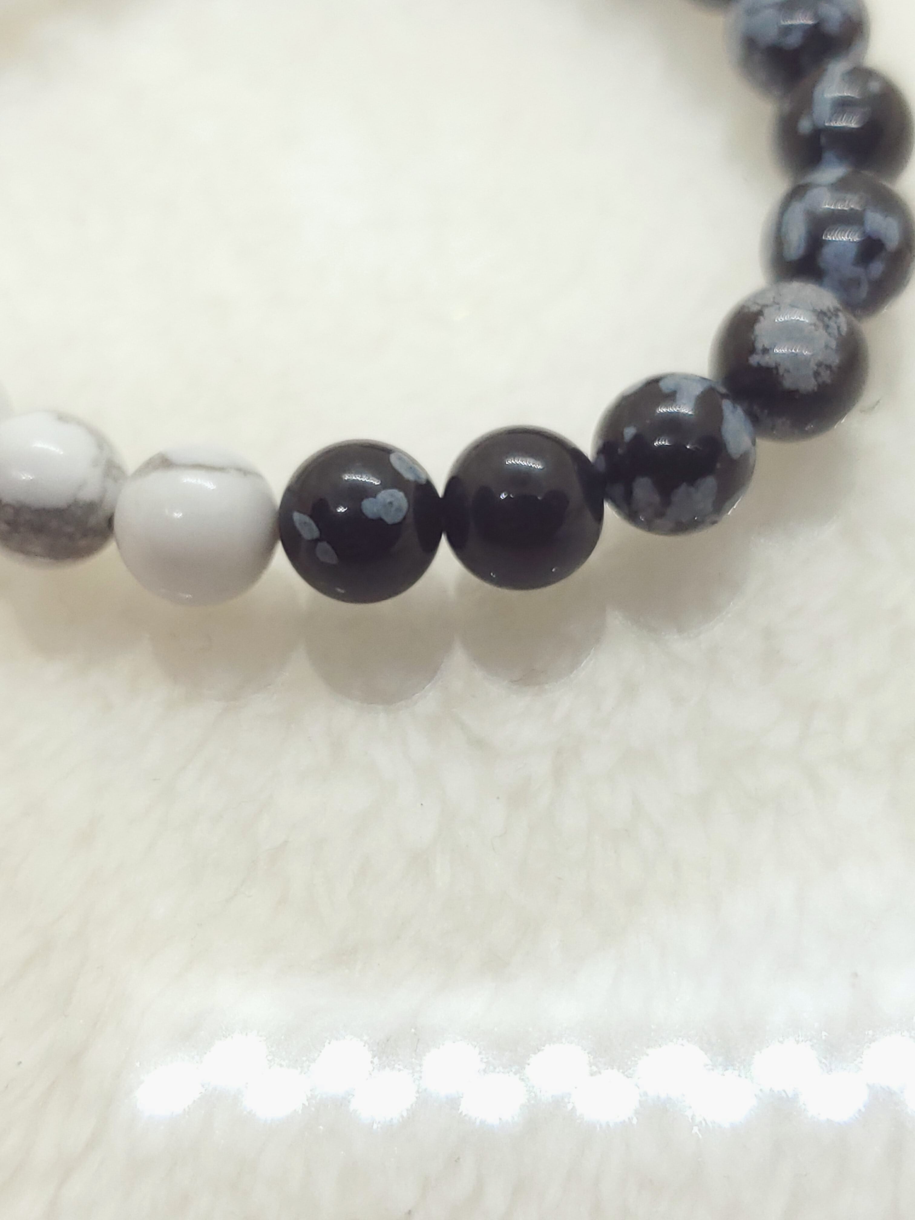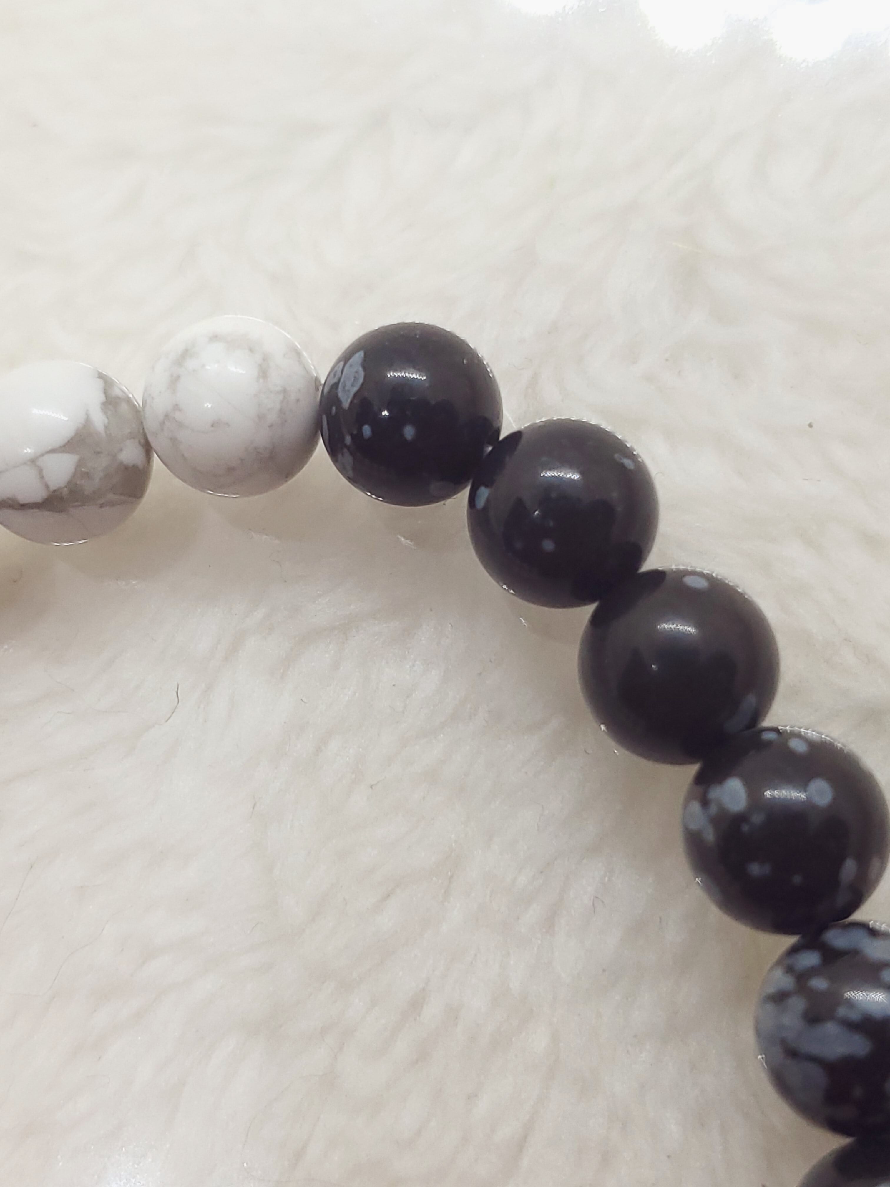 白ベースにグレーのラインが入ったハウライト(マグネサイト)と、黒ベースにグレーの粉雪のような模様が入ったスノーフレークオブシディアンを左右非対称になるように組みました!
