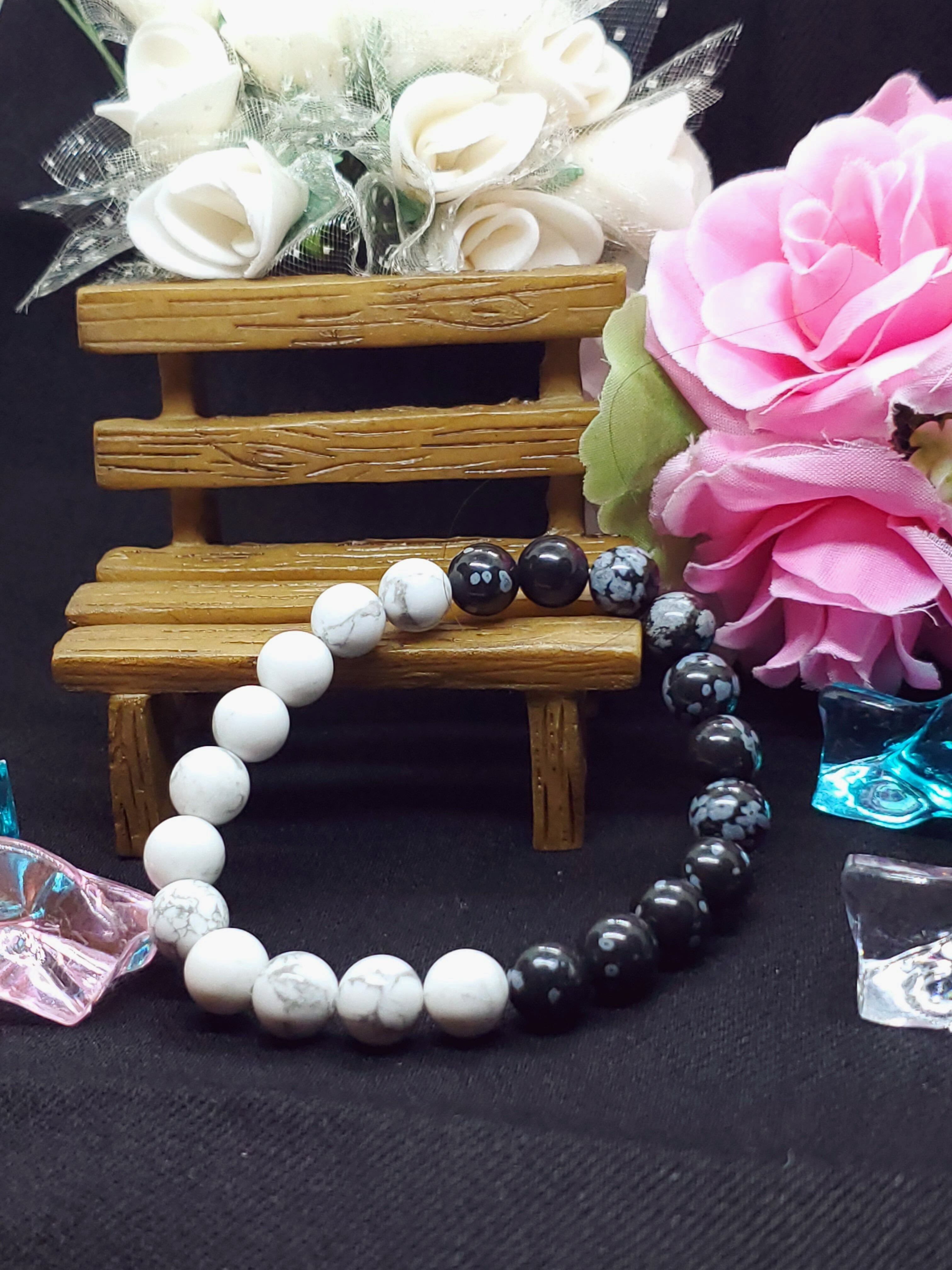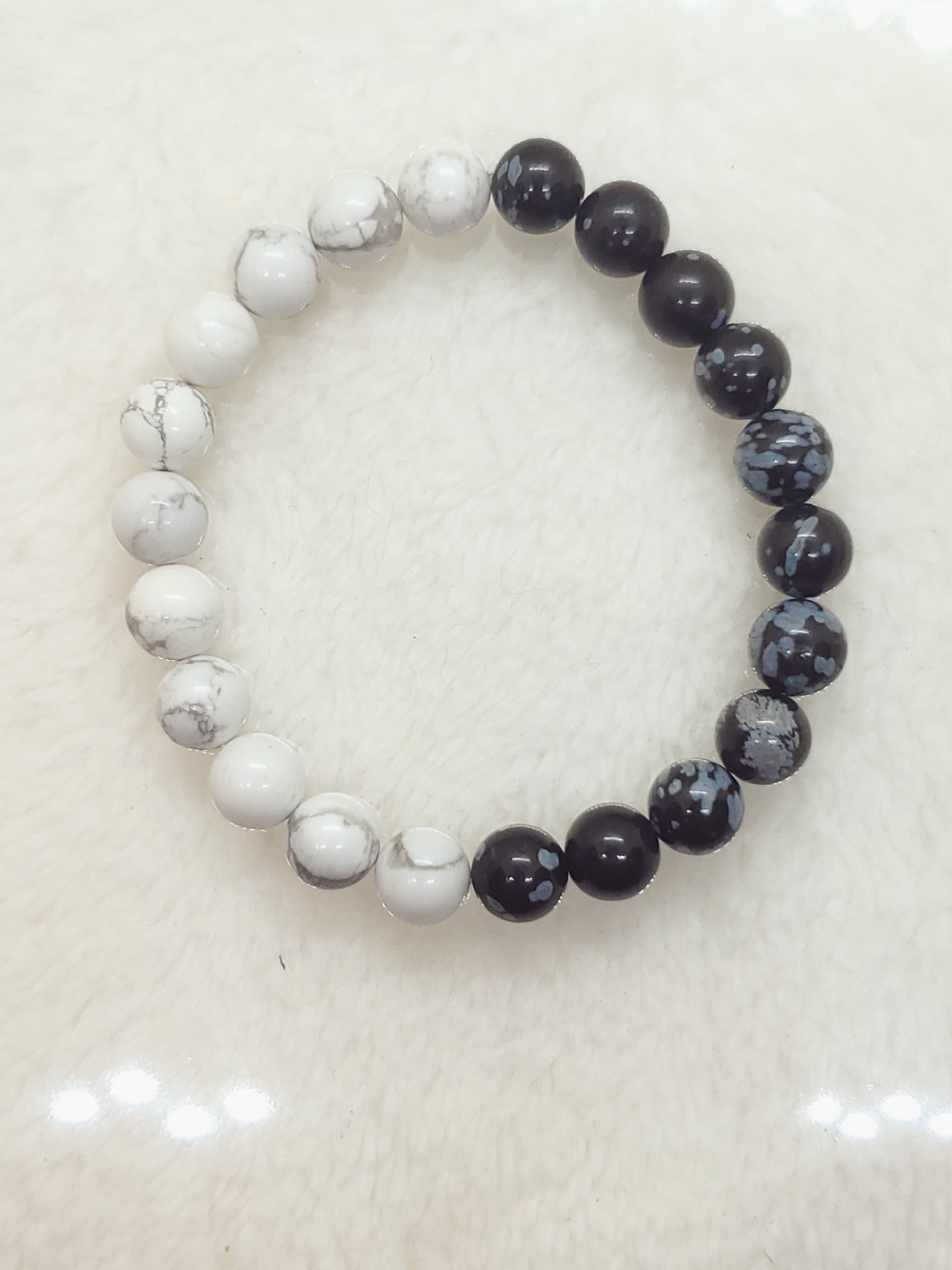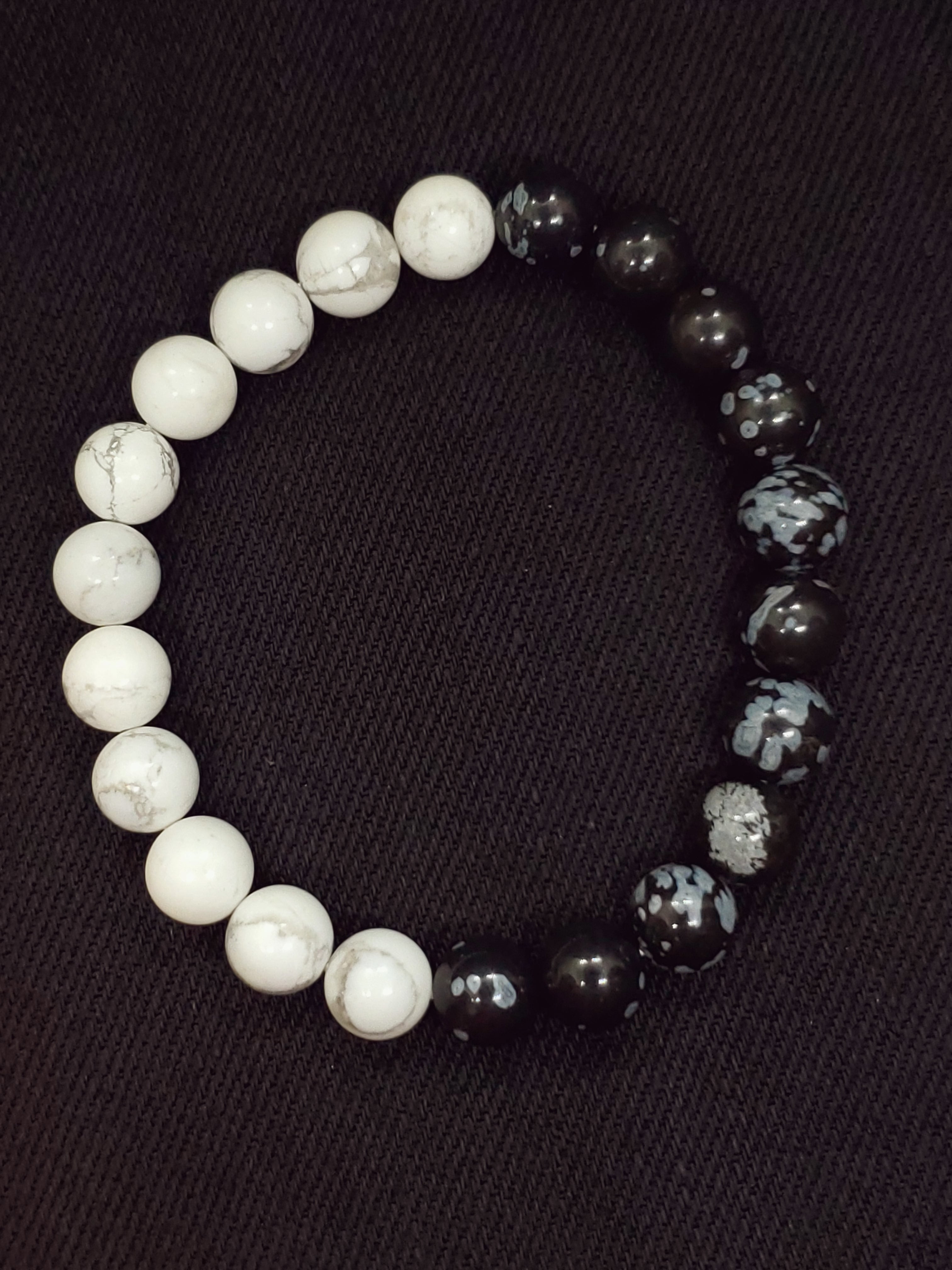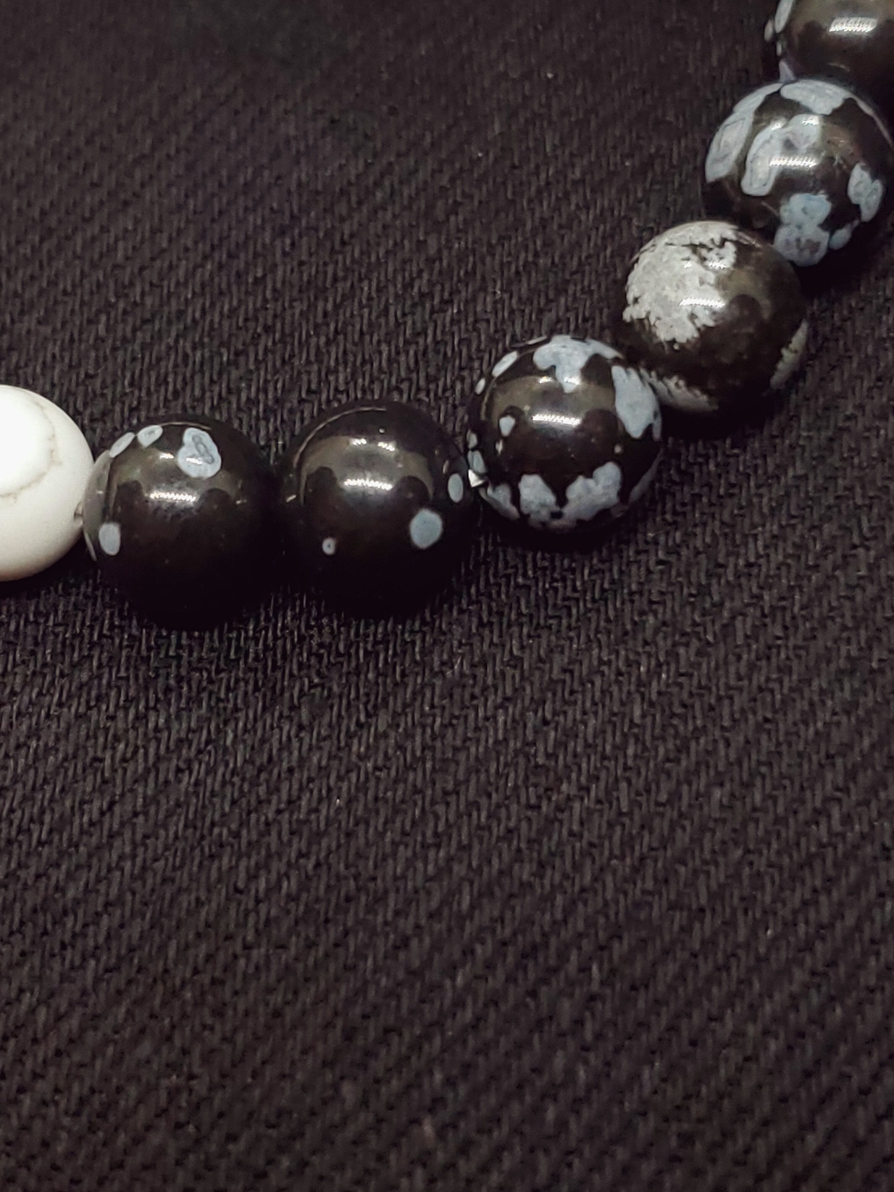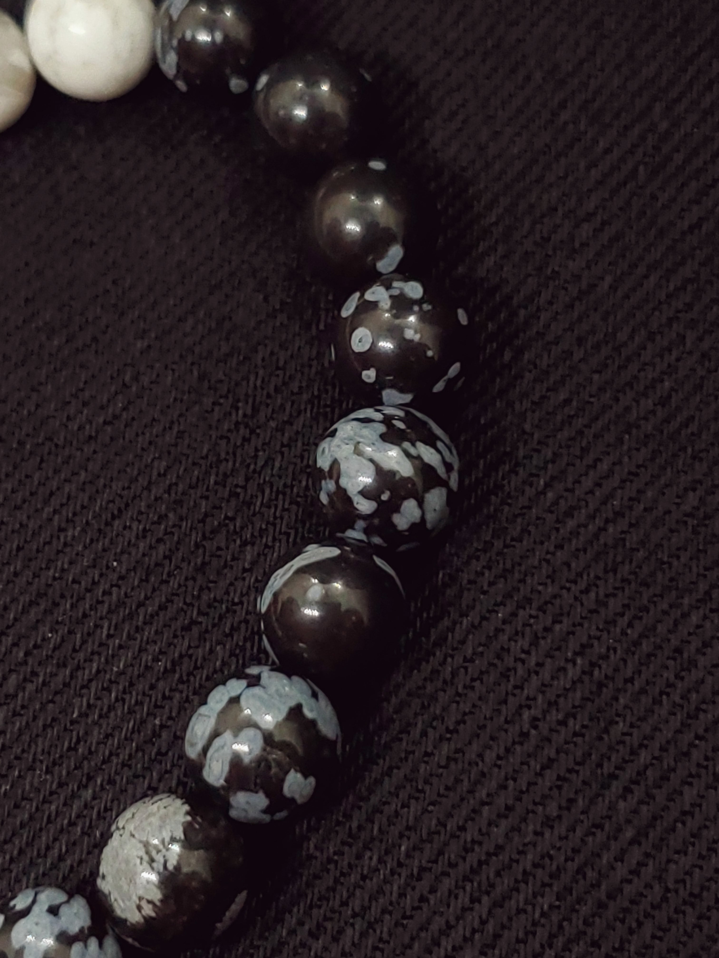 白ベースにグレーのラインが入ったハウライト(マグネサイト)と、黒ベースにグレーの粉雪のような模様が入ったスノーフレークオブシディアンを左右非対称になるように組みました!