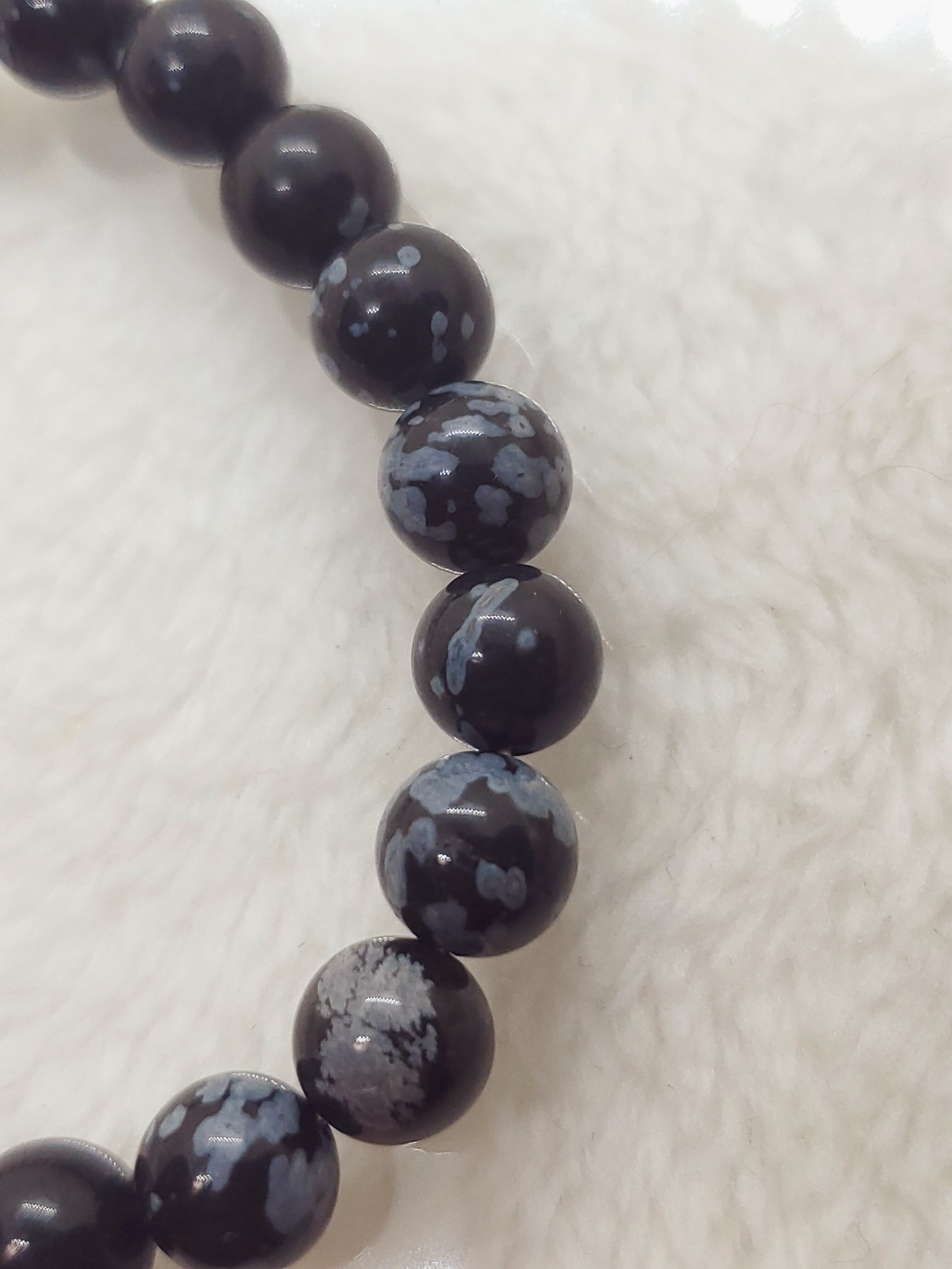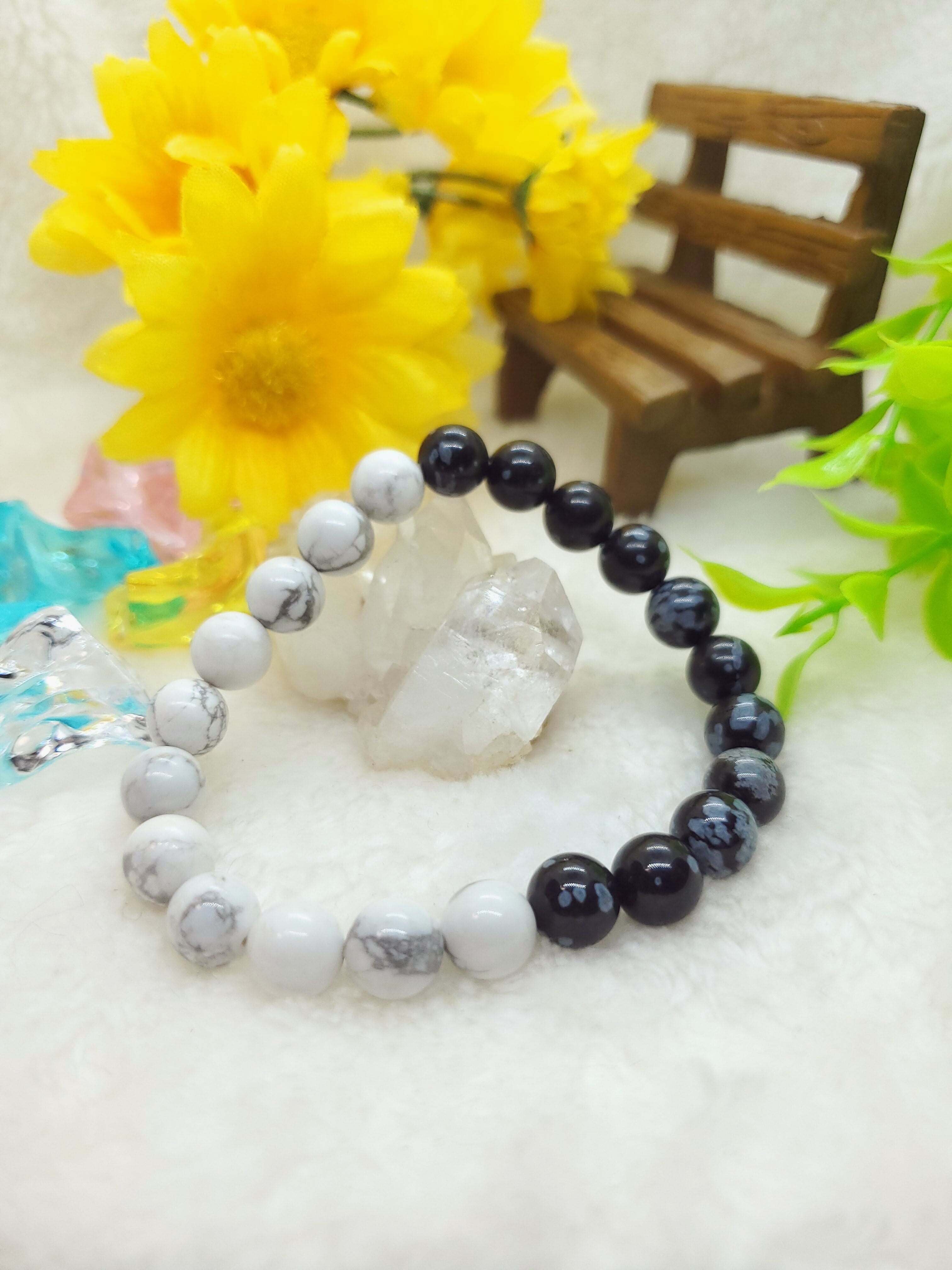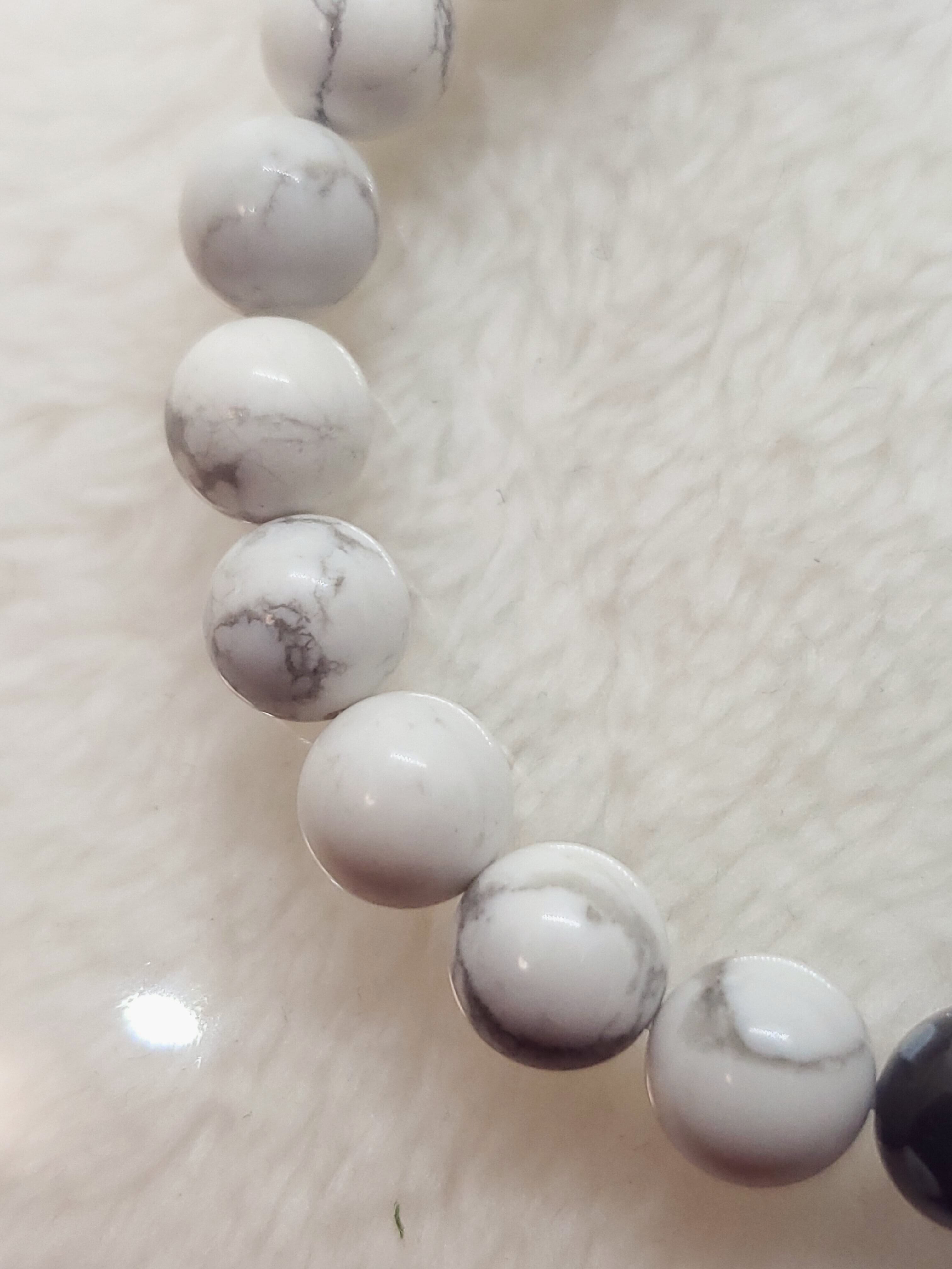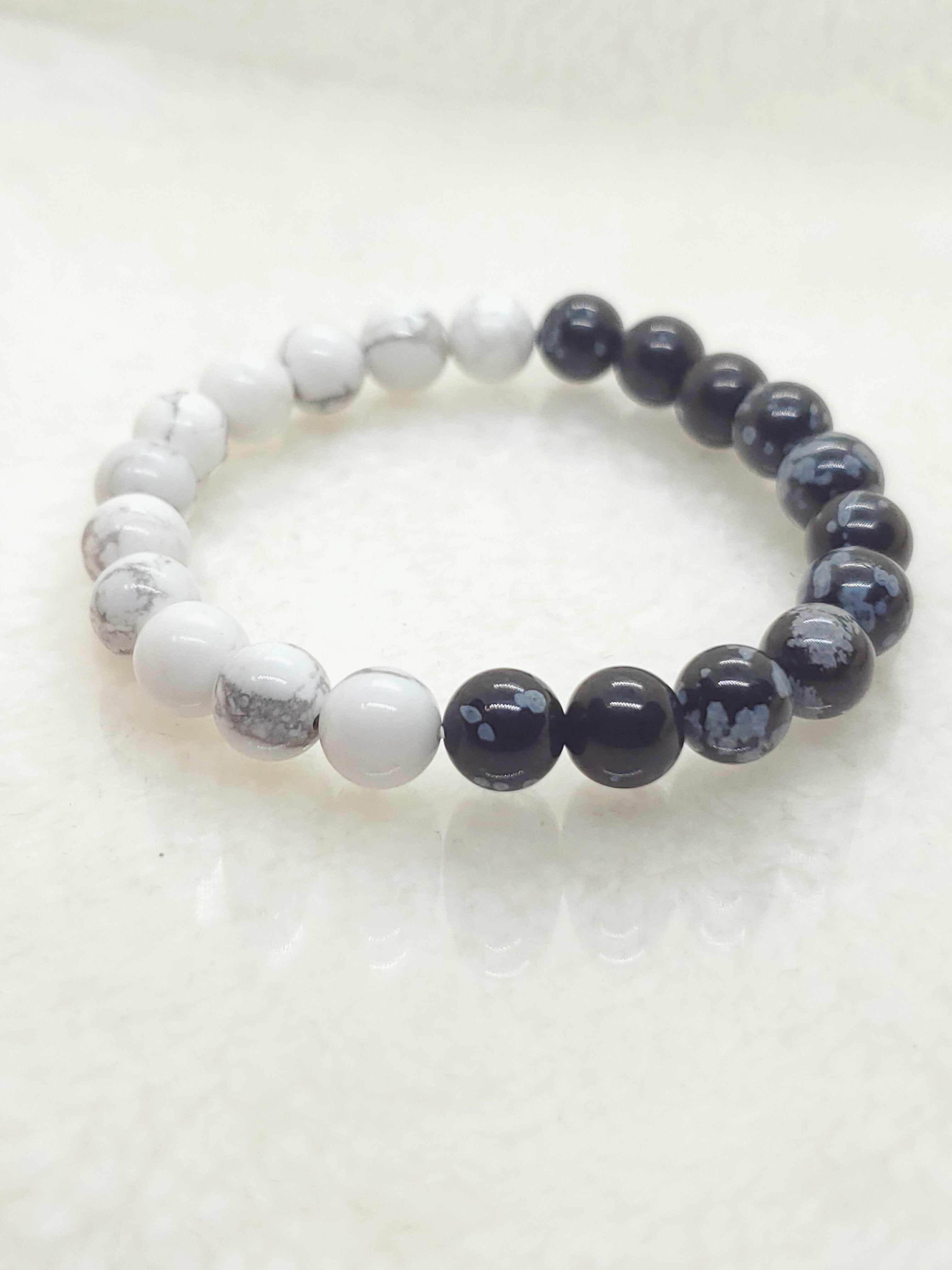 白ベースにグレーのラインが入ったハウライト(マグネサイト)と、黒ベースにグレーの粉雪のような模様が入ったスノーフレークオブシディアンを左右非対称になるように組みました!