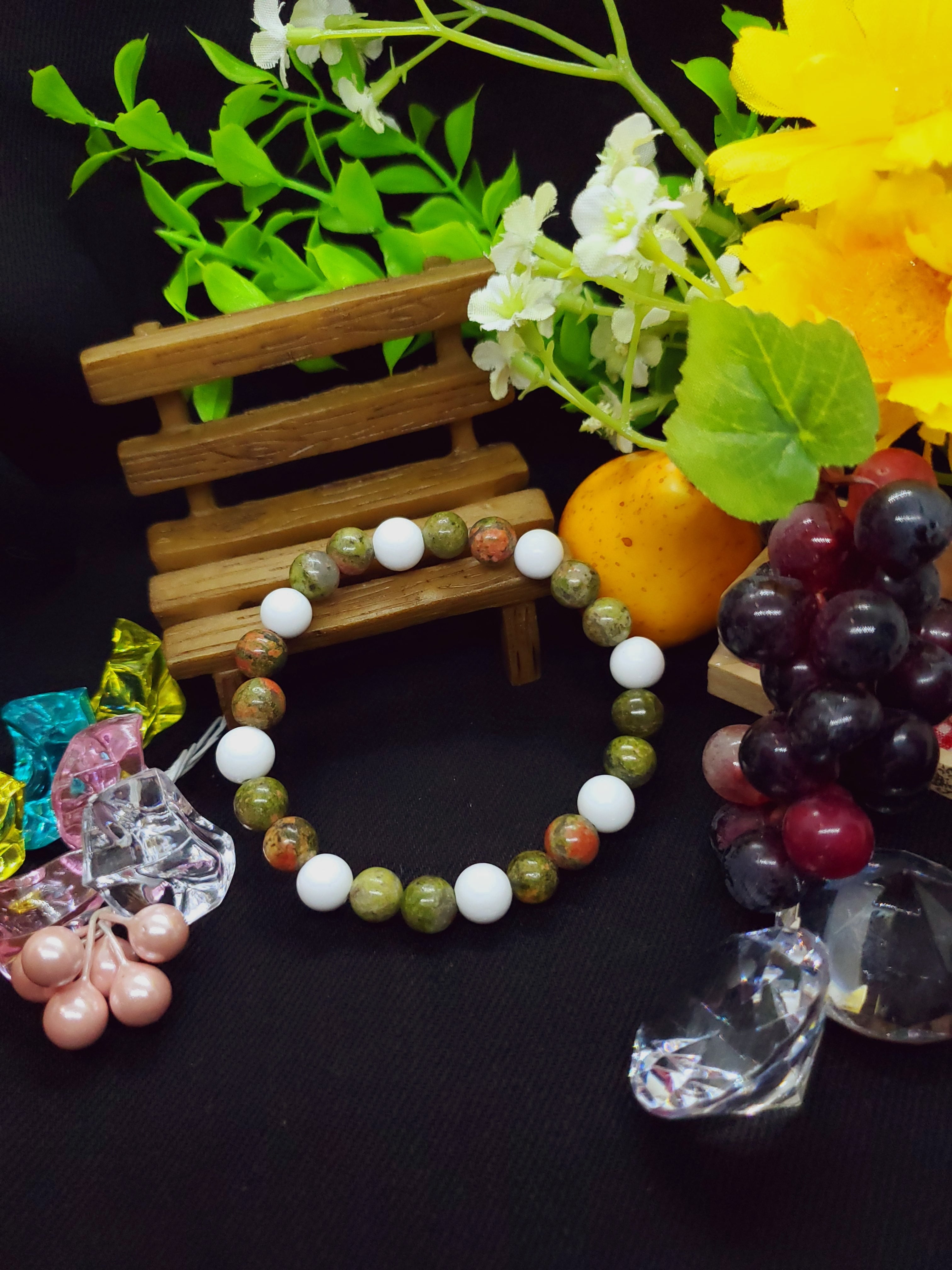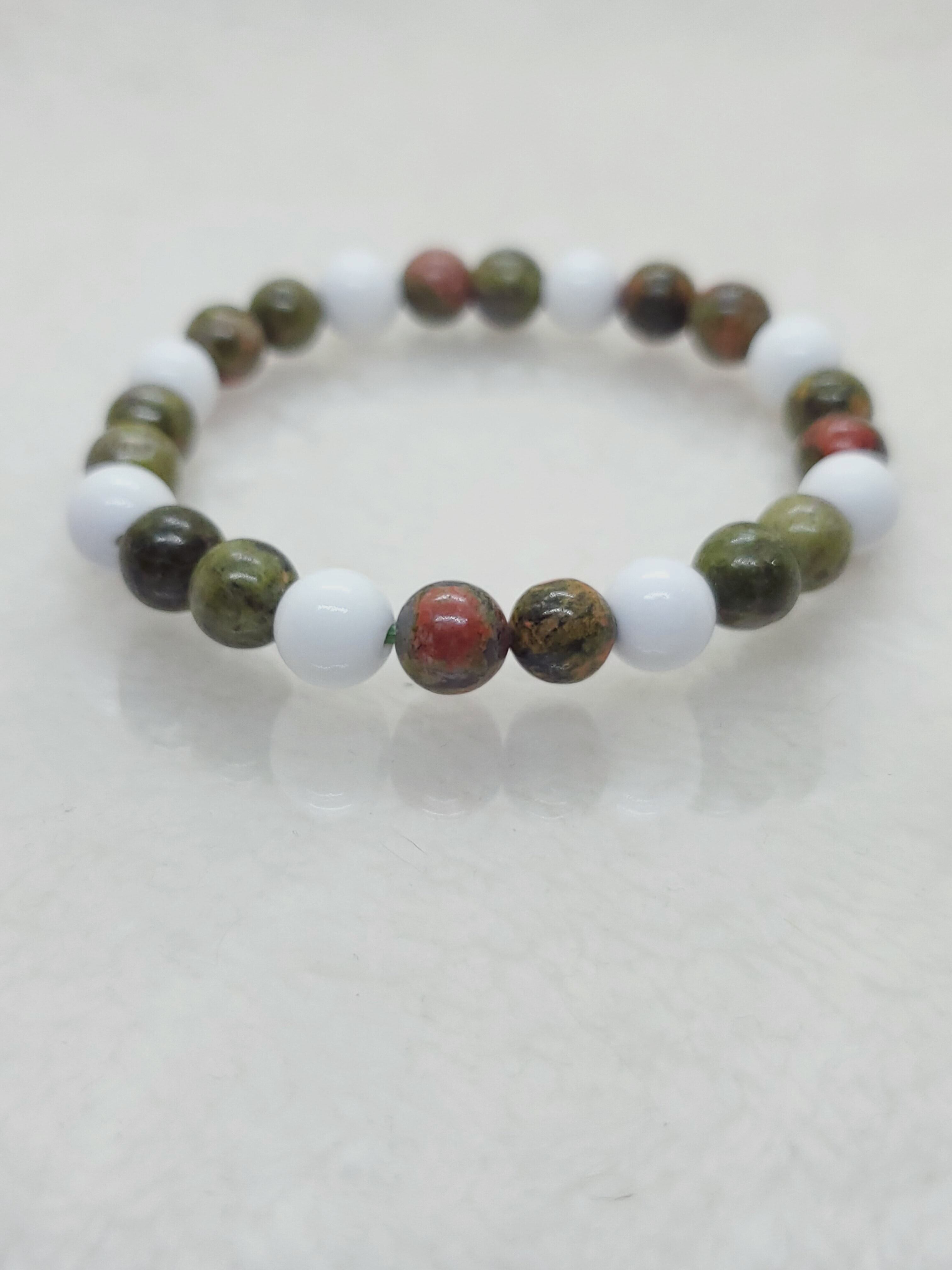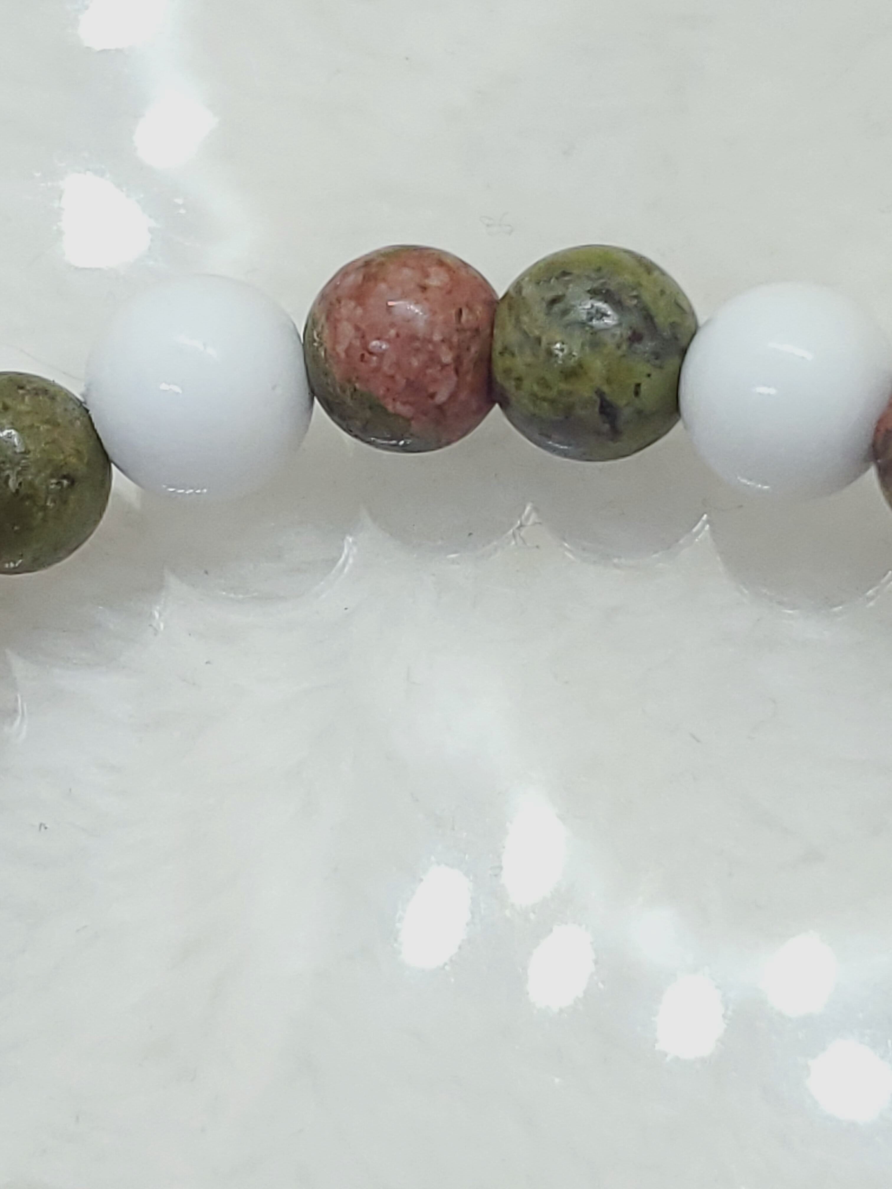 柔らかい緑色に赤ピンク色のアクセントが素敵なユナカイトのブレスレットです