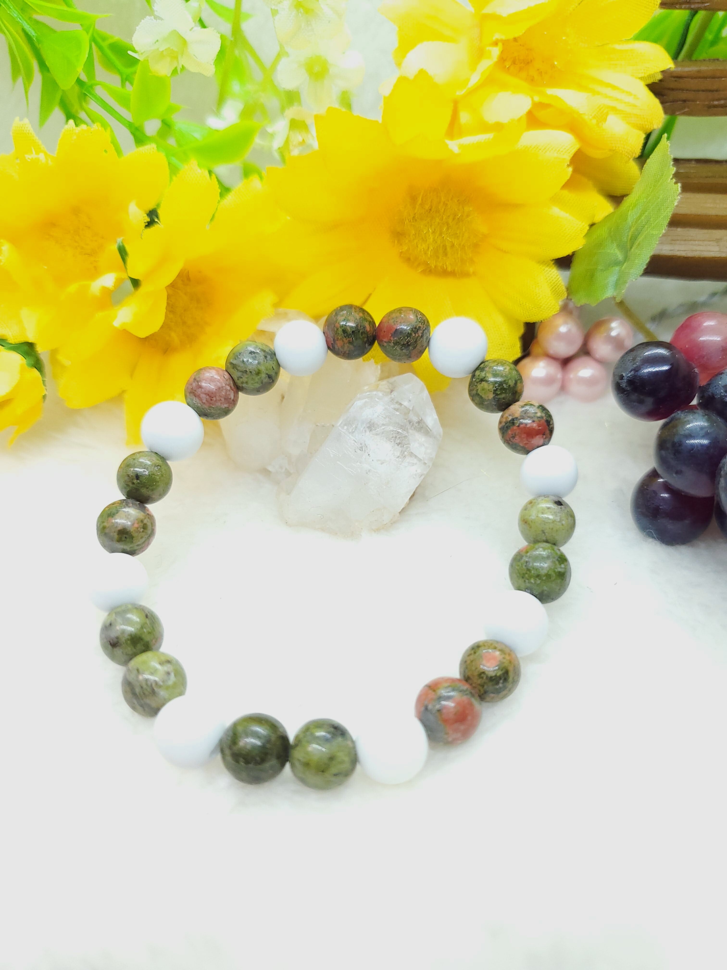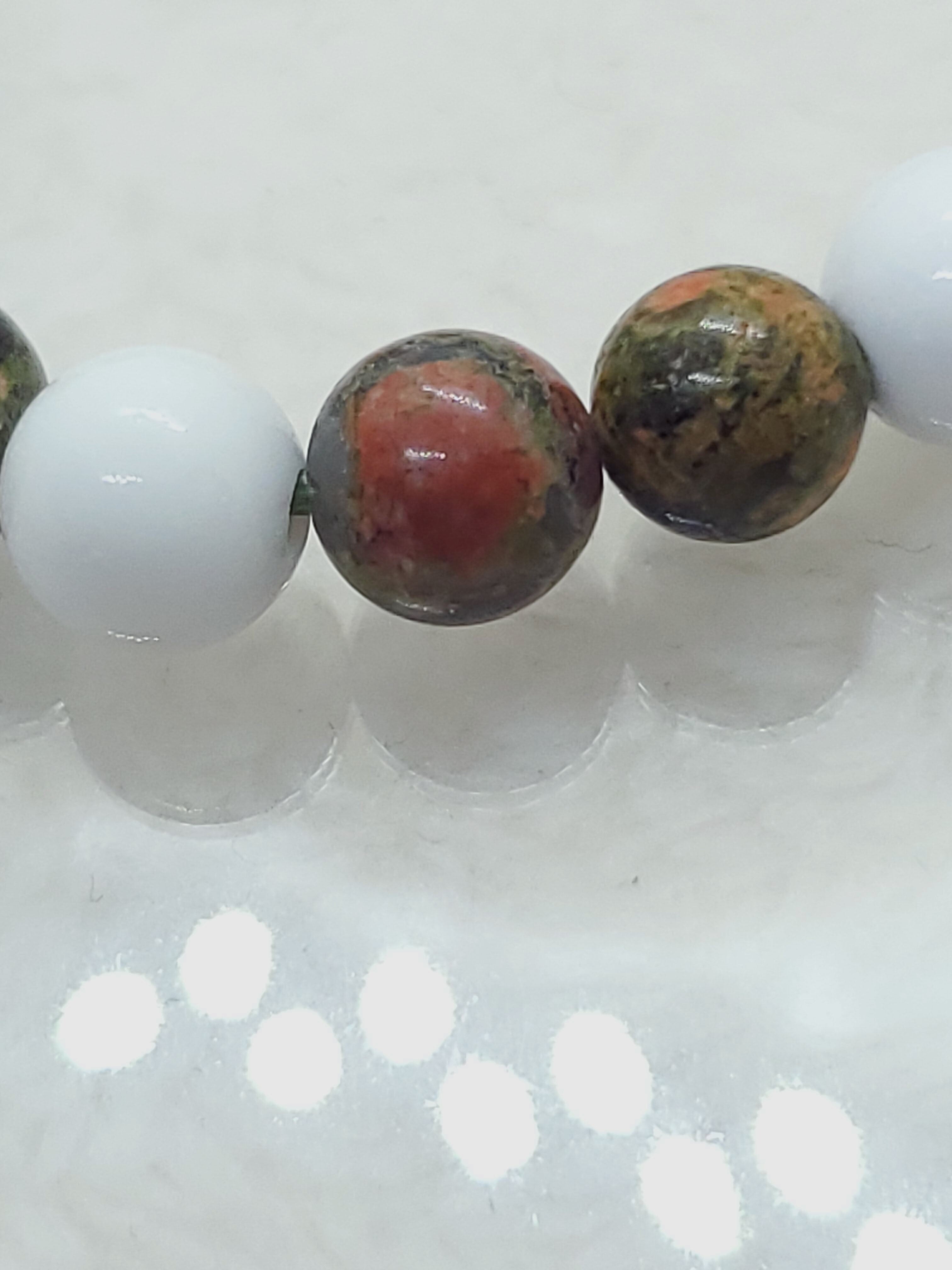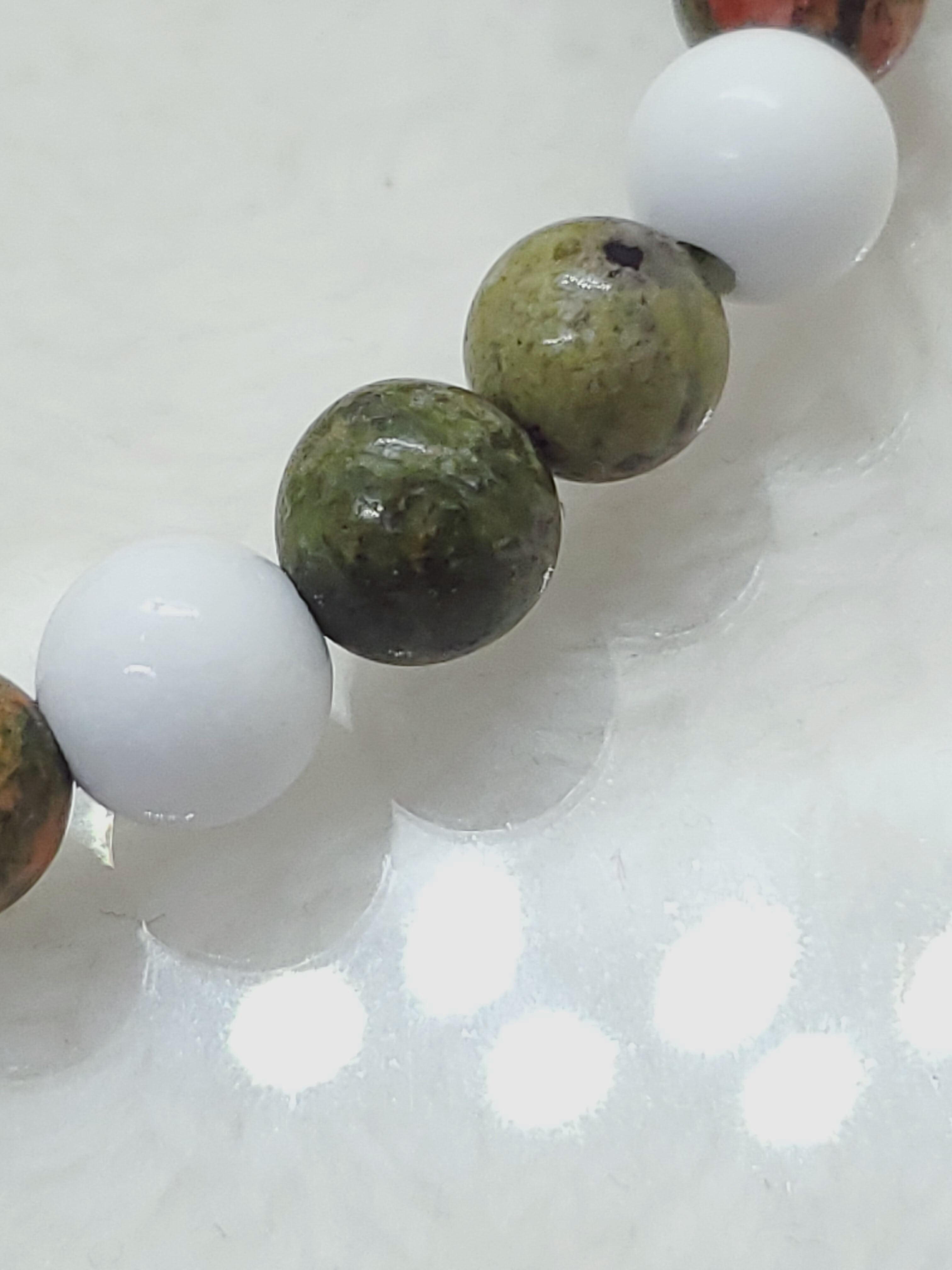 柔らかい緑色に赤ピンク色のアクセントが素敵なユナカイトのブレスレットです