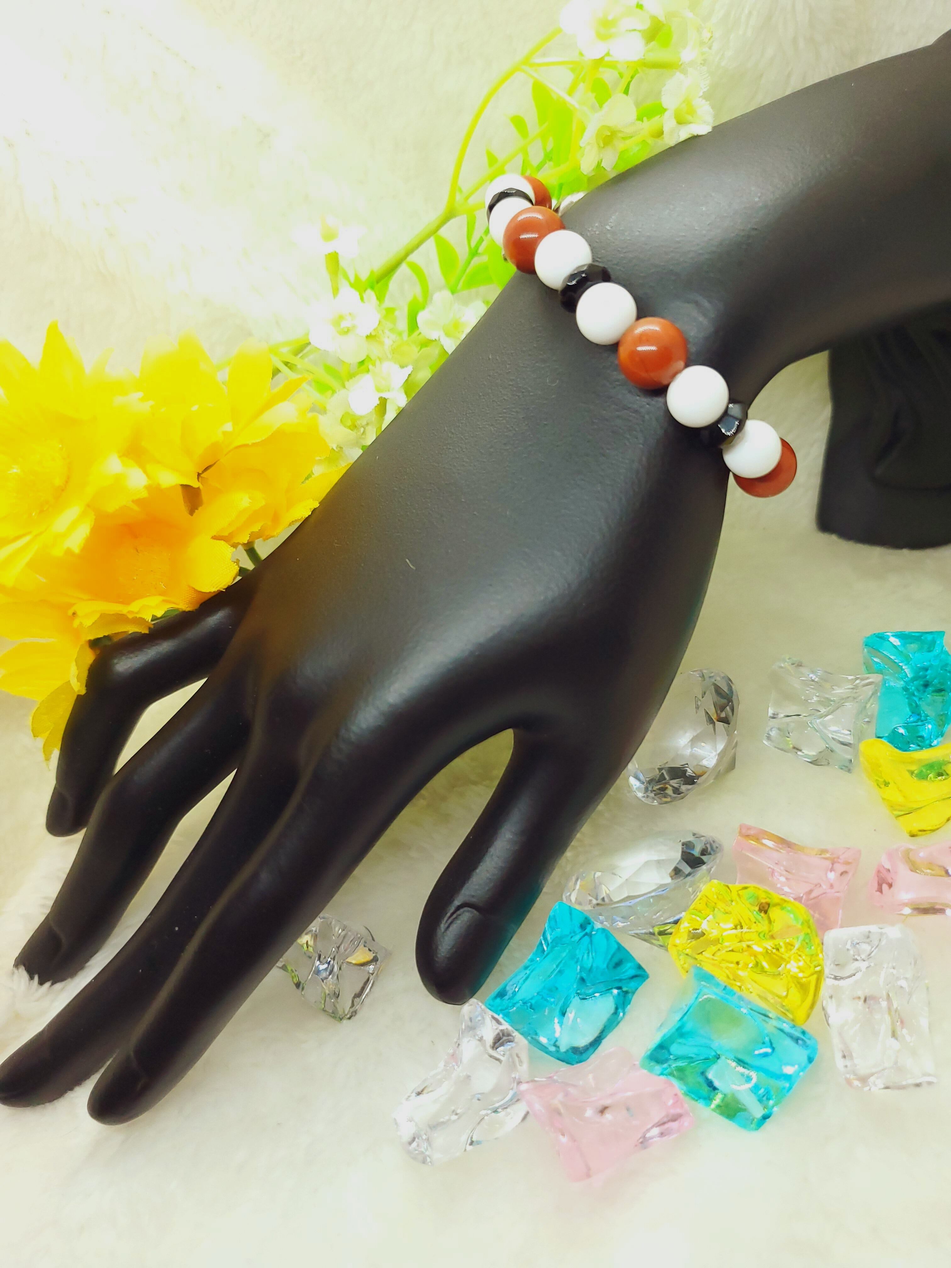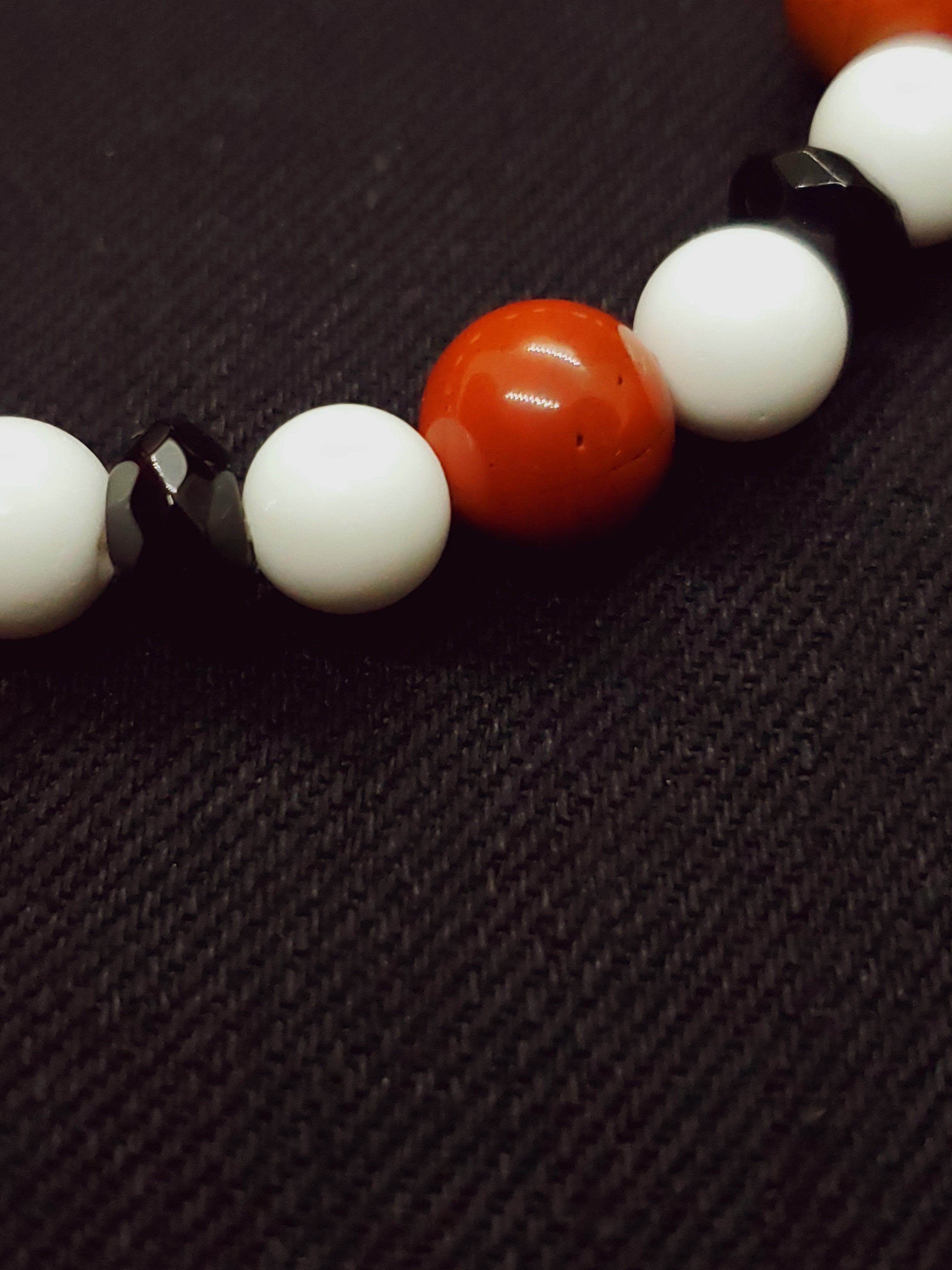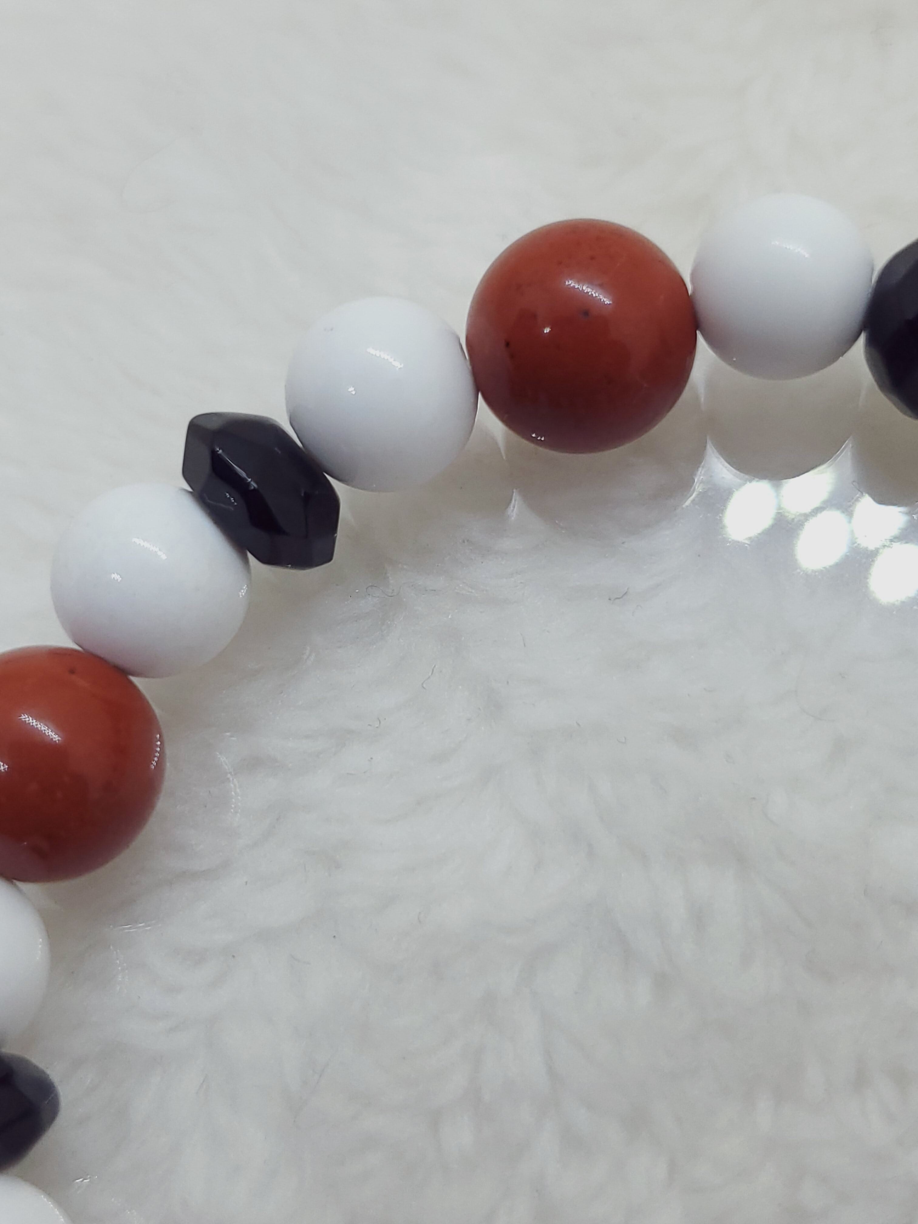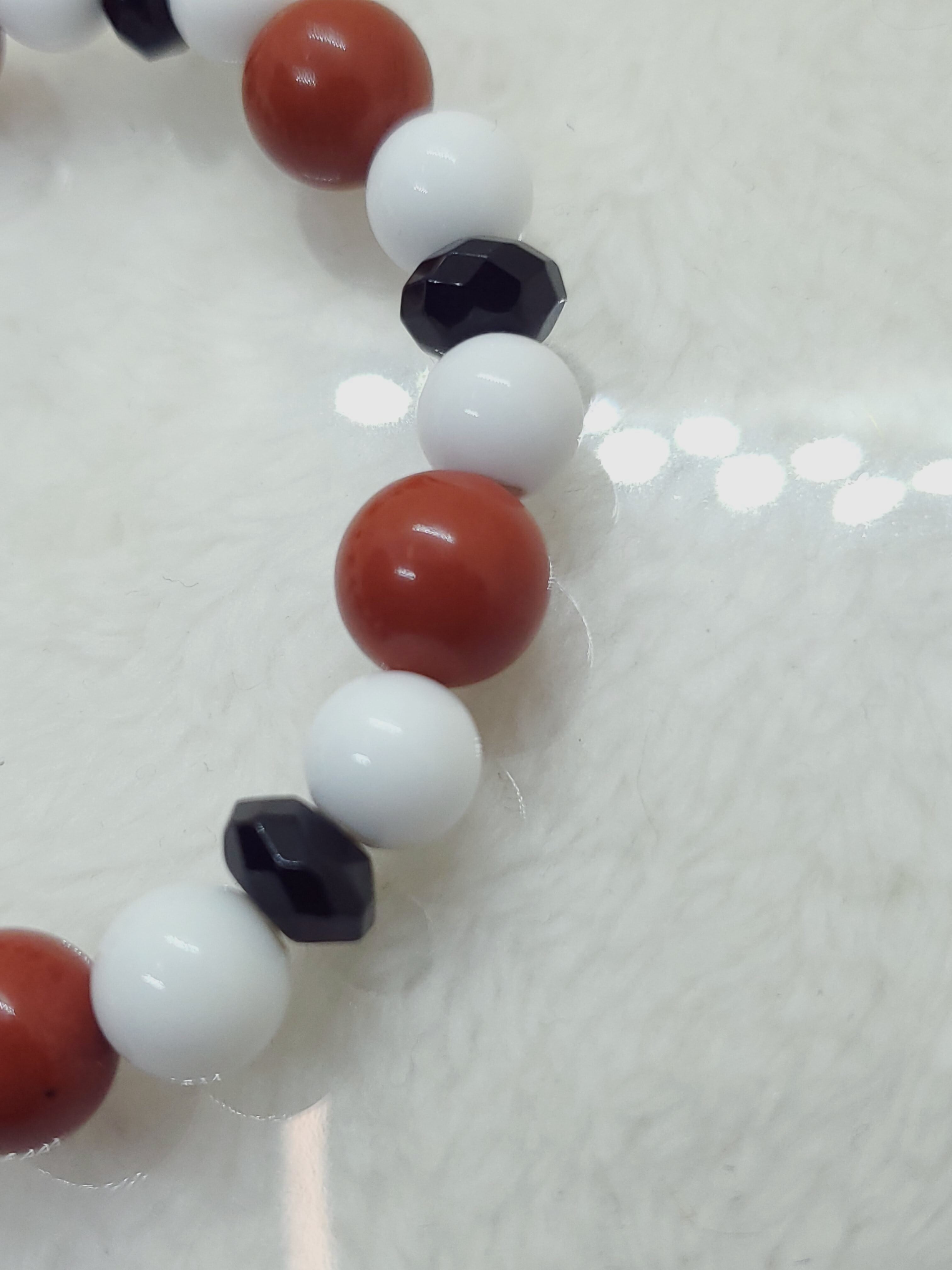落ち着いた赤色のレッドジャスパーと、オニキス白黒を組み合わせたコントラストが特徴になるブレスレットです