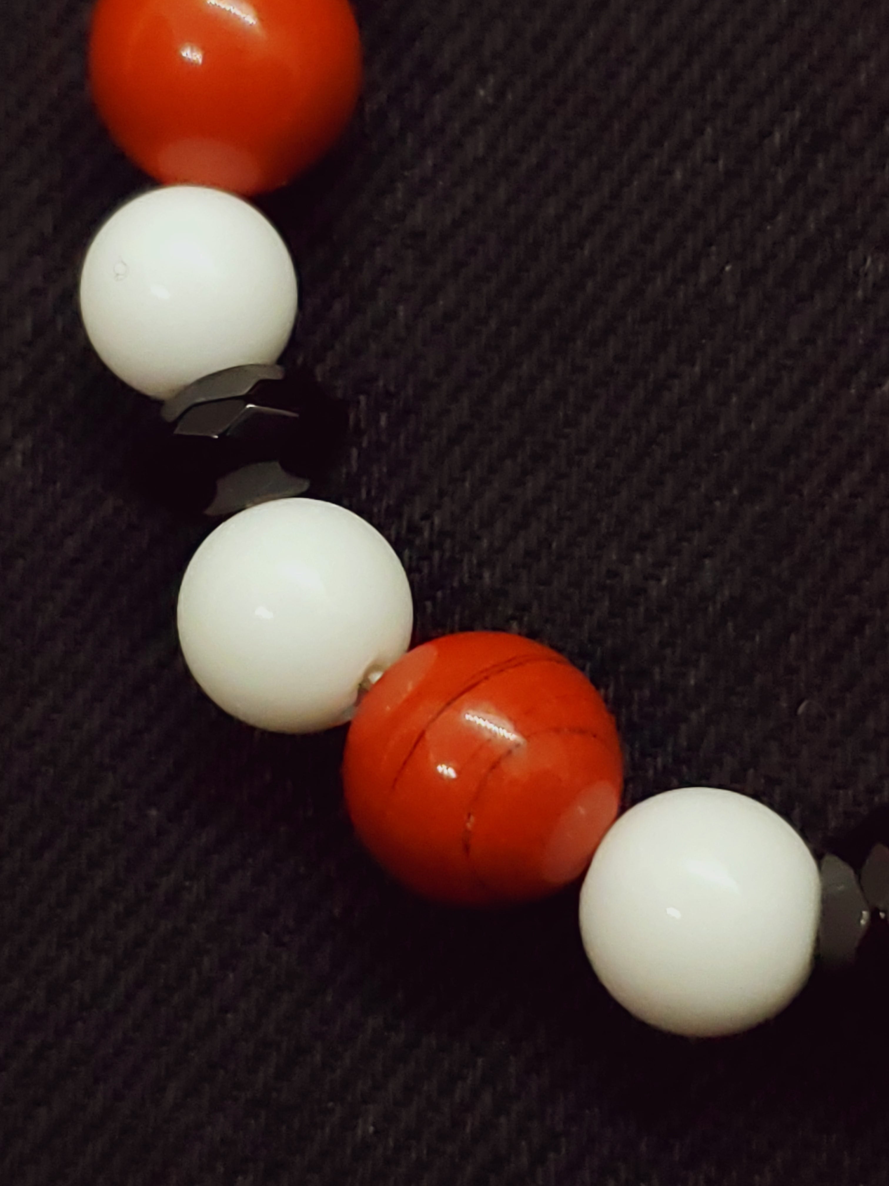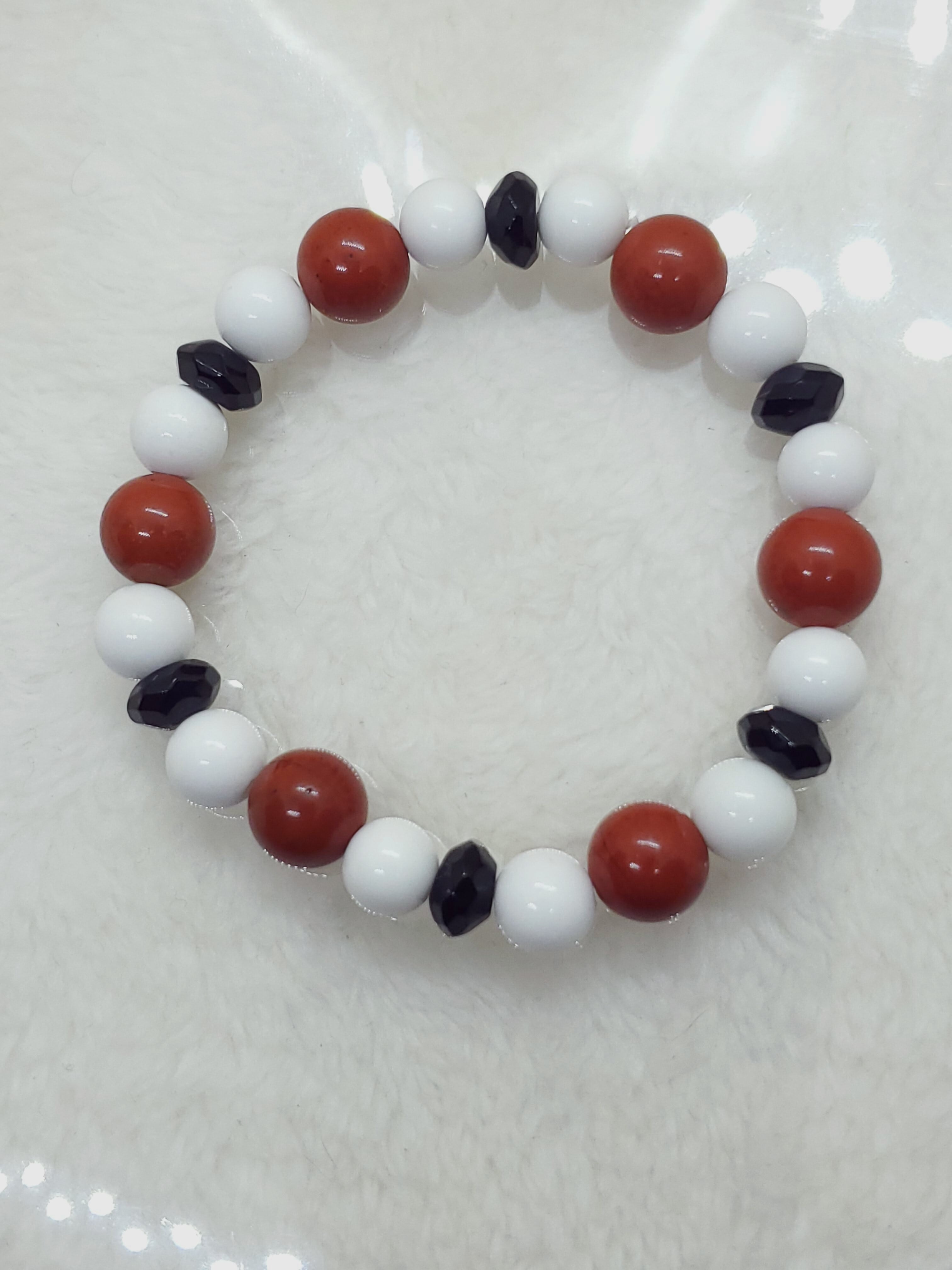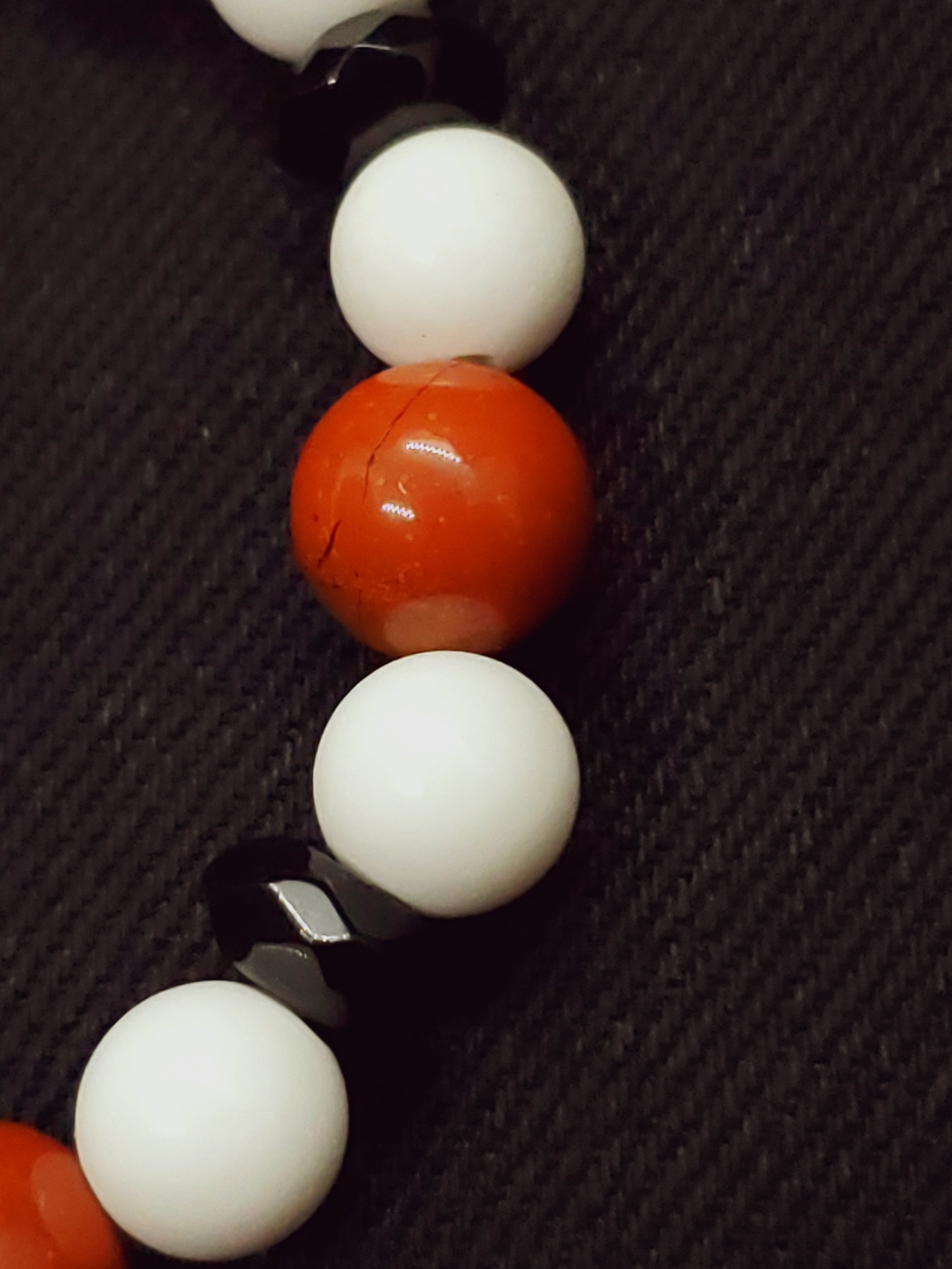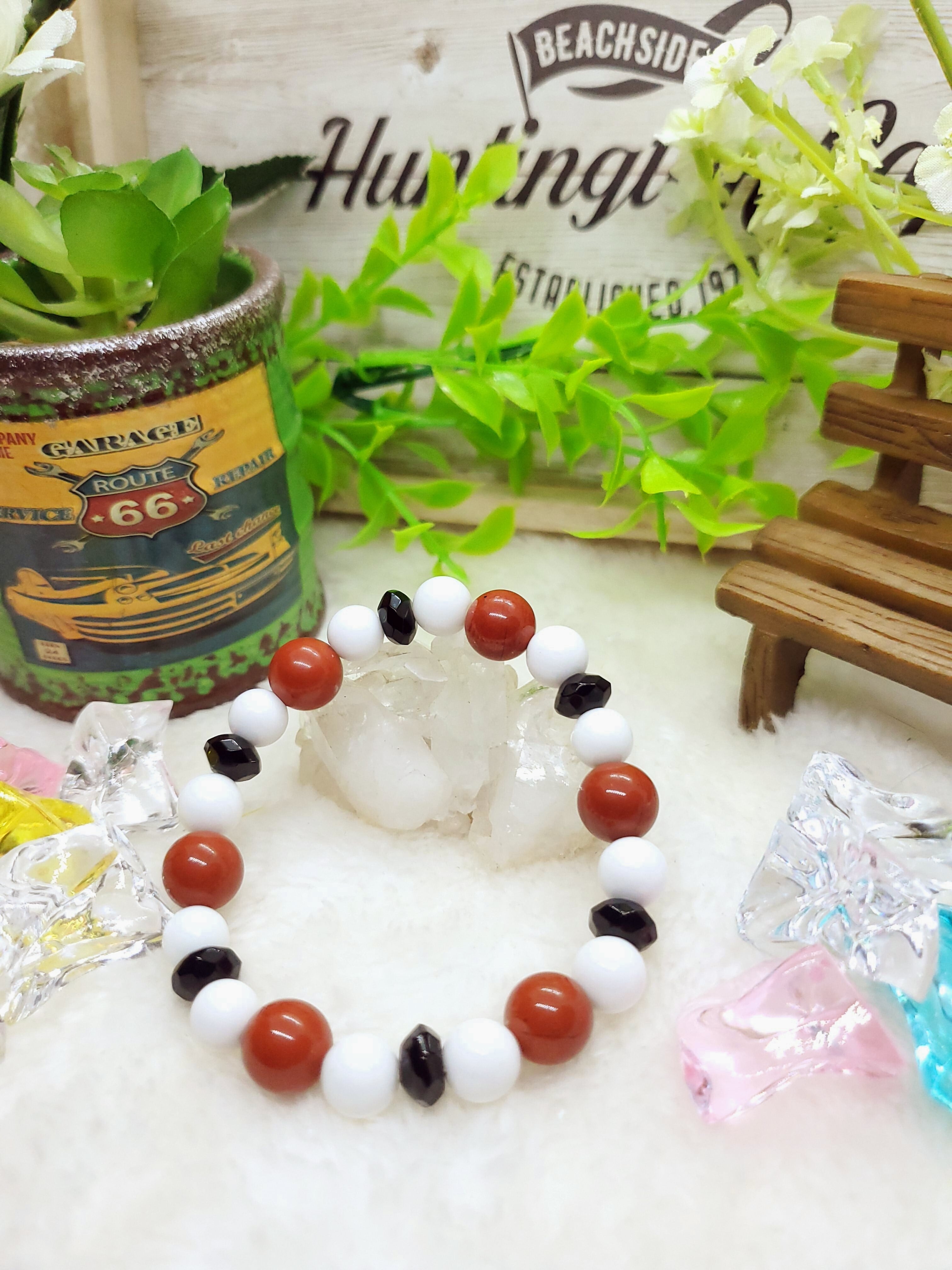 落ち着いた赤色のレッドジャスパーと、オニキス白黒を組み合わせたコントラストが特徴になるブレスレットです
