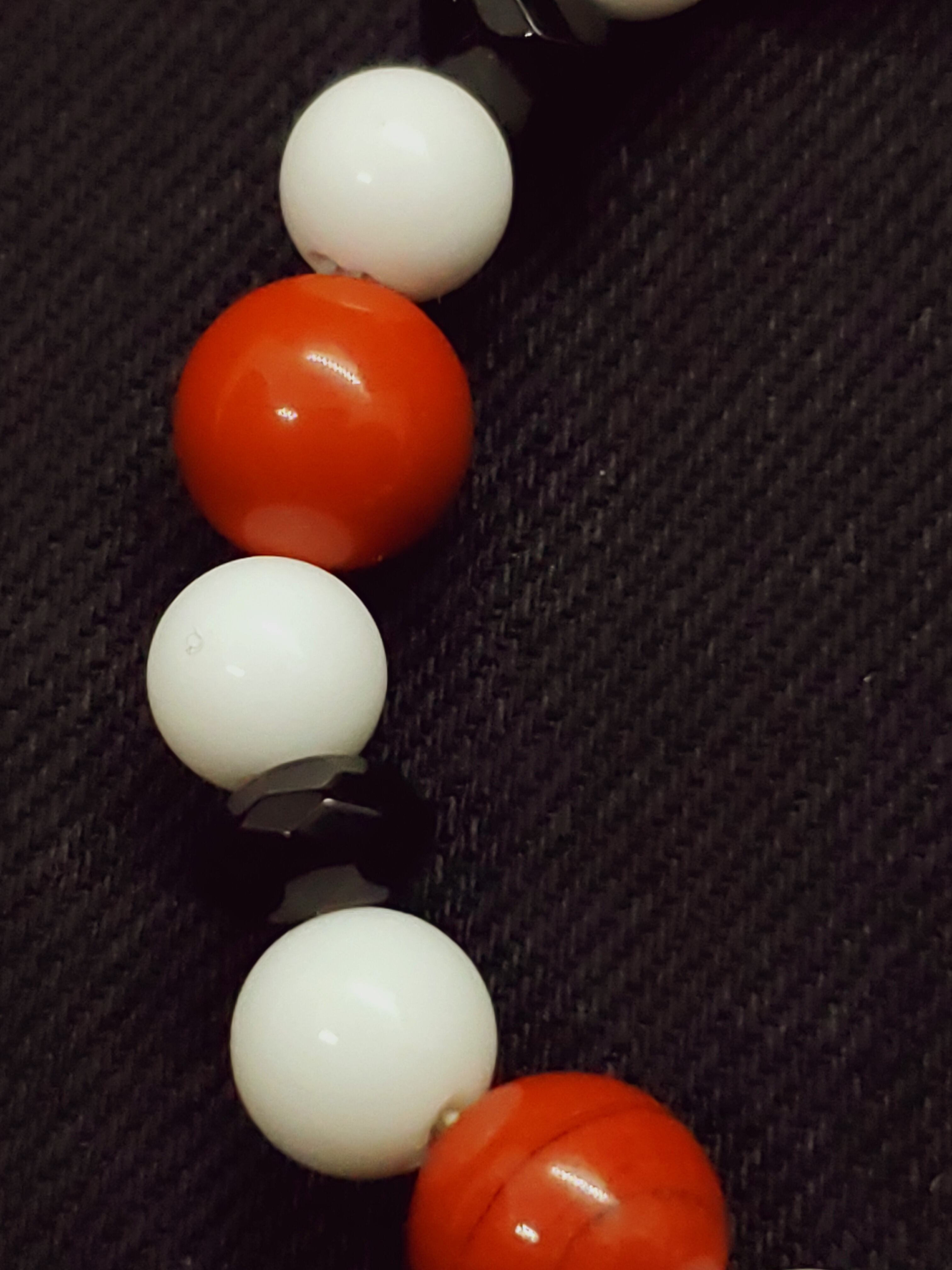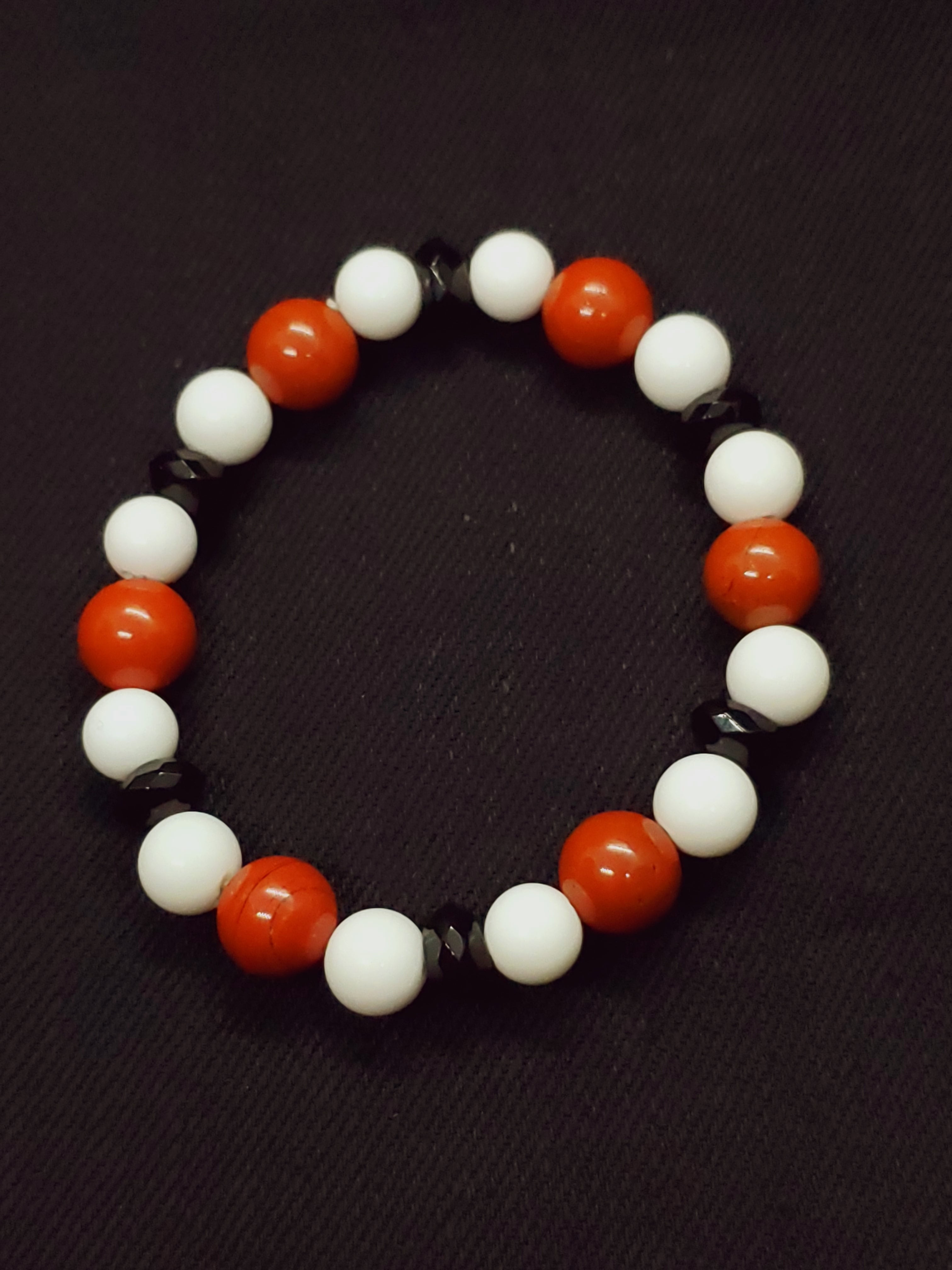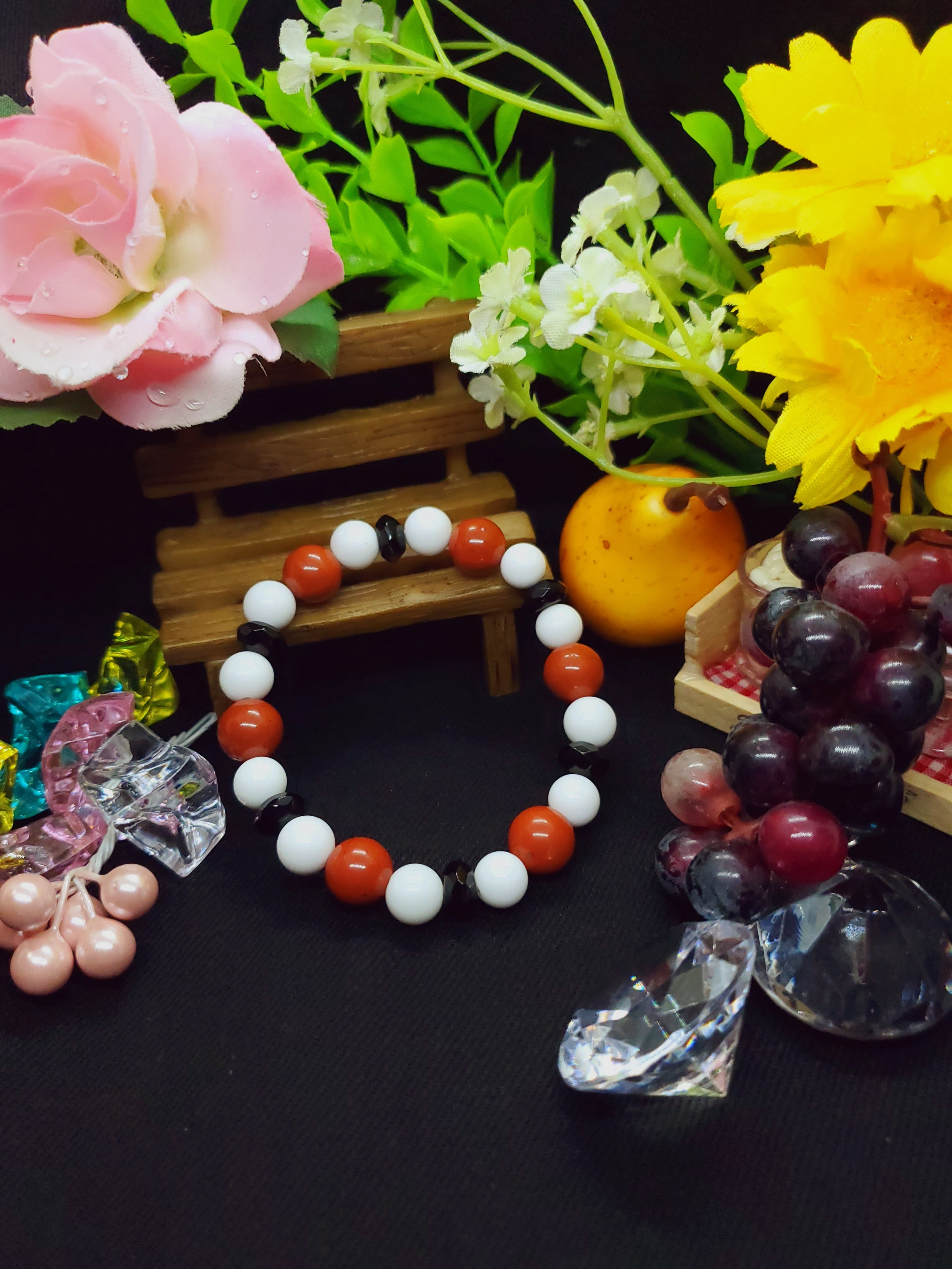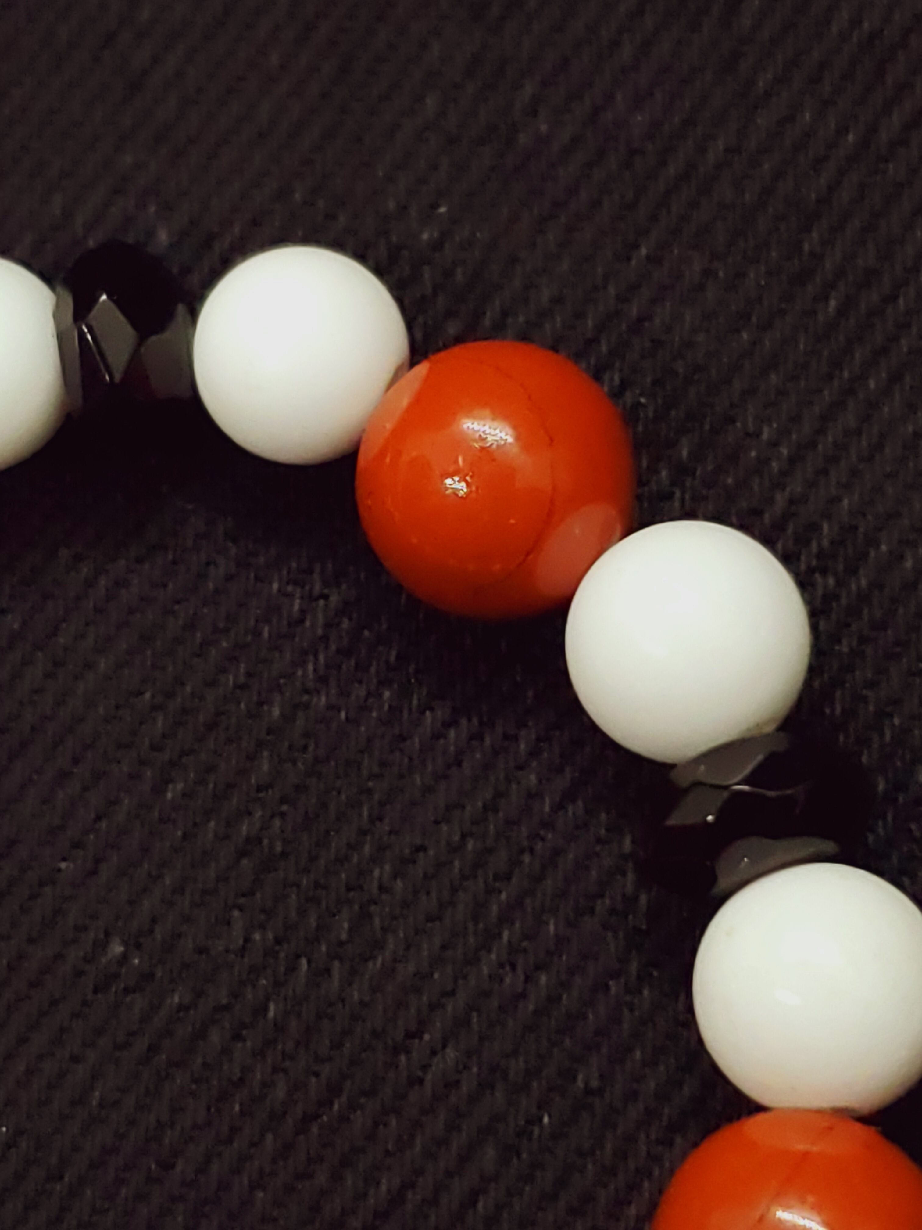 落ち着いた赤色のレッドジャスパーと、オニキス白黒を組み合わせたコントラストが特徴になるブレスレットです
