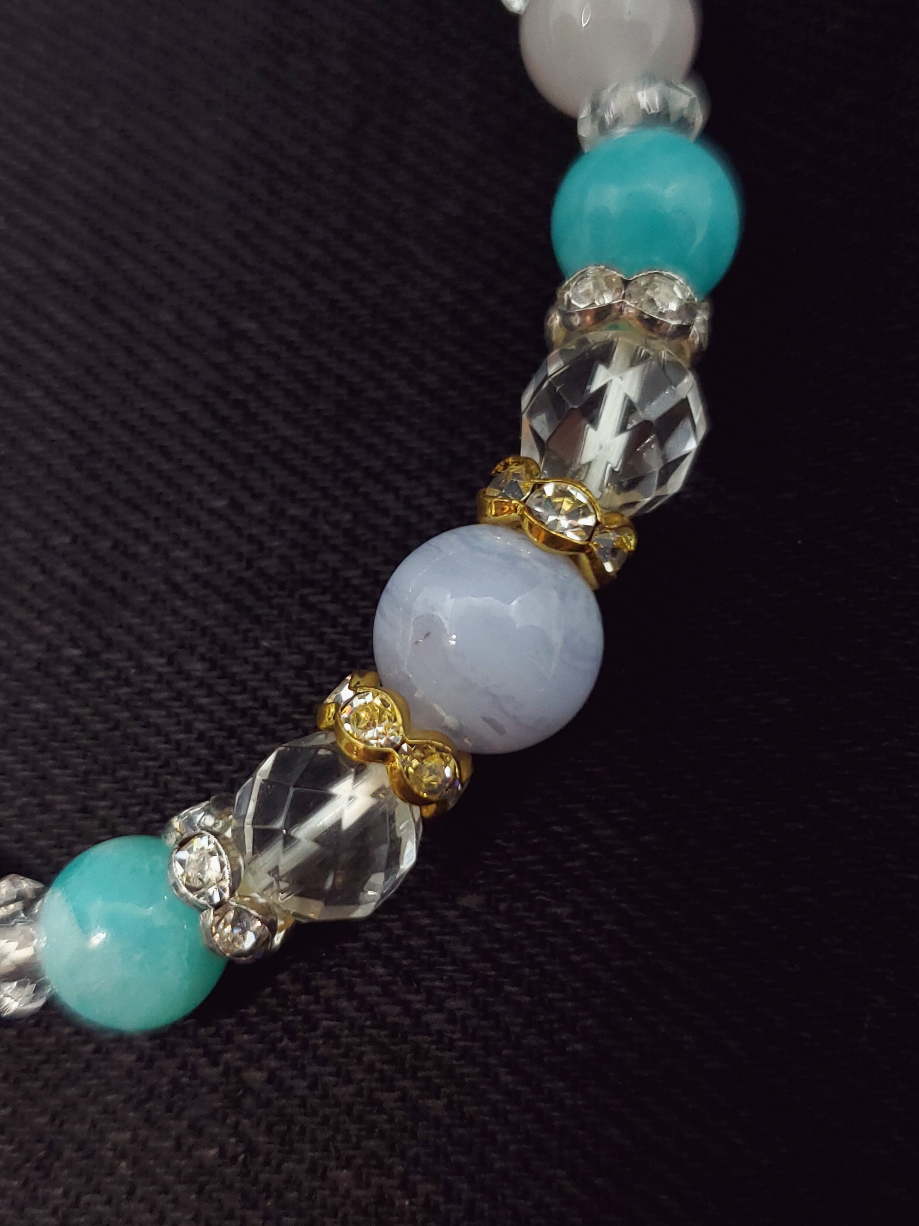 パワーストーン界では、ブルーレースアゲートは対人関係の調和、アマゾナイトは希望の象徴で、幸運を呼び、社交性をアップさせてポジティブな気持ちになれるといわれています。