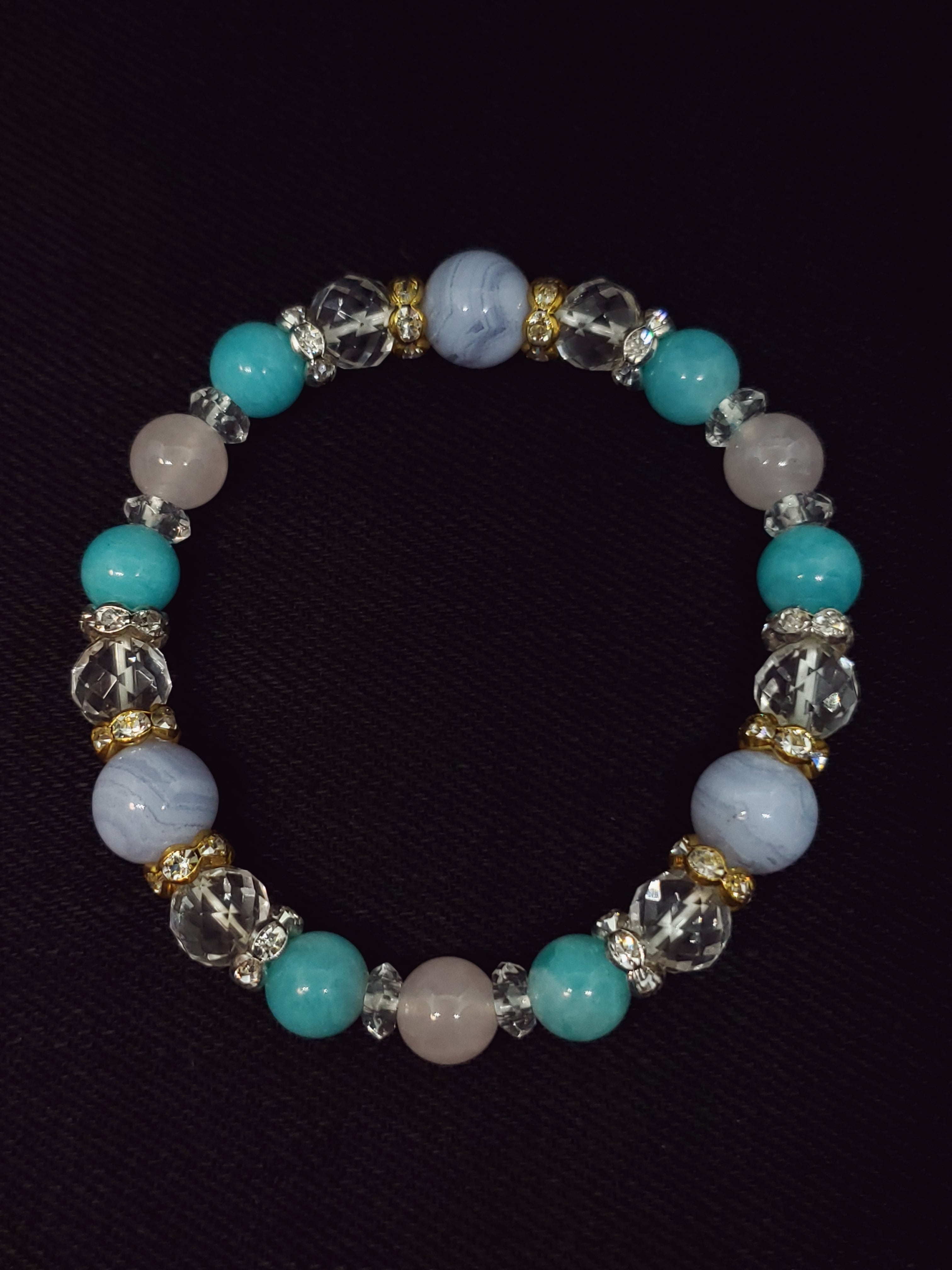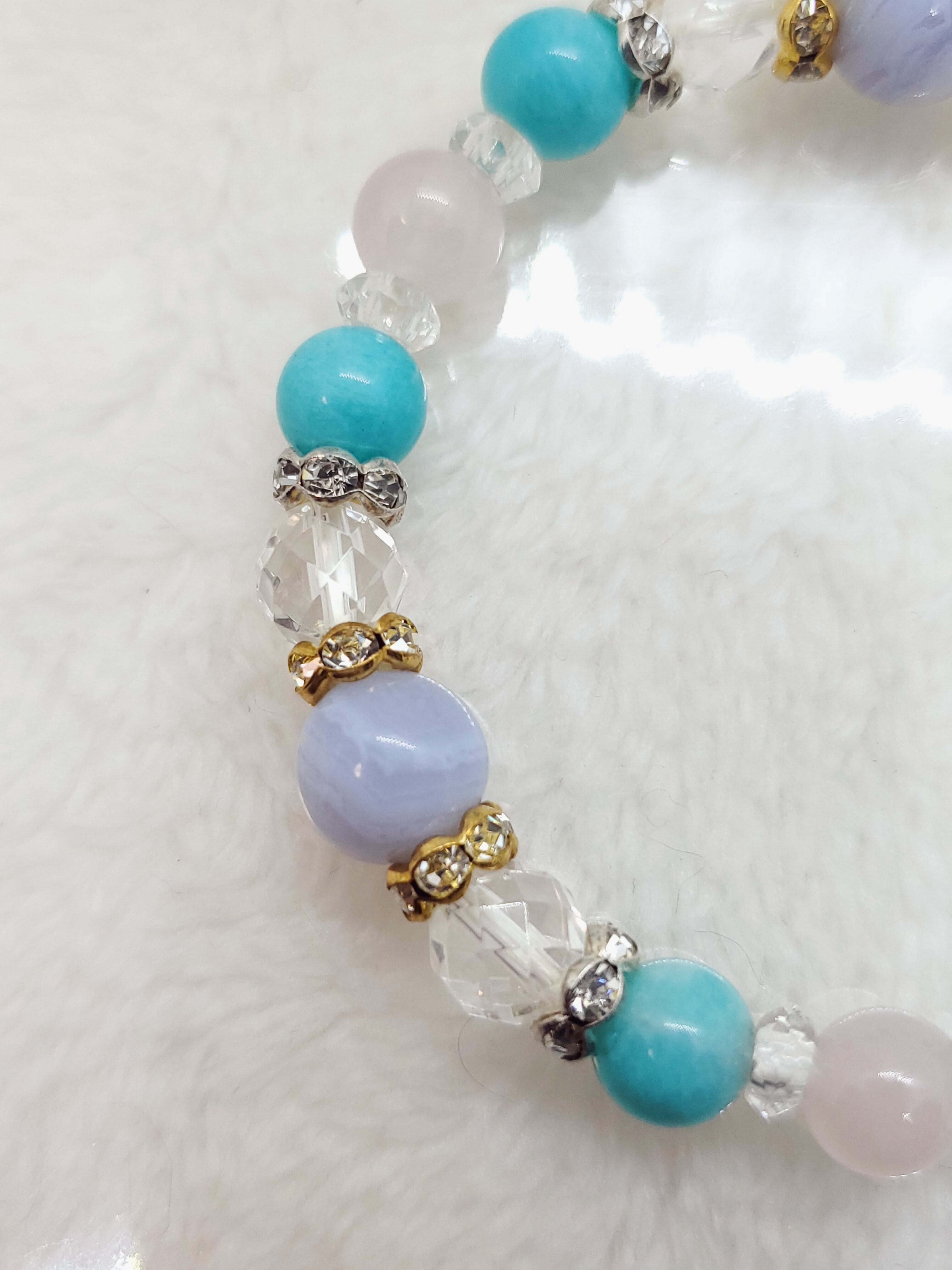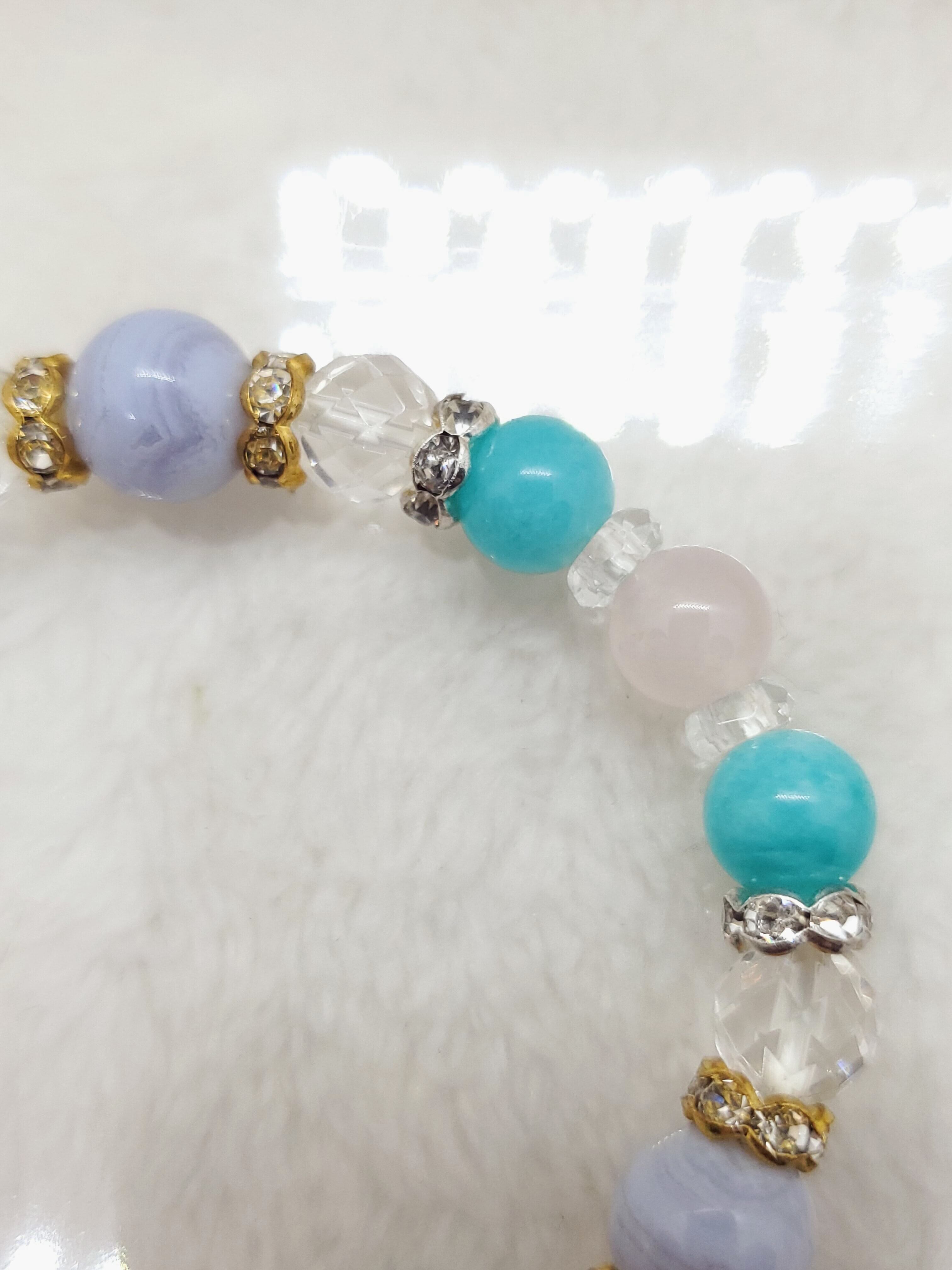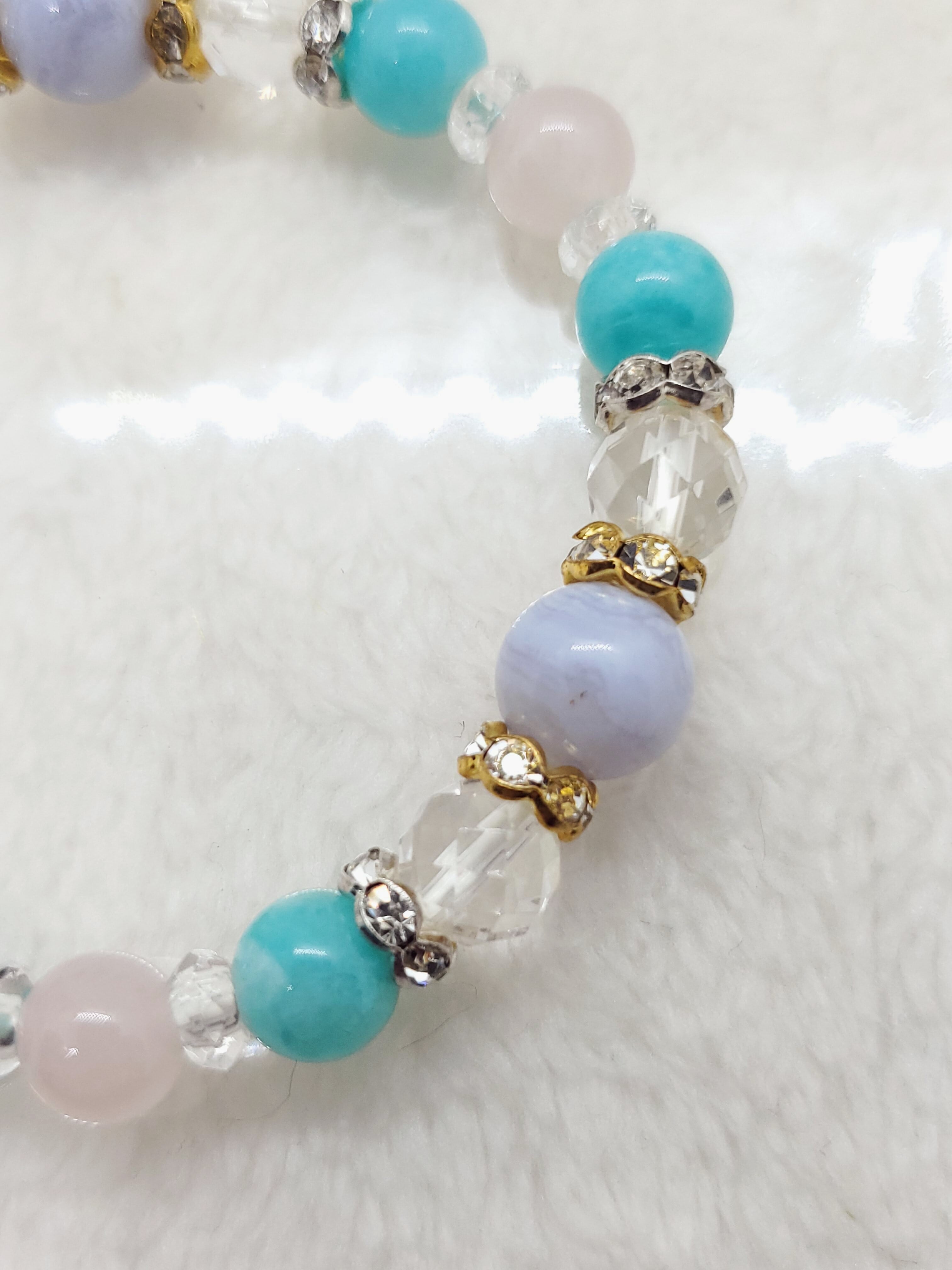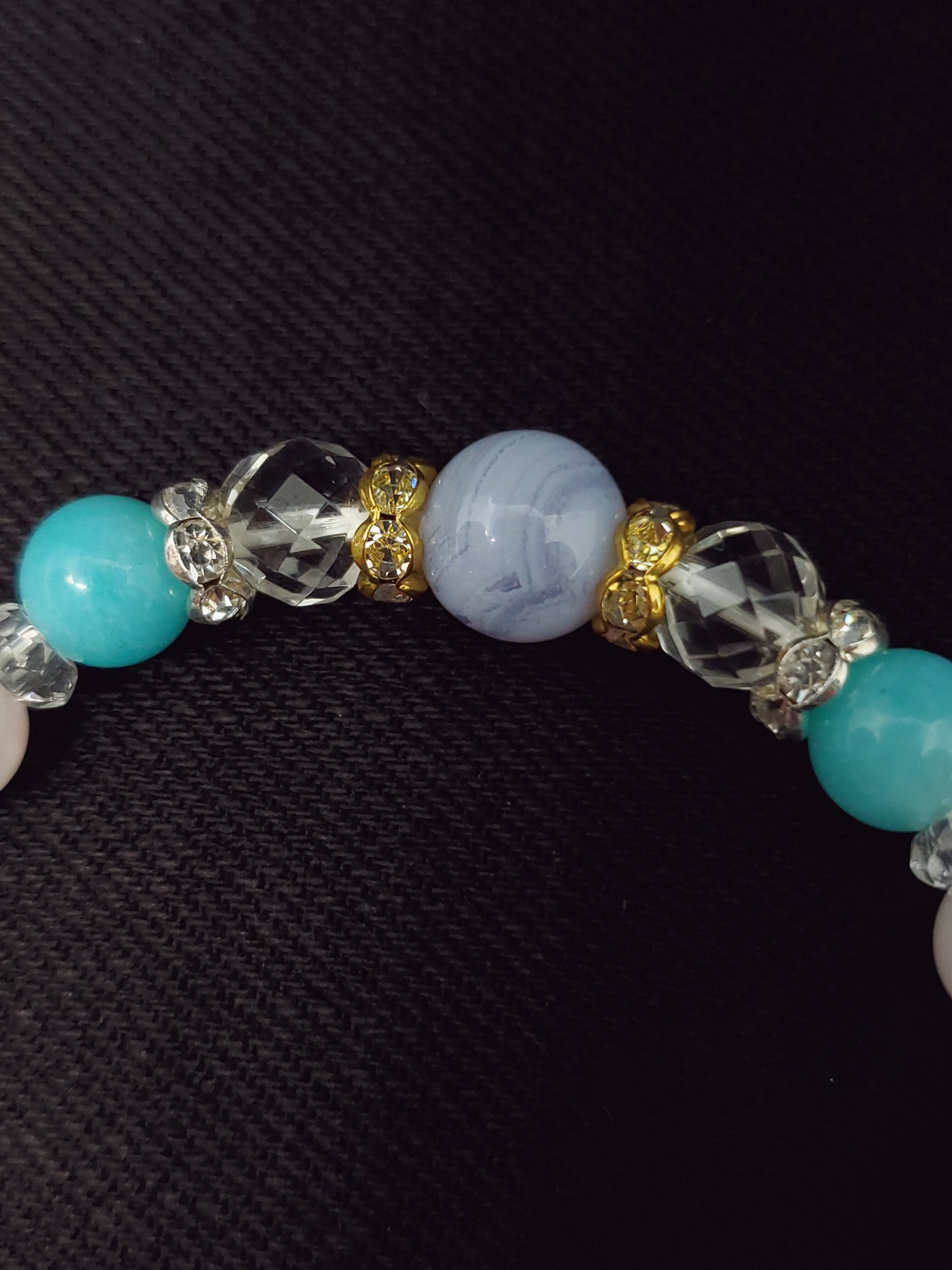 落ち着きのあるブルーレースアゲート、鮮やかな色合いのペルー産アマゾナイト、甘いローズクォーツのブレスレットです。