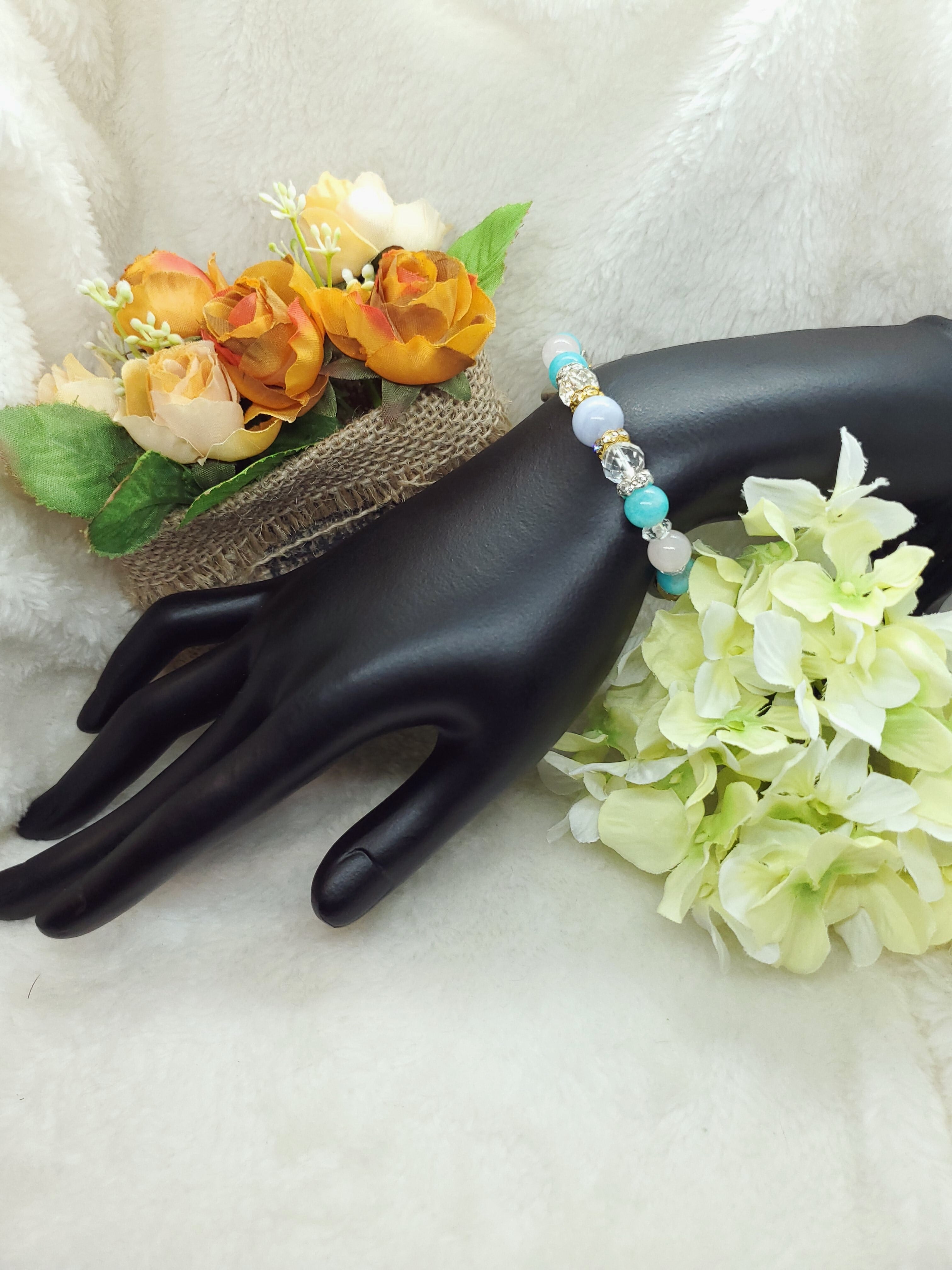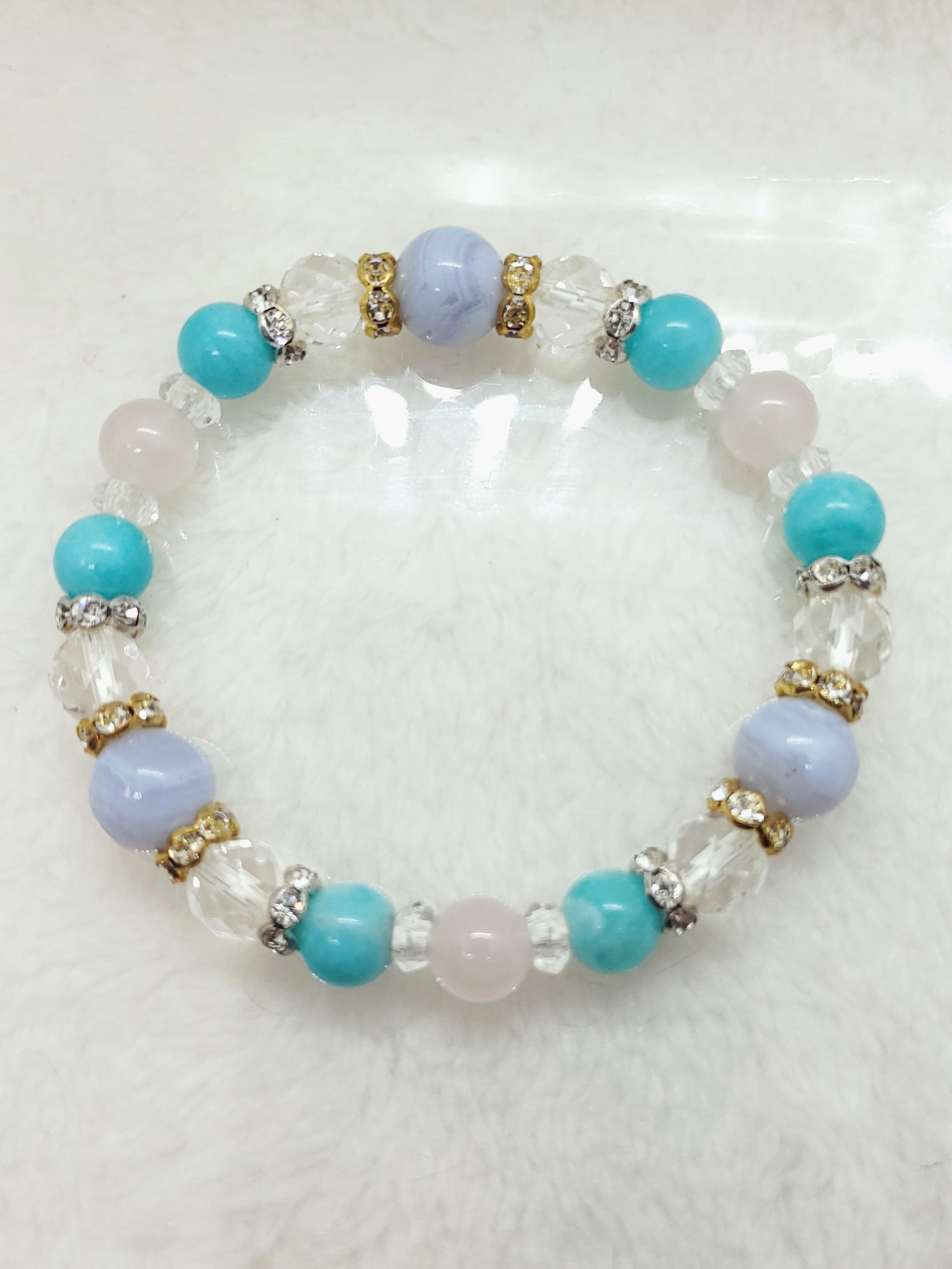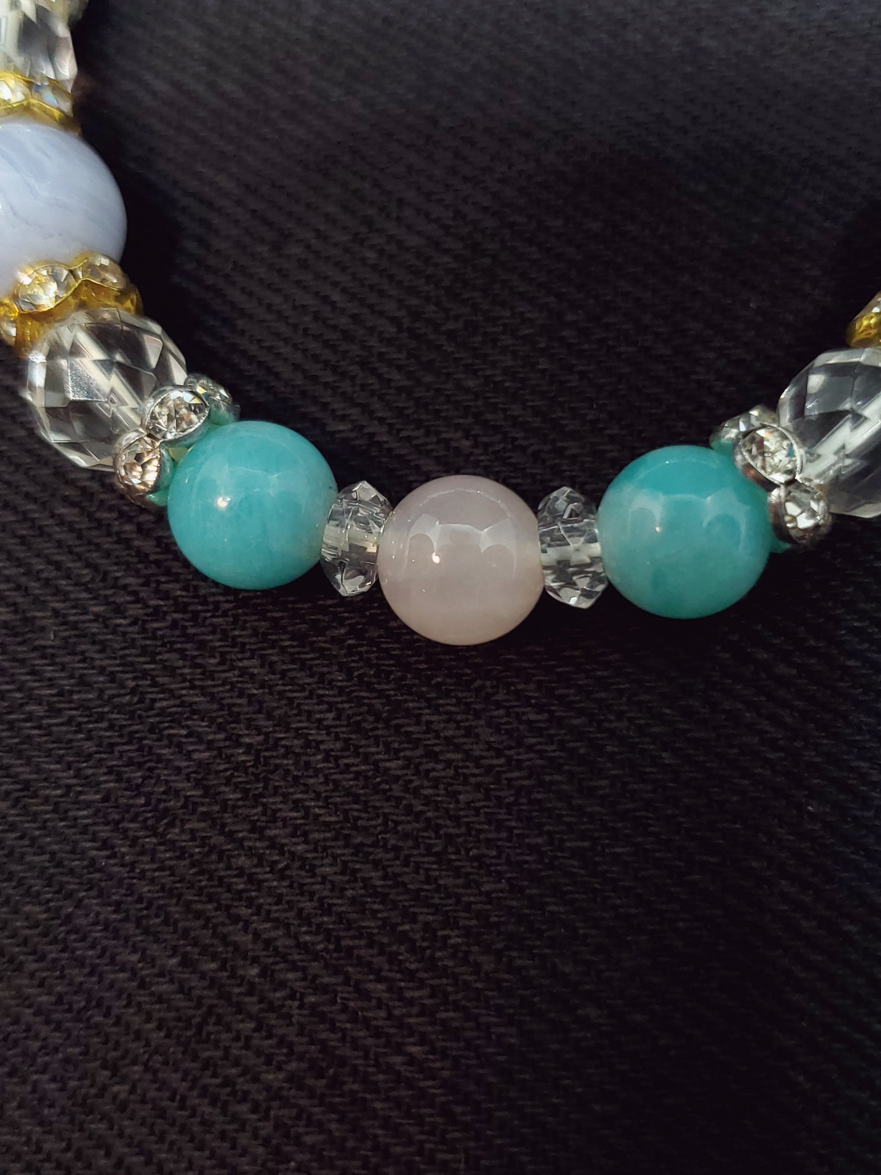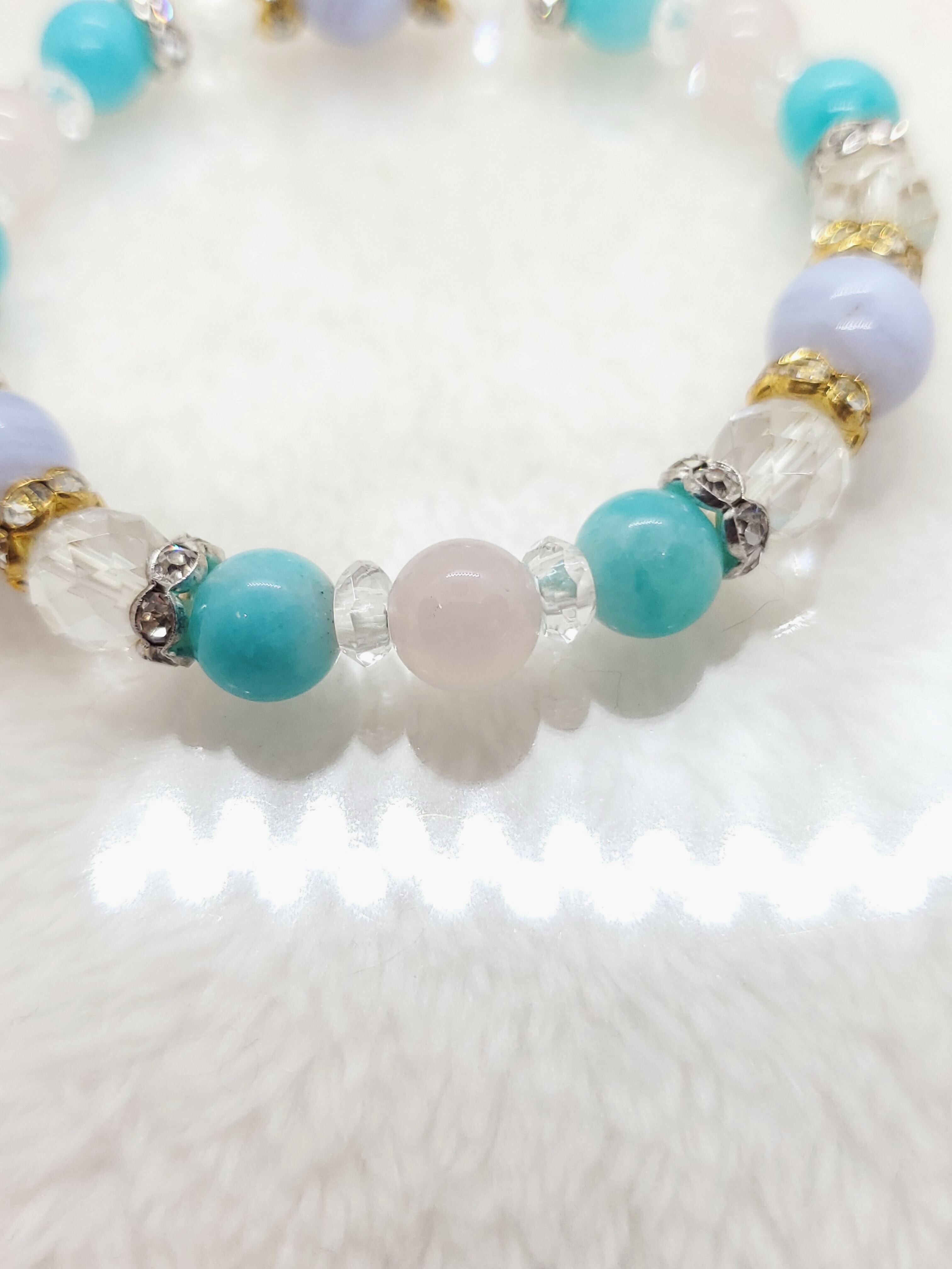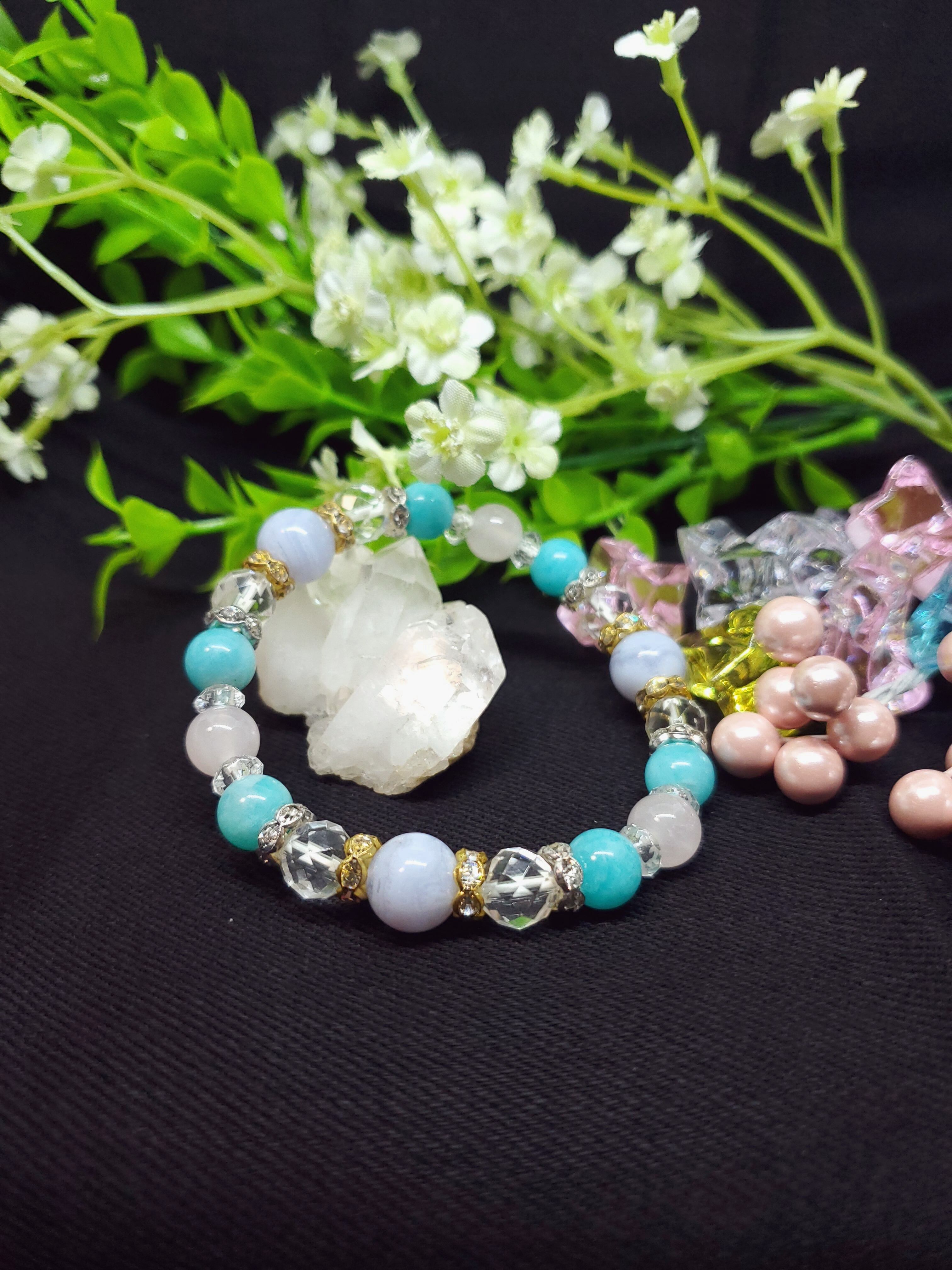 落ち着きのあるブルーレースアゲート、鮮やかな色合いのペルー産アマゾナイト、甘いローズクォーツのブレスレットです。