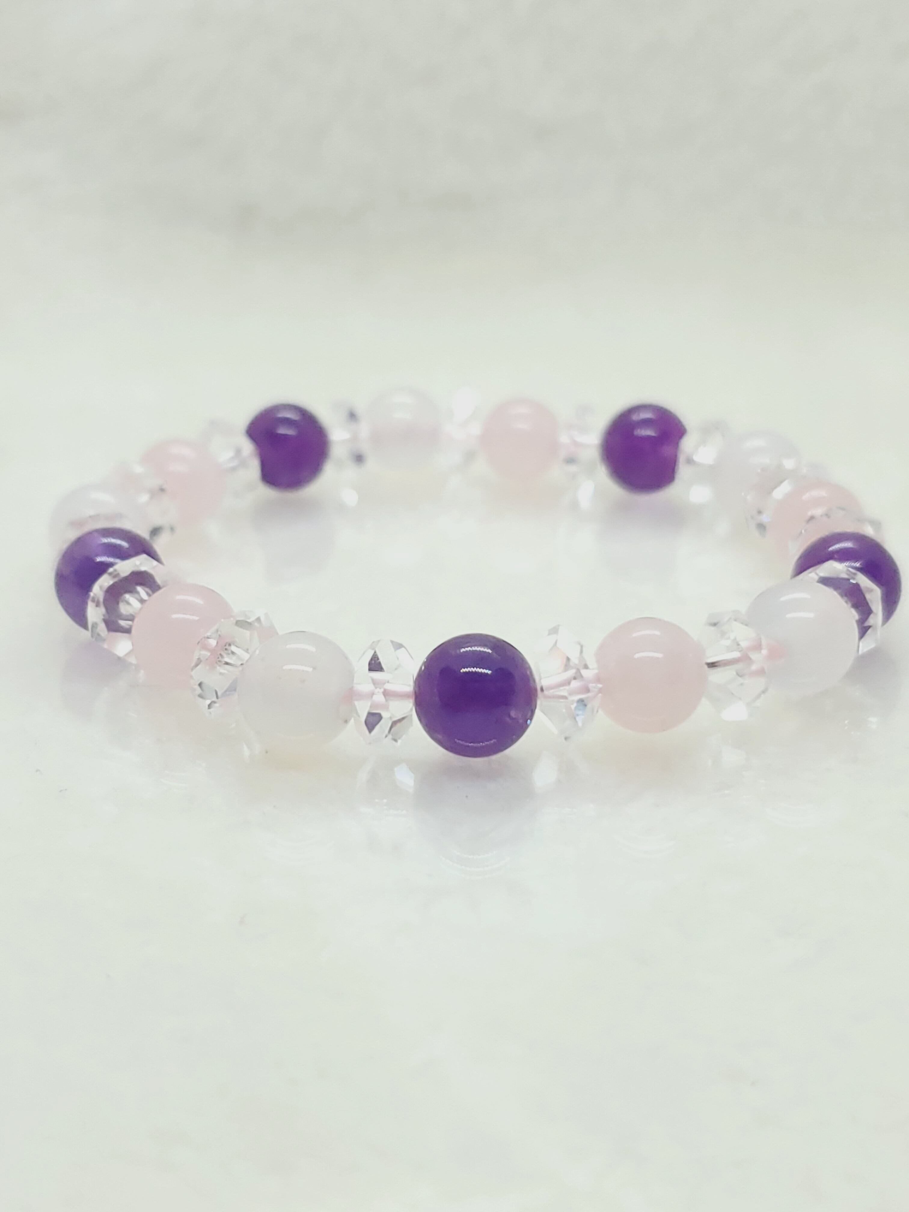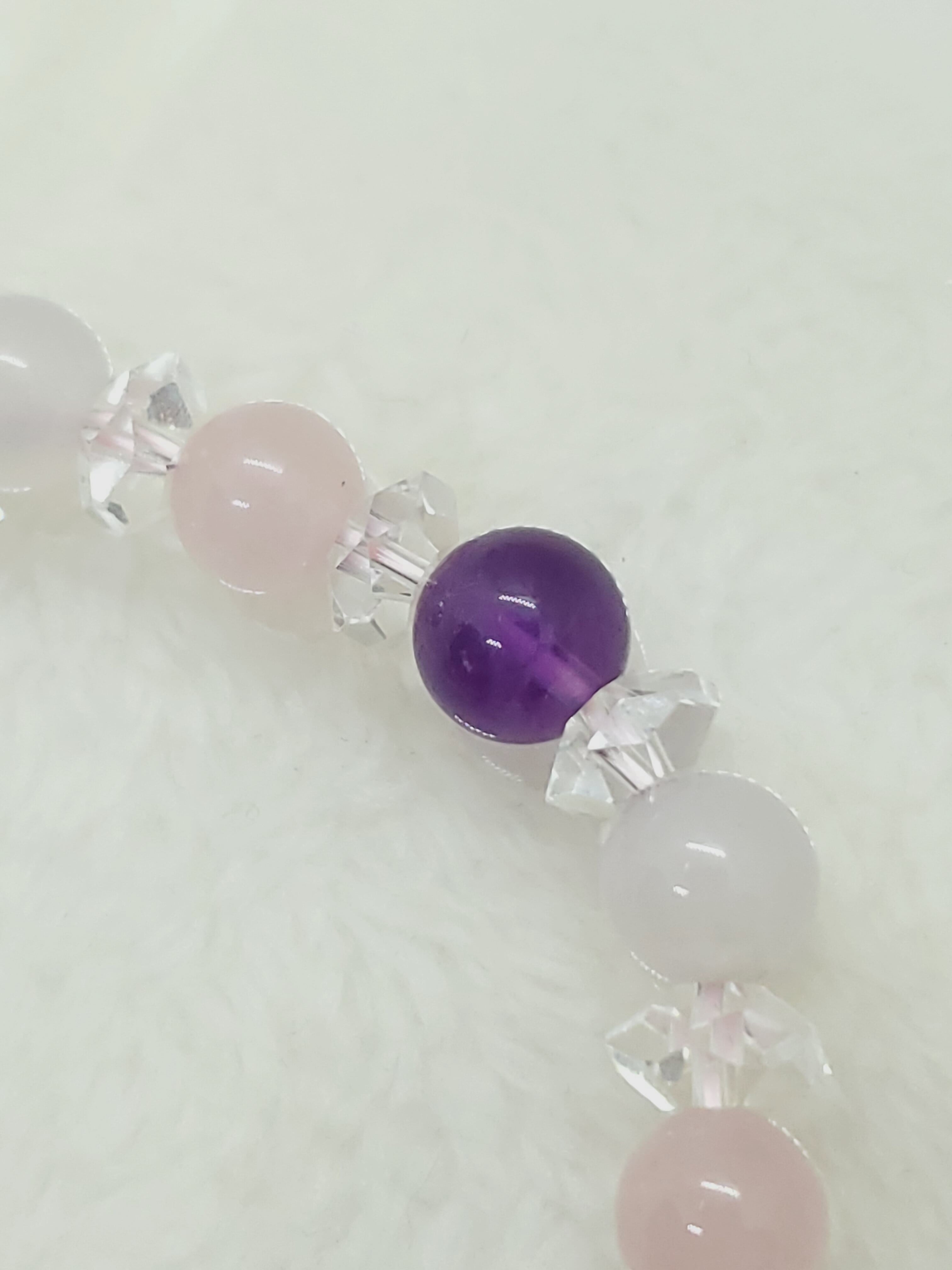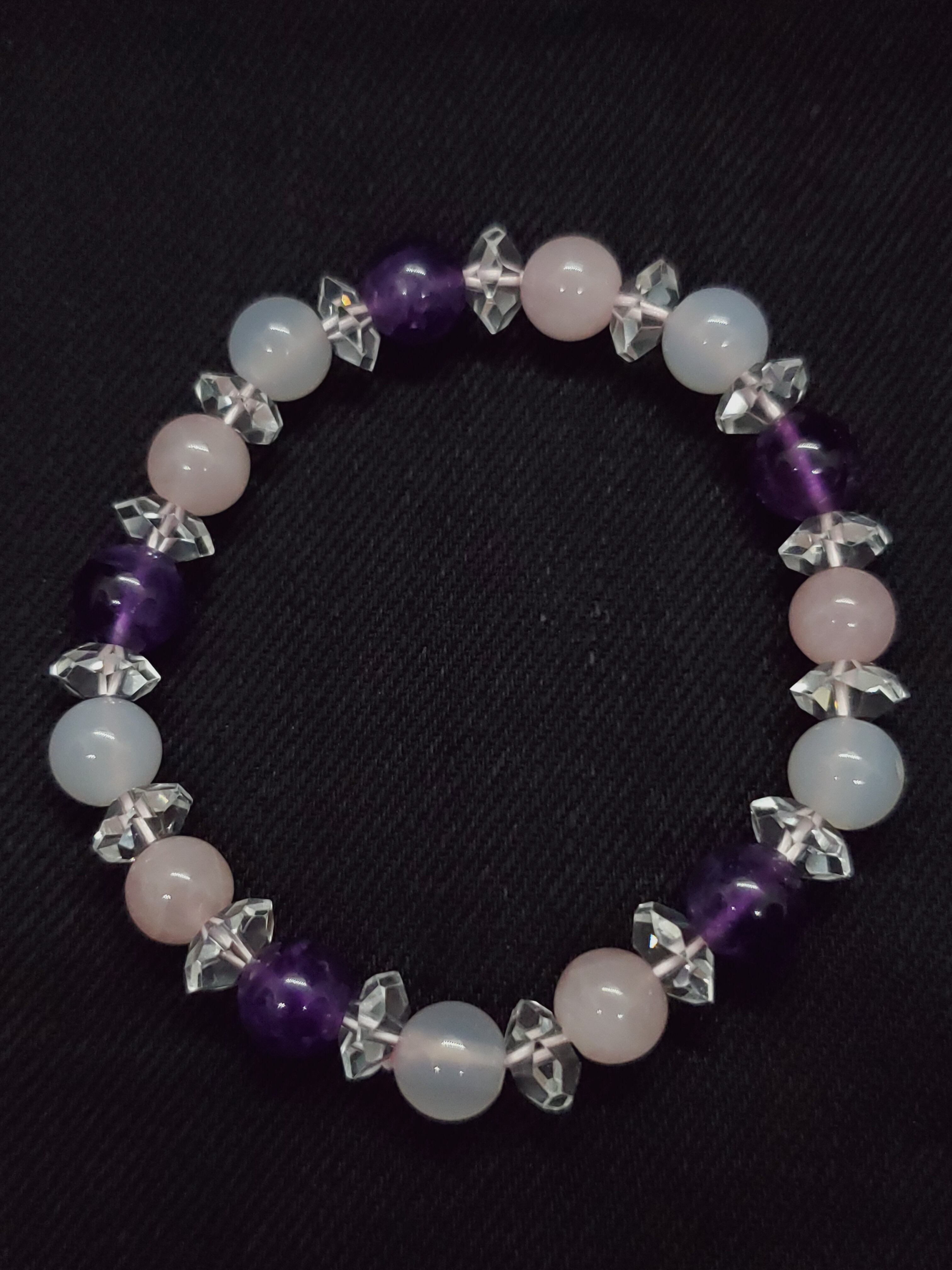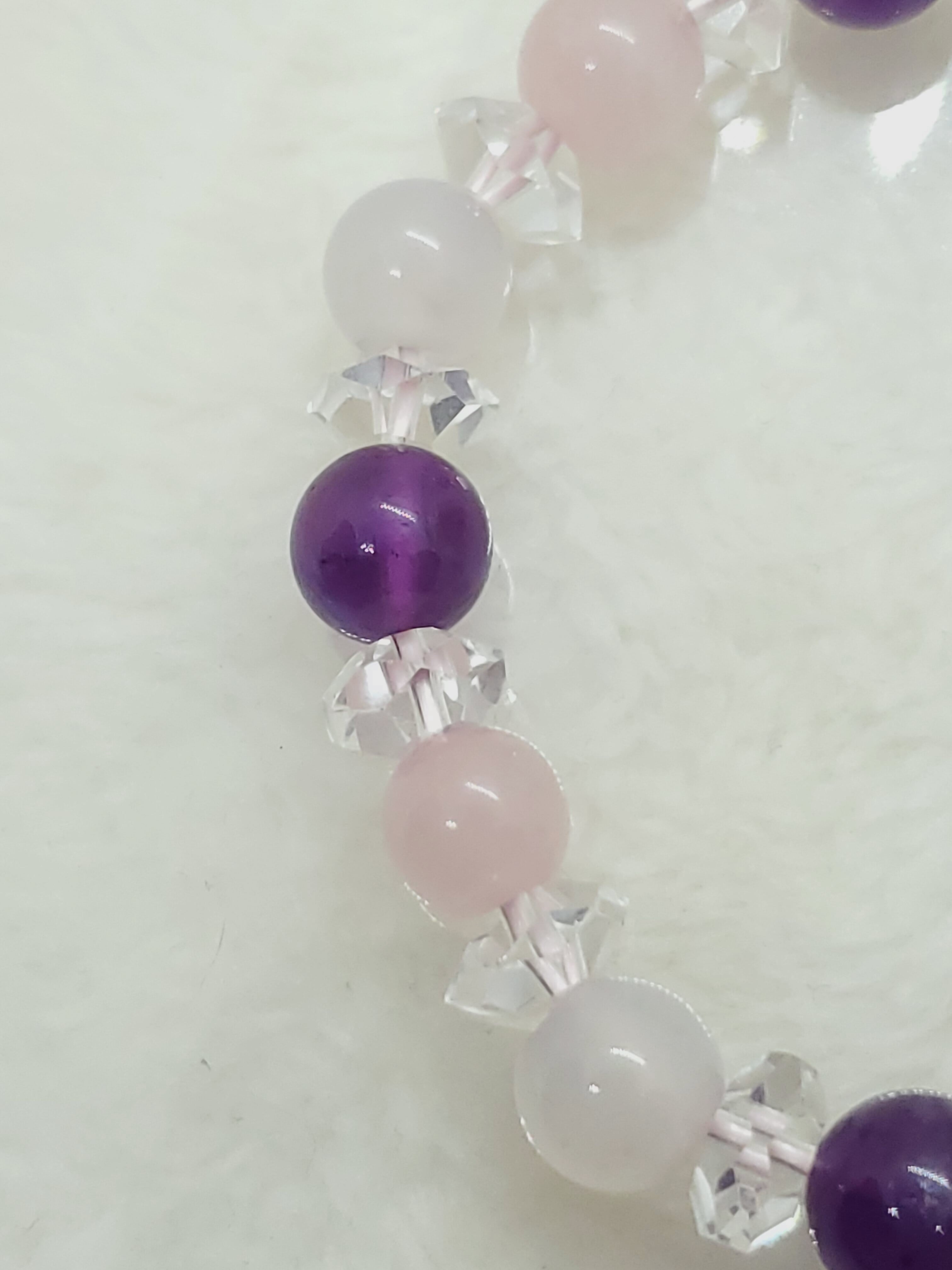 淡いピンク色のマダガスカル産ローズクォーツと、淡雪色の天然色ホワイトカルセドニー、深い神秘色のアメジストのブレスレットです