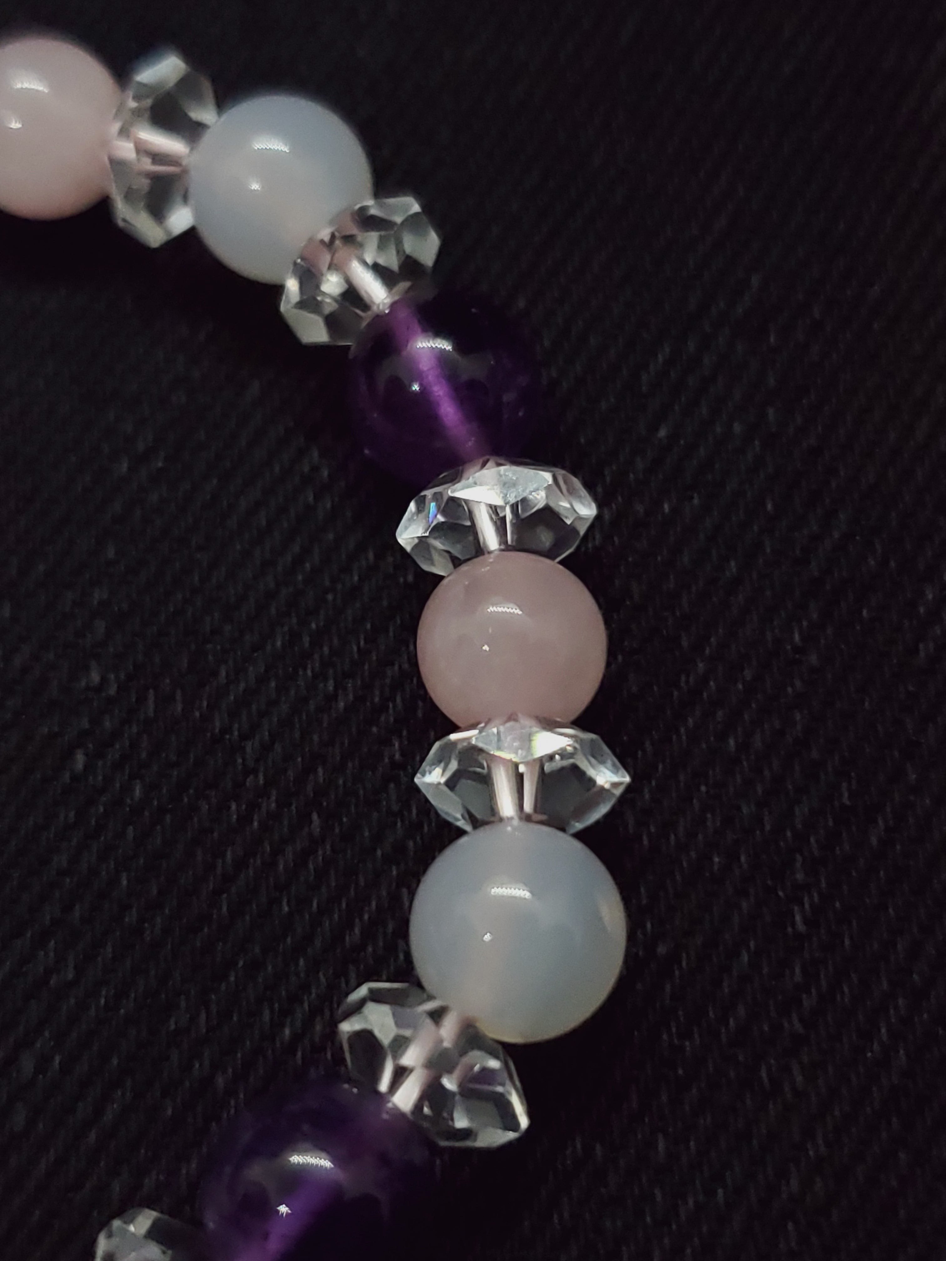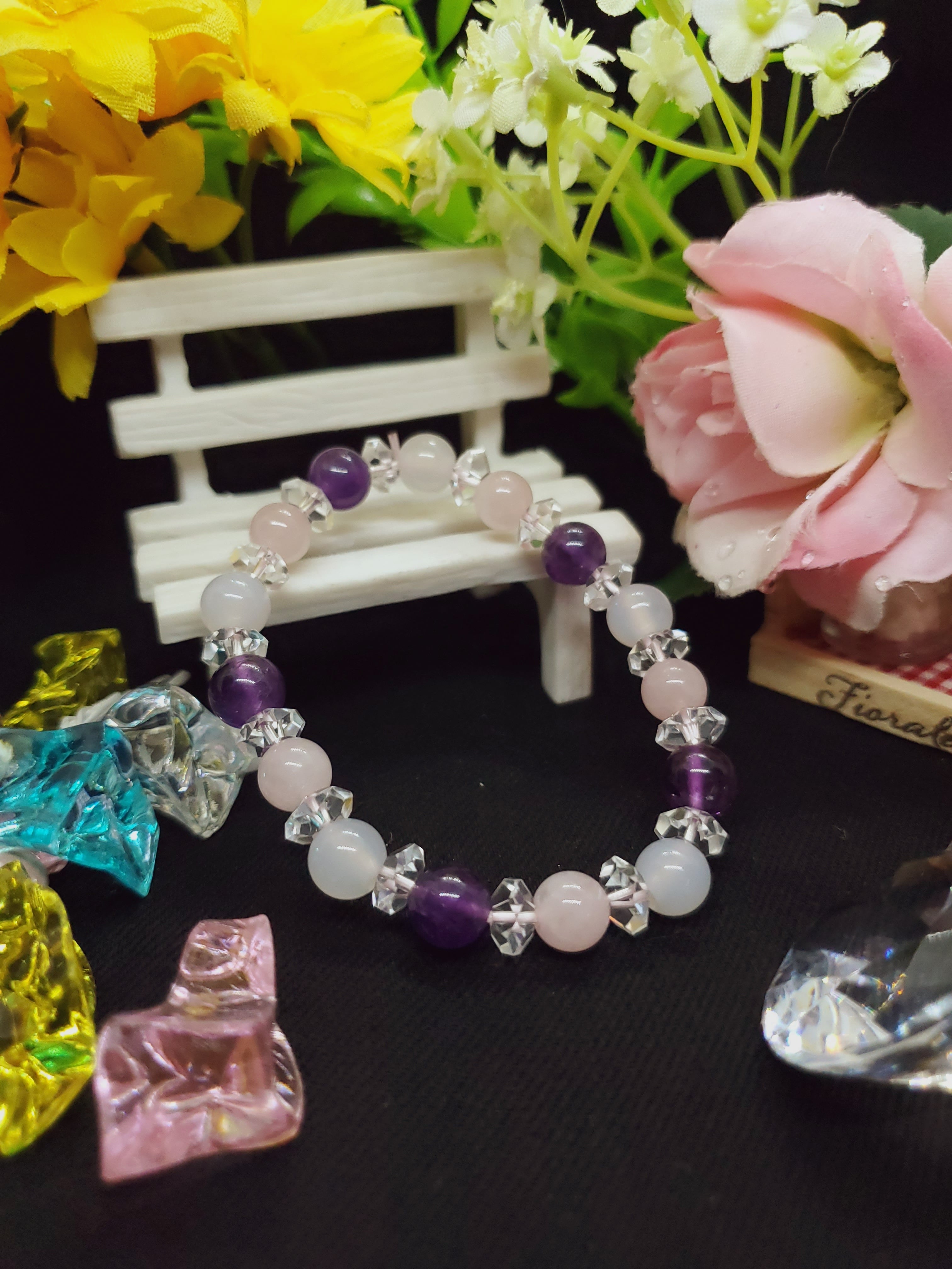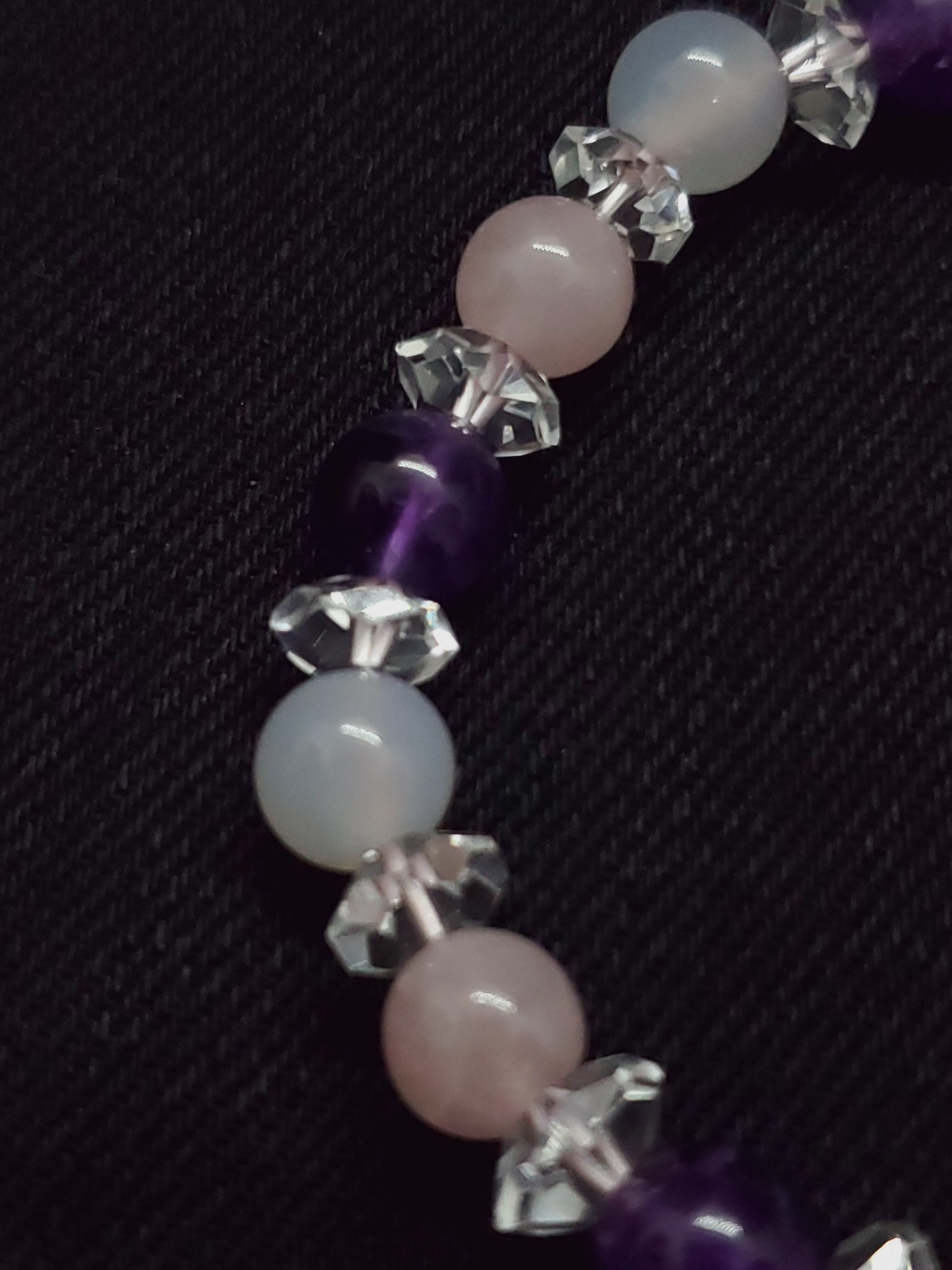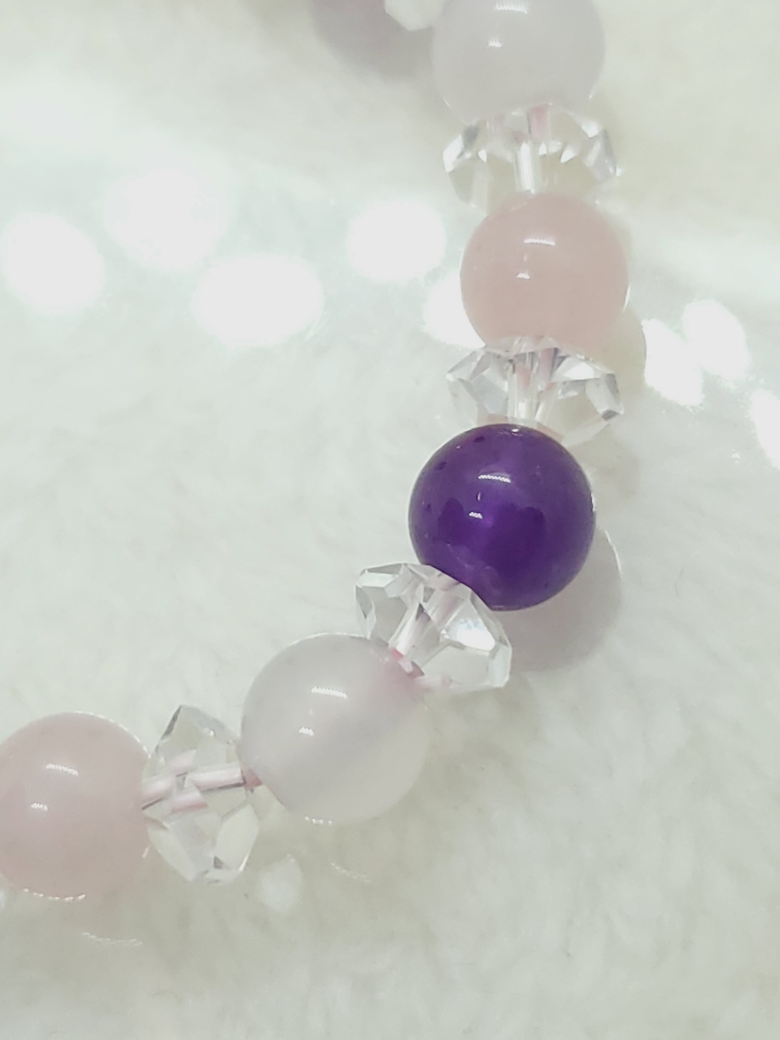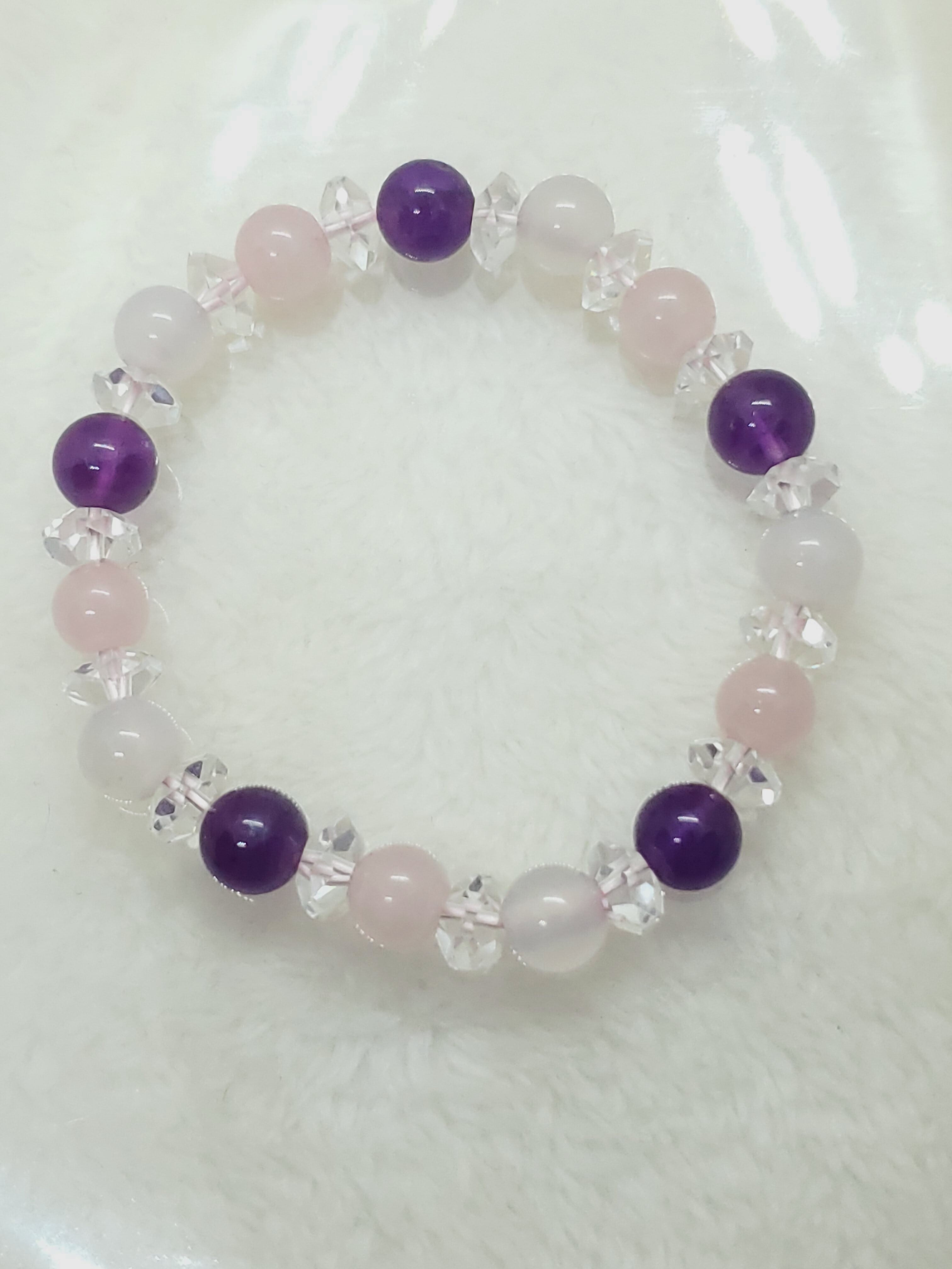 淡いピンク色のマダガスカル産ローズクォーツと、淡雪色の天然色ホワイトカルセドニー、深い神秘色のアメジストのブレスレットです
