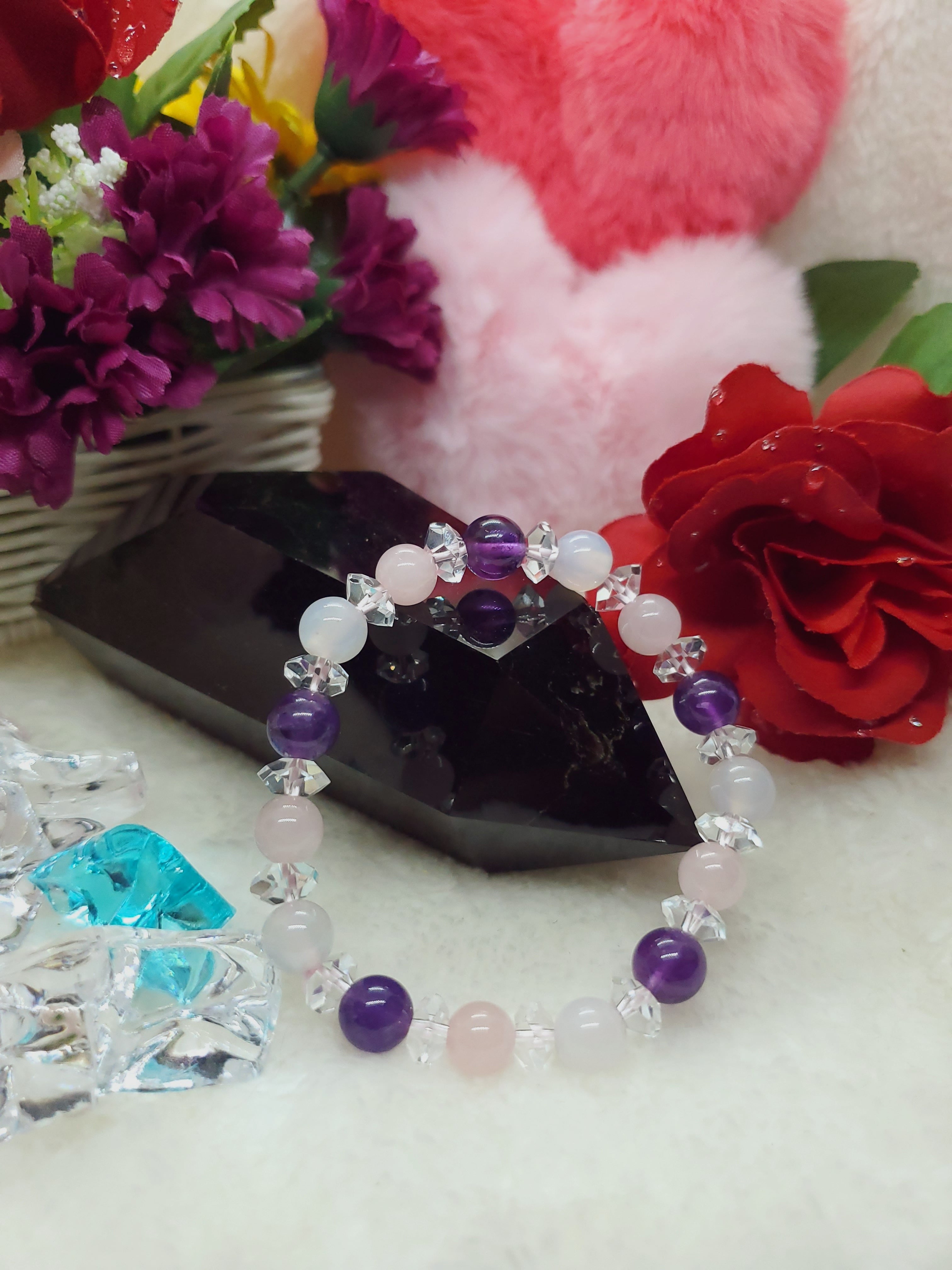 パワーストーン界でのカルセドニーは、社交性をアップさせてポジティブな気持ちになれるといわれています。アメジストは愛の守護、メンタル面を強化してくれますし、ローズクォーツも愛情、ヒーリングと恋愛のお守りとして最高の組み合わせです